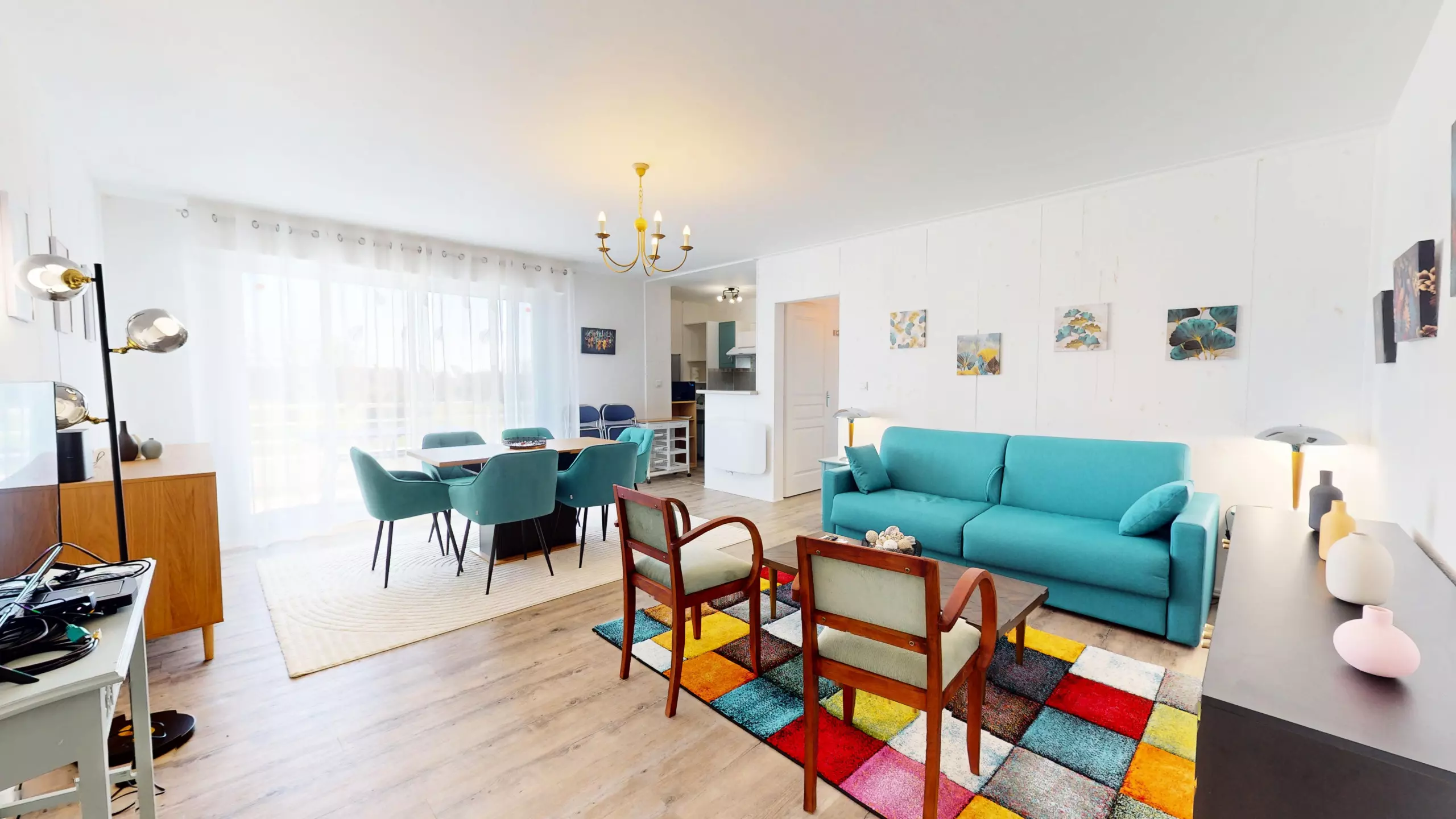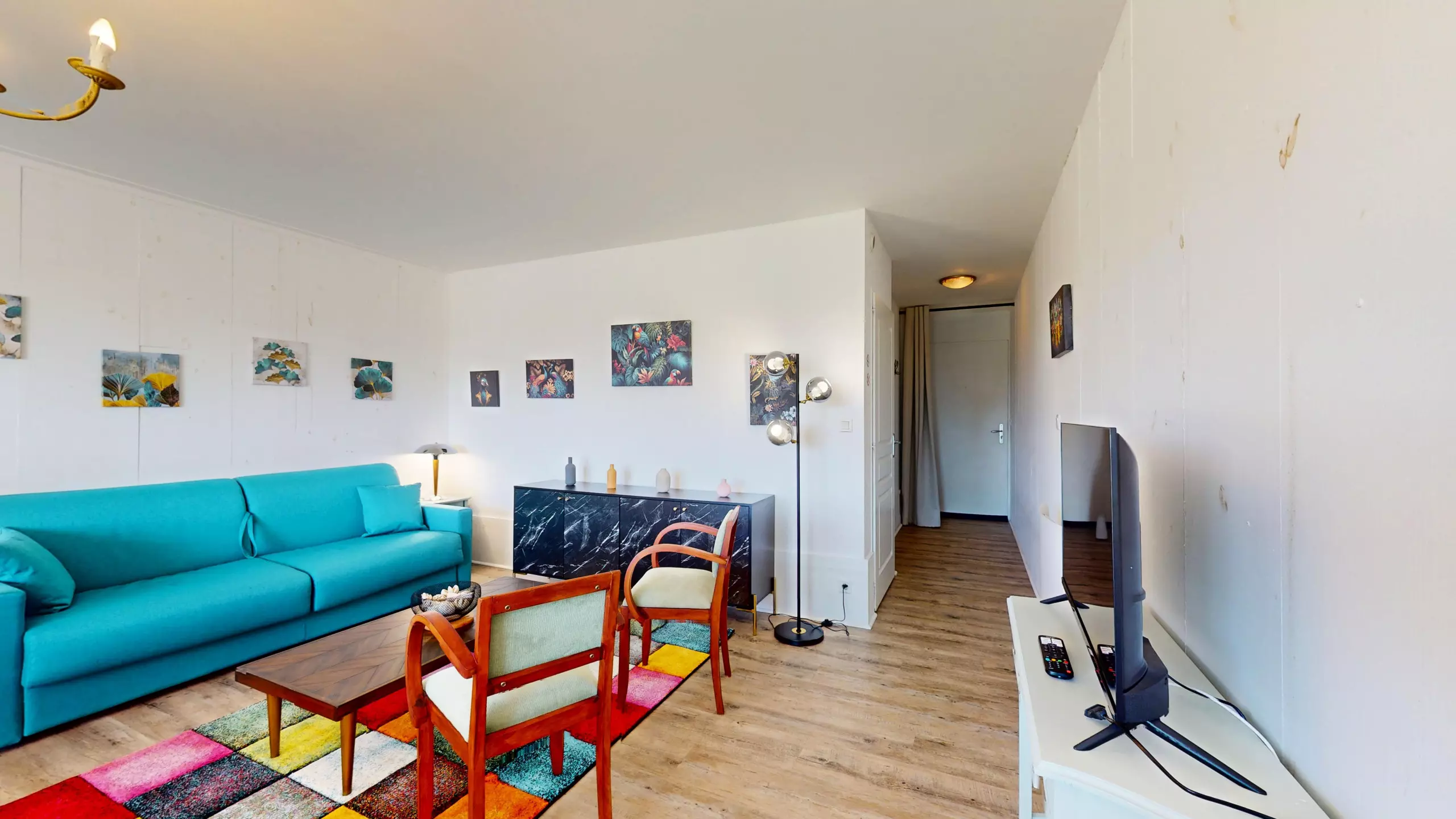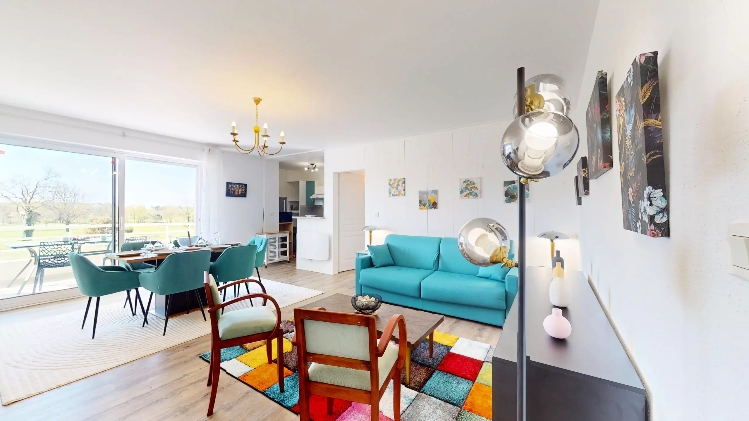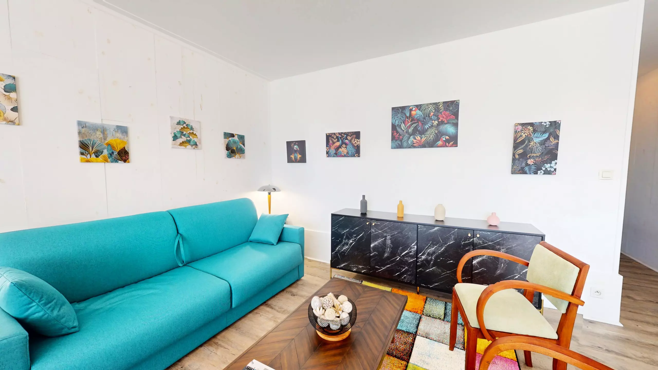 - A comfortable living room with sofa bed, opening onto a large furnished balcony facing the green and the swimming pool.