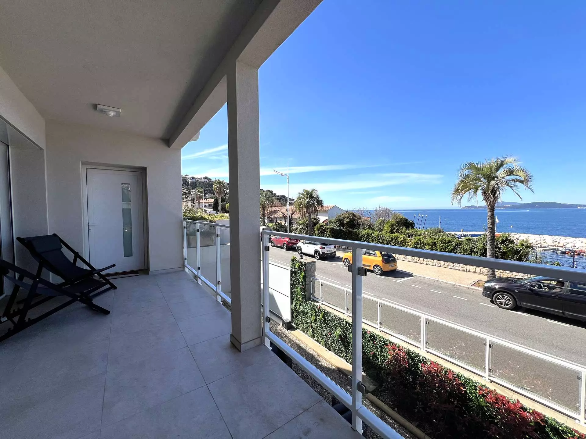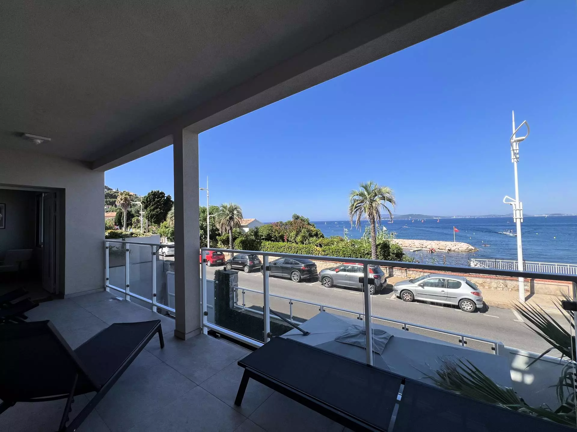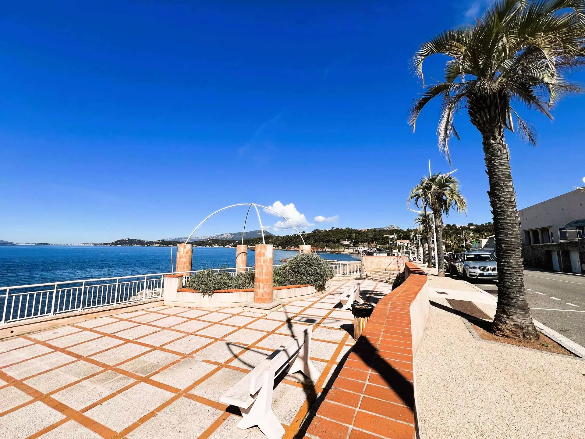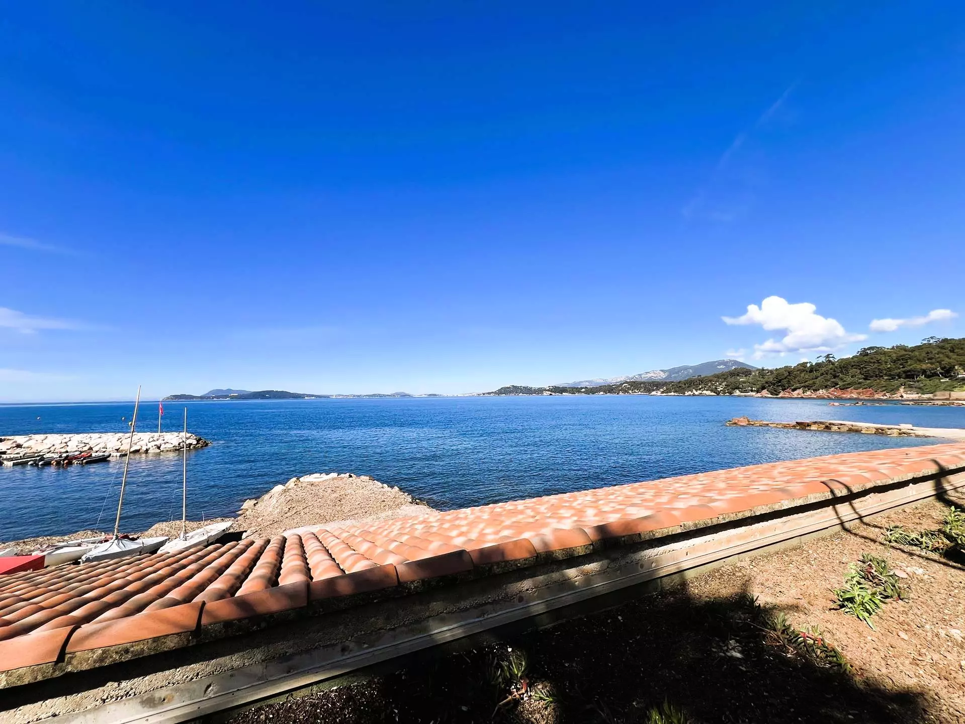 Facing the crystal-clear waters of the Mediterranean, just steps from the golden sands of Garonne Beach, this bright apartment invites you to enjoy a waterfront getaway. Nestled in a privileged setting between the Port de l'Oursinière and Cap Garonne, it offers an idyllic setting where the blue sky blends into the sea's horizon.
