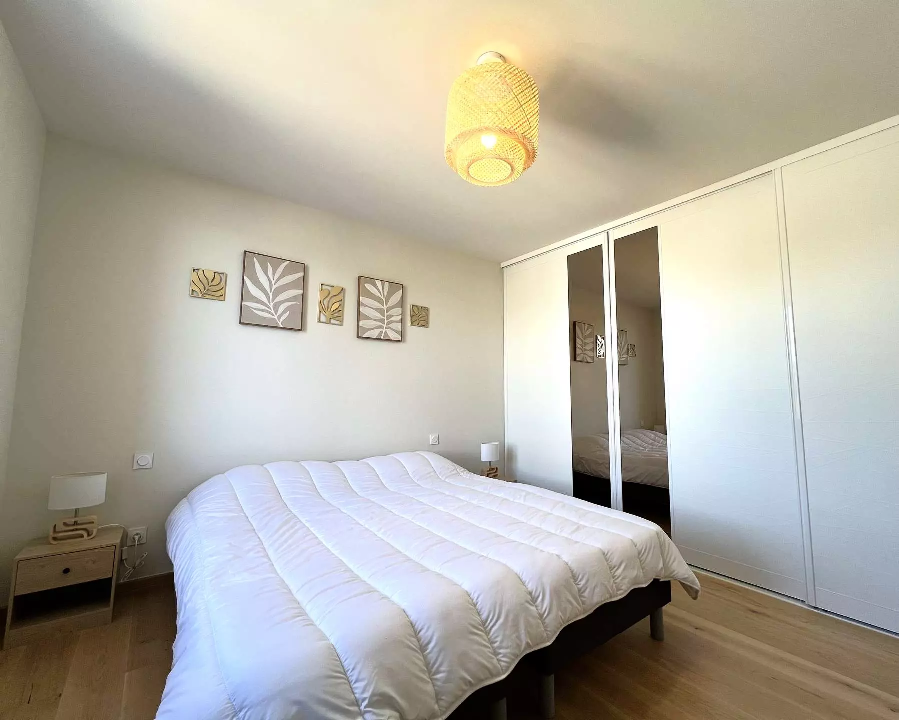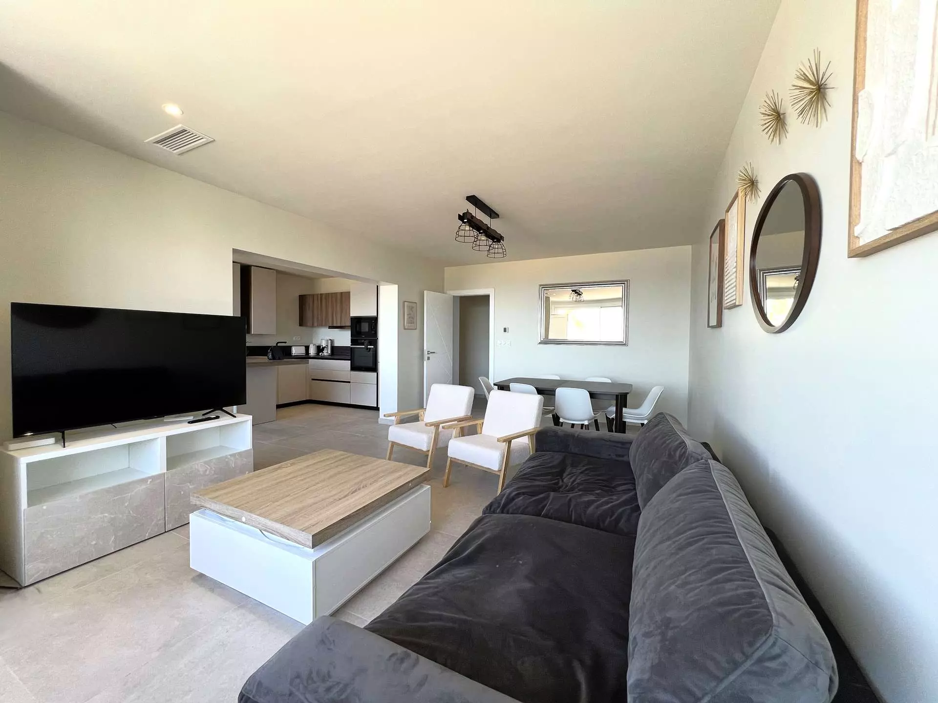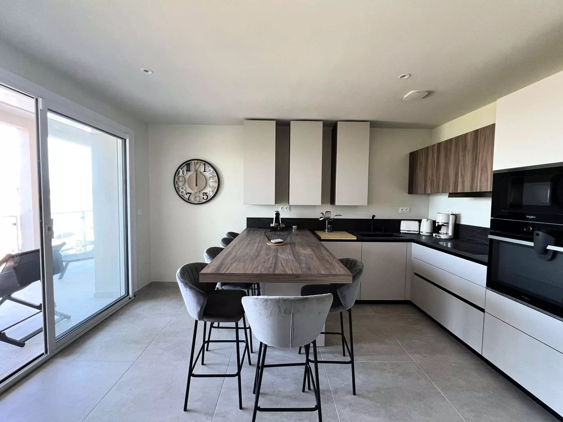 A light-filled living-dining room, this apartment opens onto a beautiful terrace offering panoramic views of the sea and the Garonne beach. An ideal setting for enjoying your meals overlooking the blue of the Mediterranean or simply enjoying a moment of relaxation while admiring the horizon.