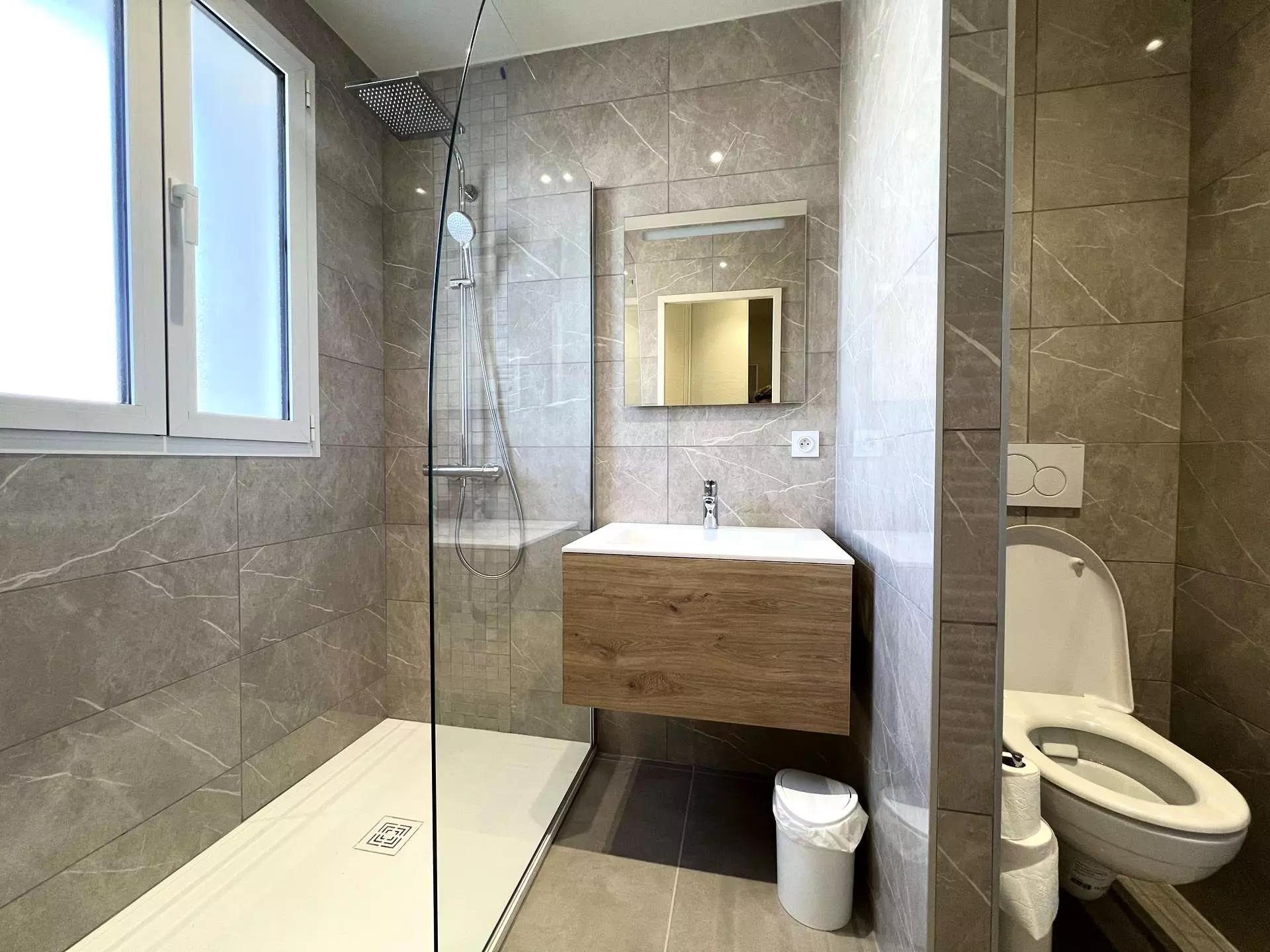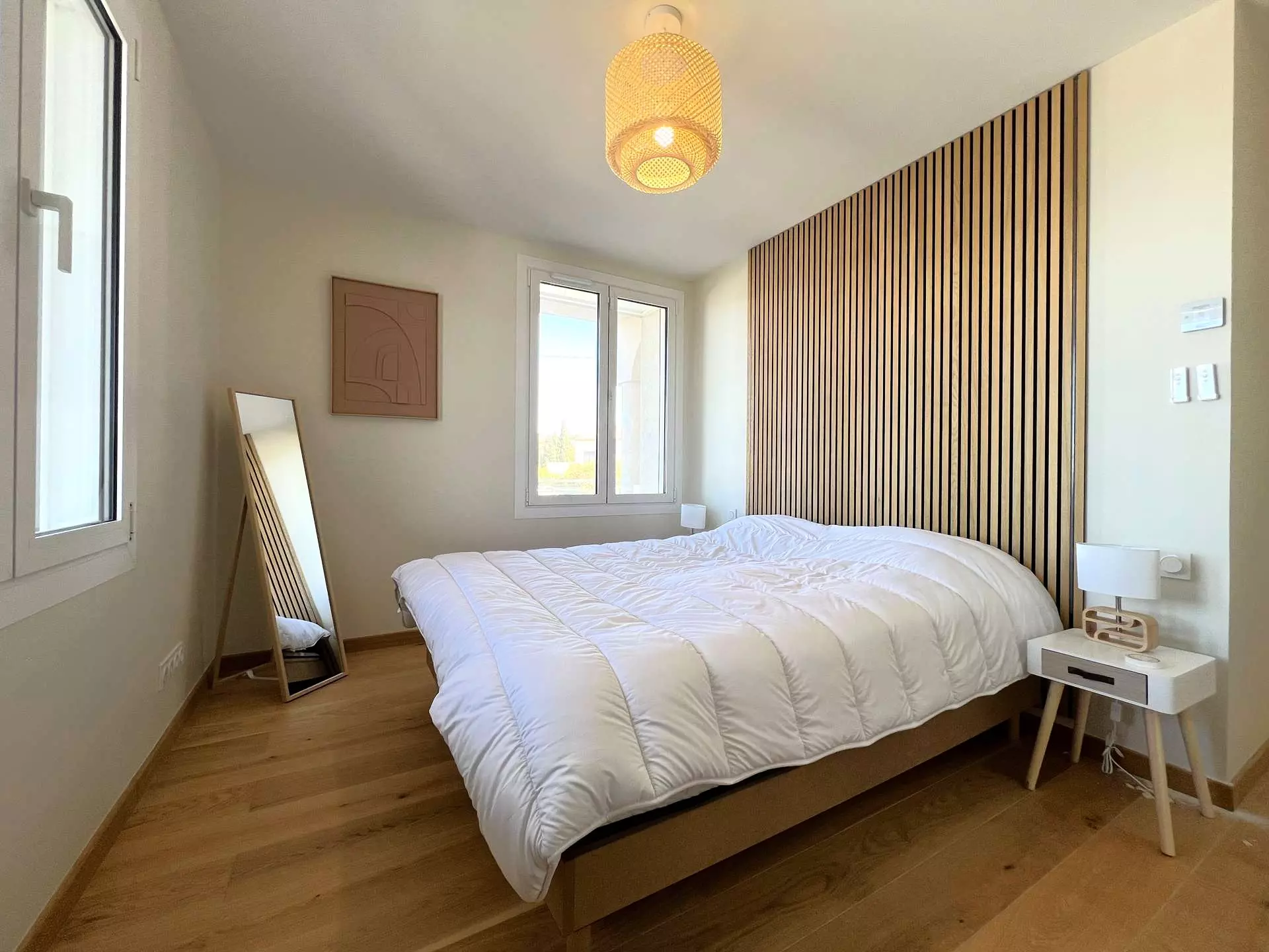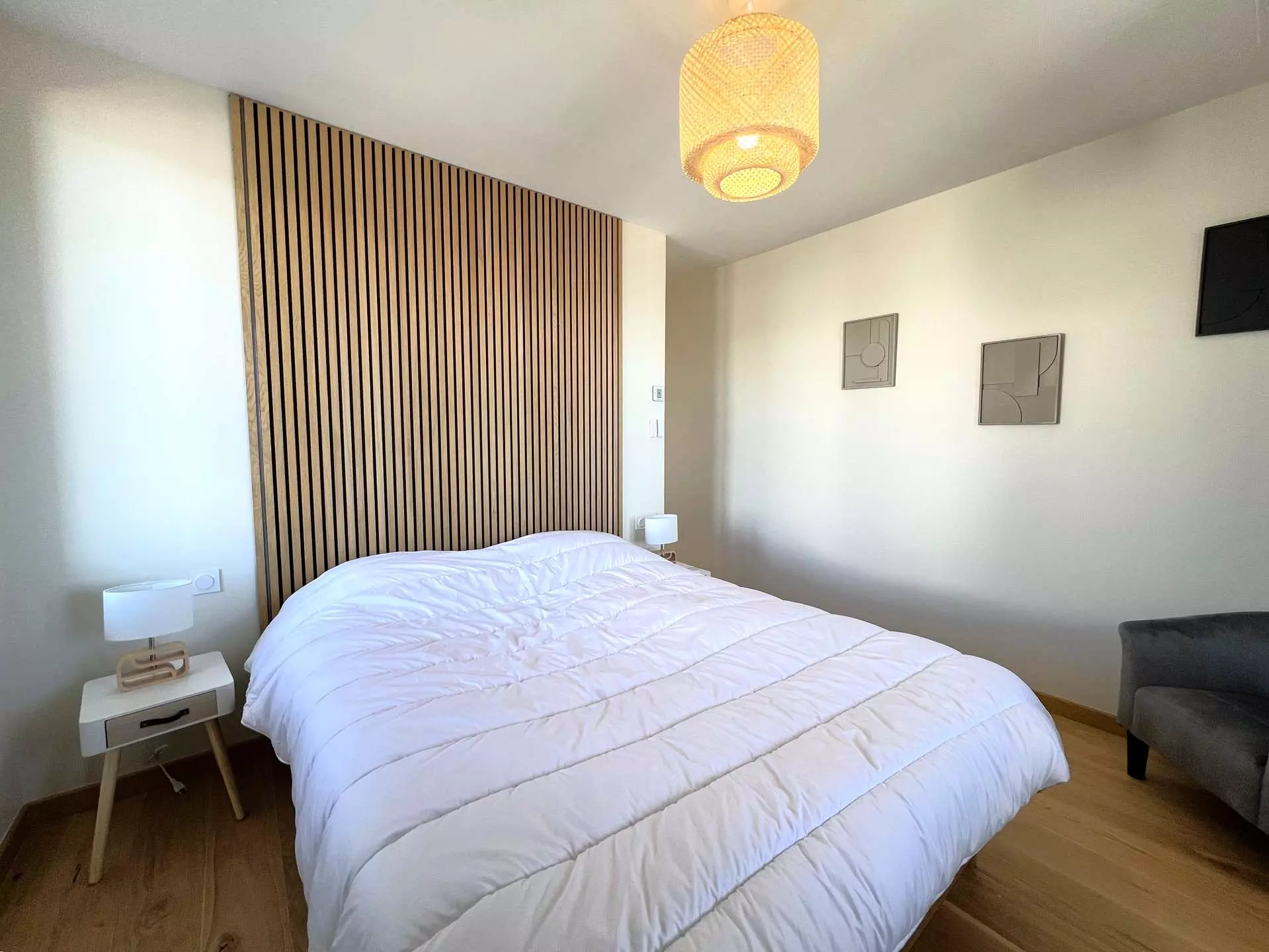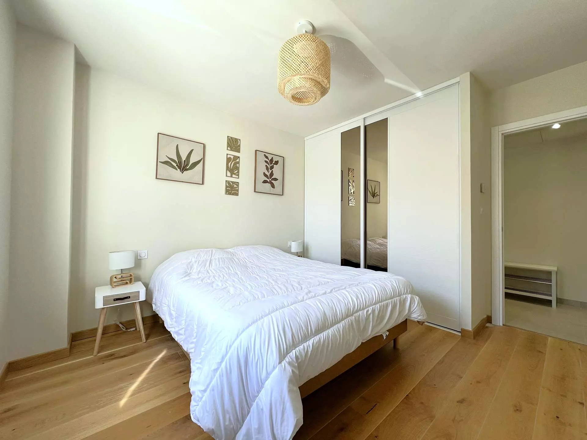 A light-filled living-dining room, this apartment opens onto a beautiful terrace offering panoramic views of the sea and the Garonne beach. An ideal setting for enjoying your meals overlooking the blue of the Mediterranean or simply enjoying a moment of relaxation while admiring the horizon.