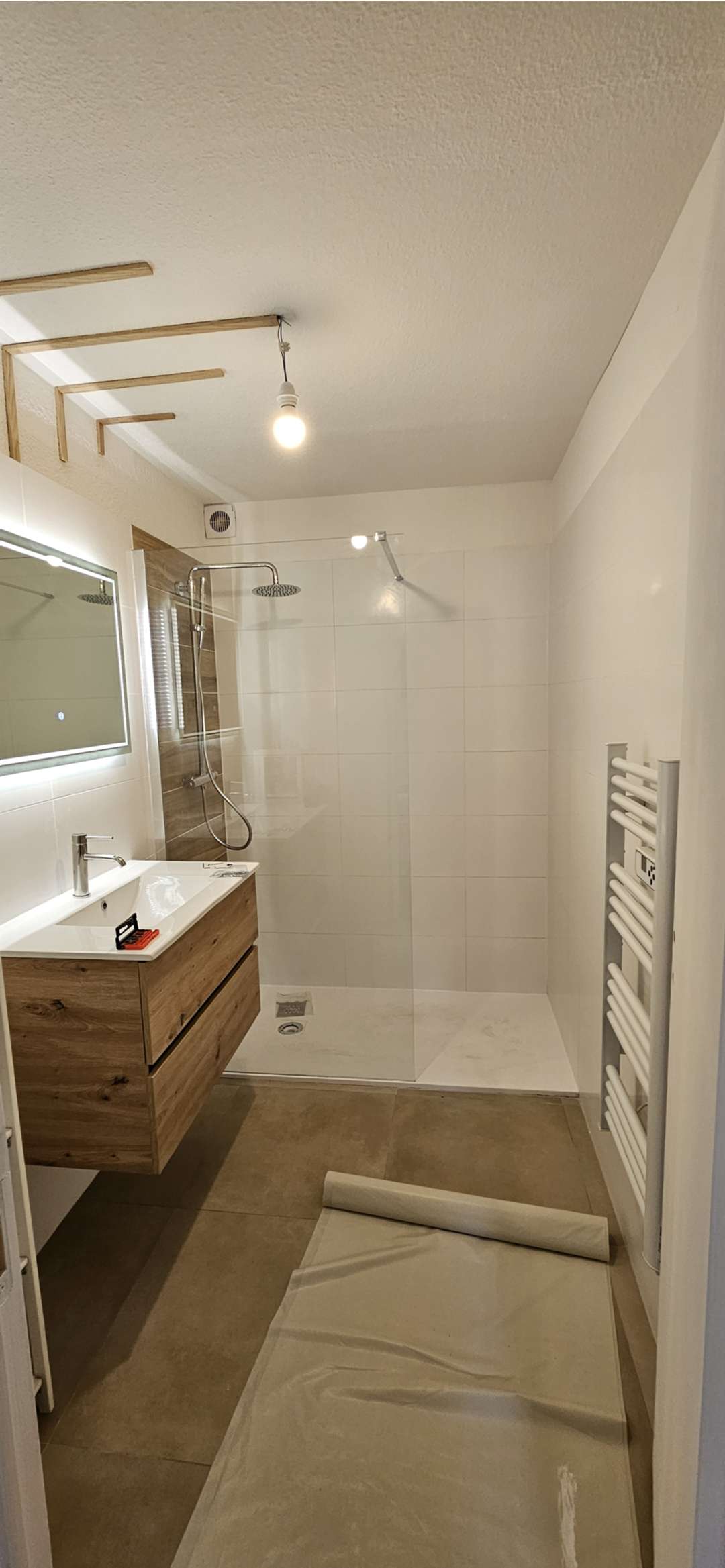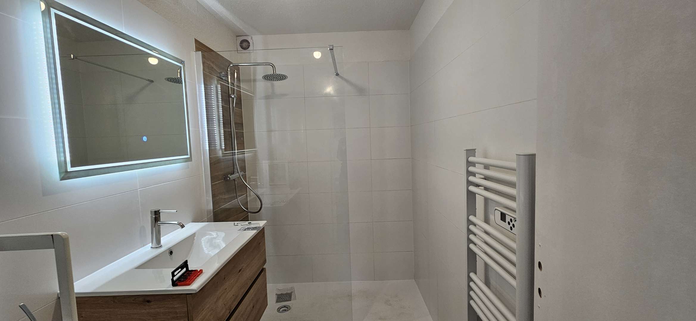 Bathroom: walk-in shower, washbasin, WC, heated towel rail
