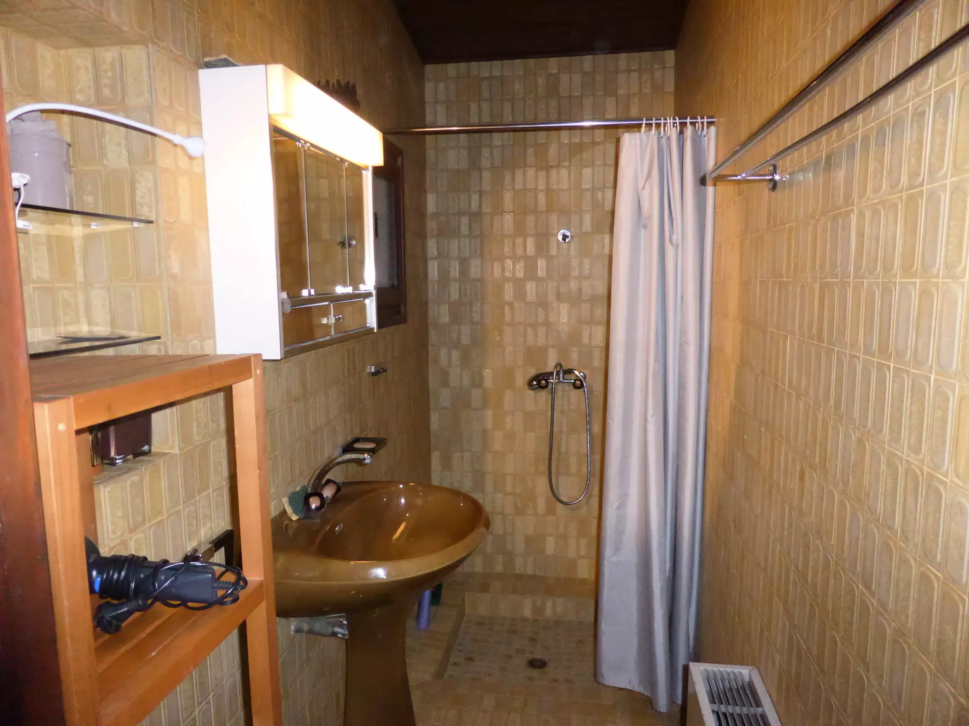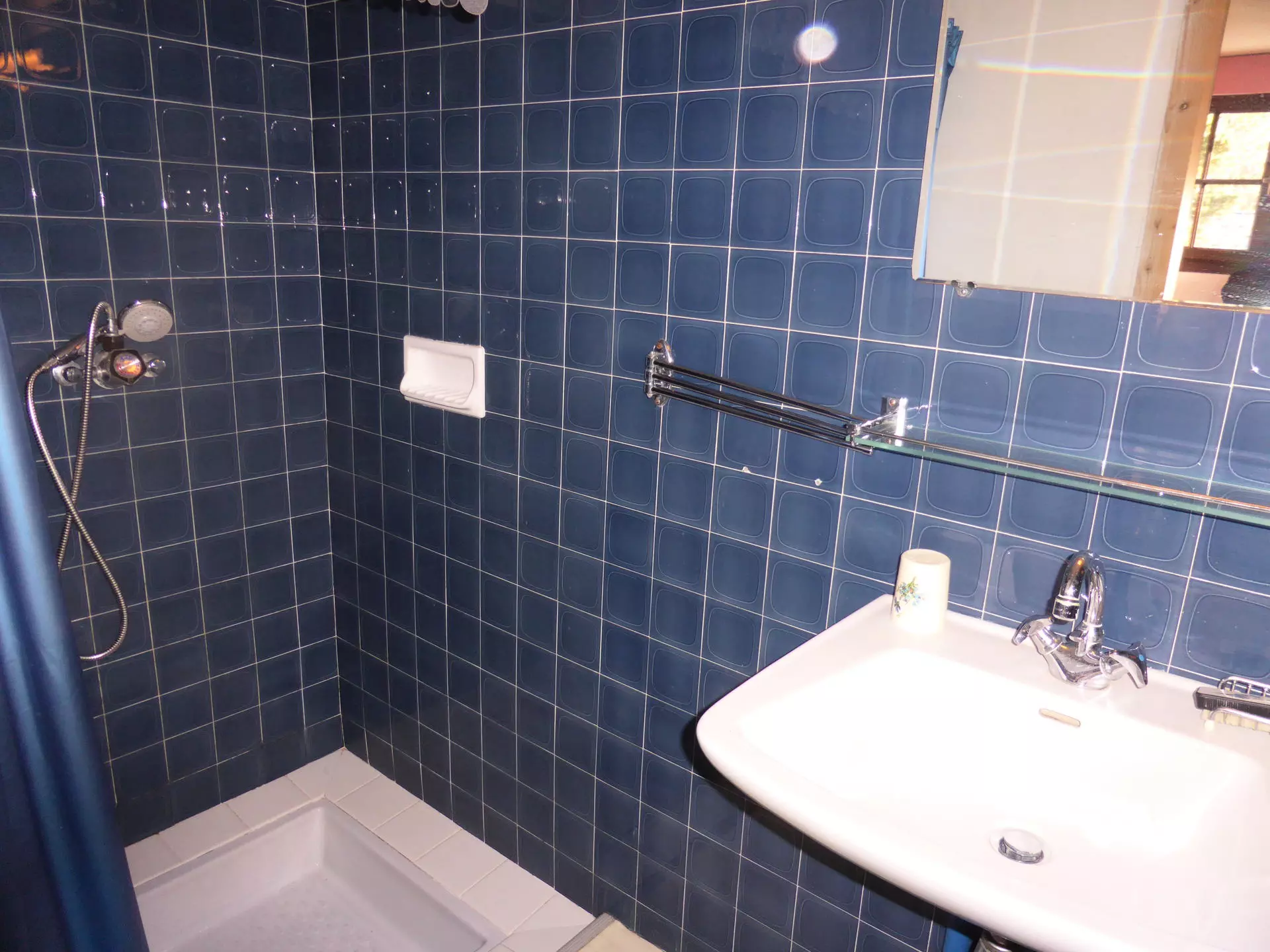 - A shower room with shower and sink.