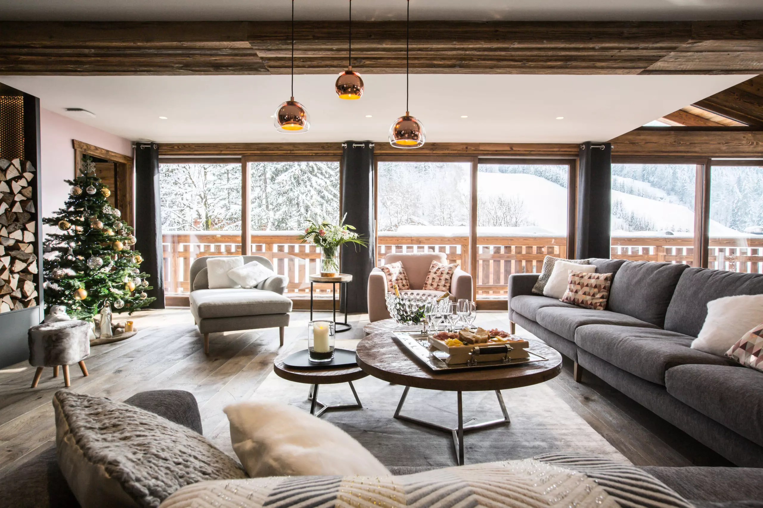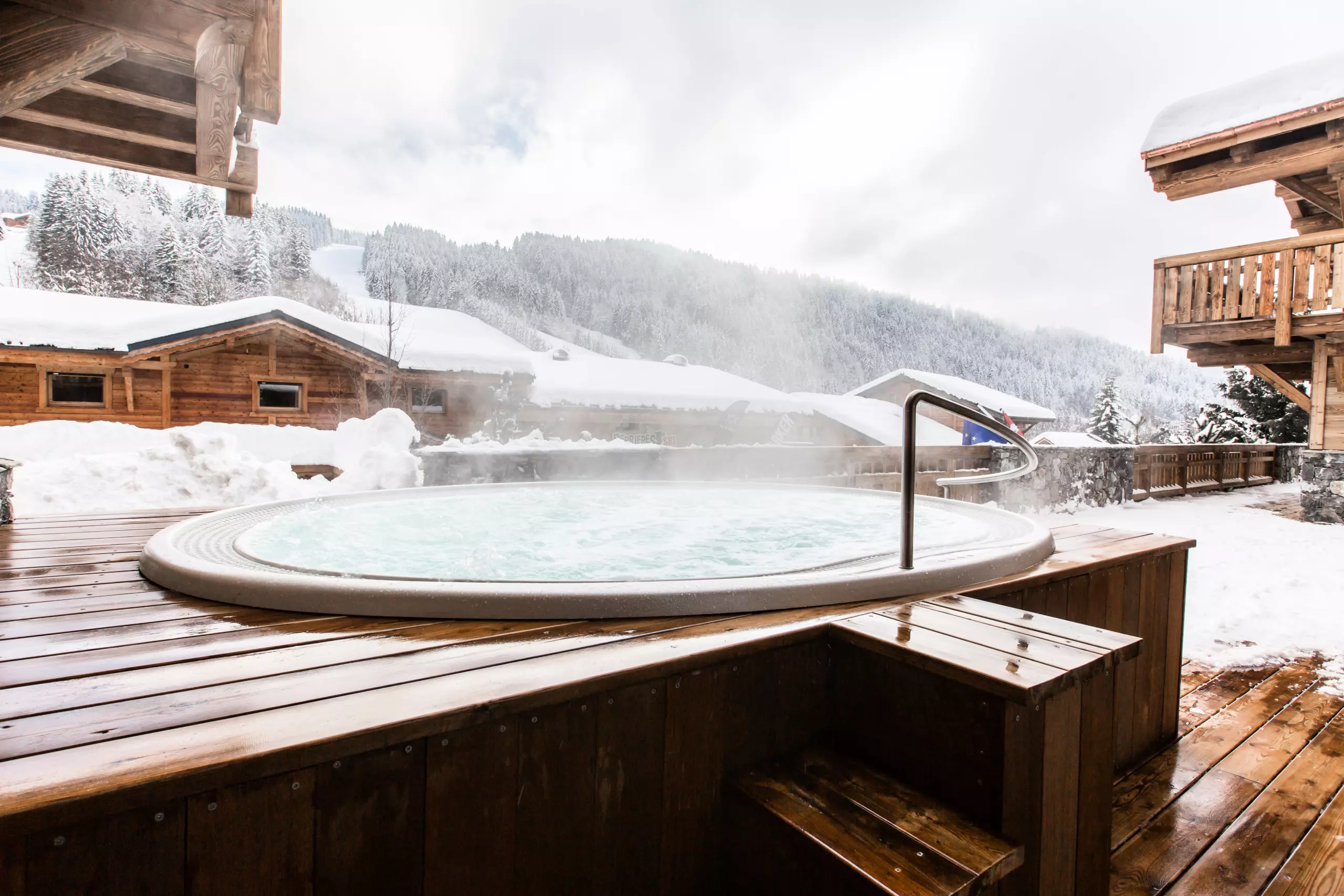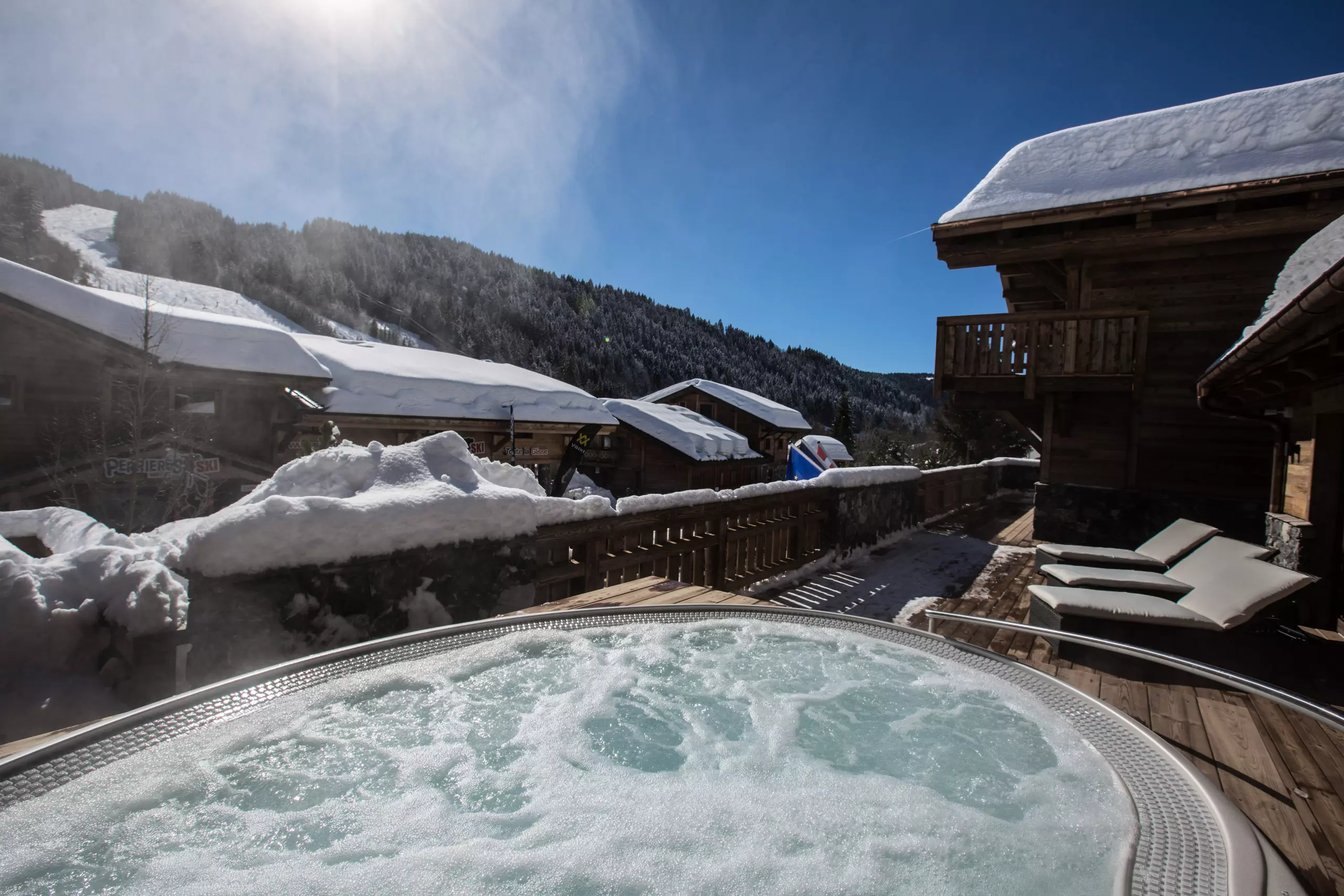 A large outdoor terrace including a 12-seater jacuzzi, a gas barbecue, a lounge area as well as deckchairs are available for you to fully enjoy the space outside the chalet.