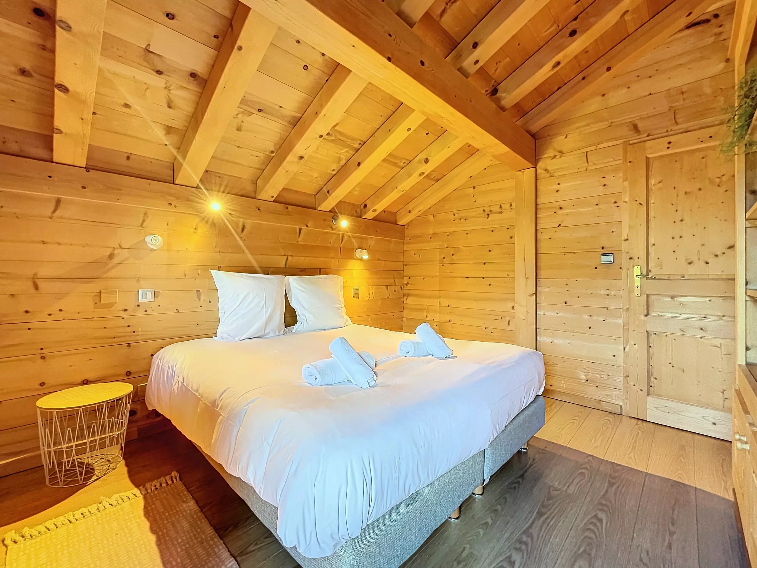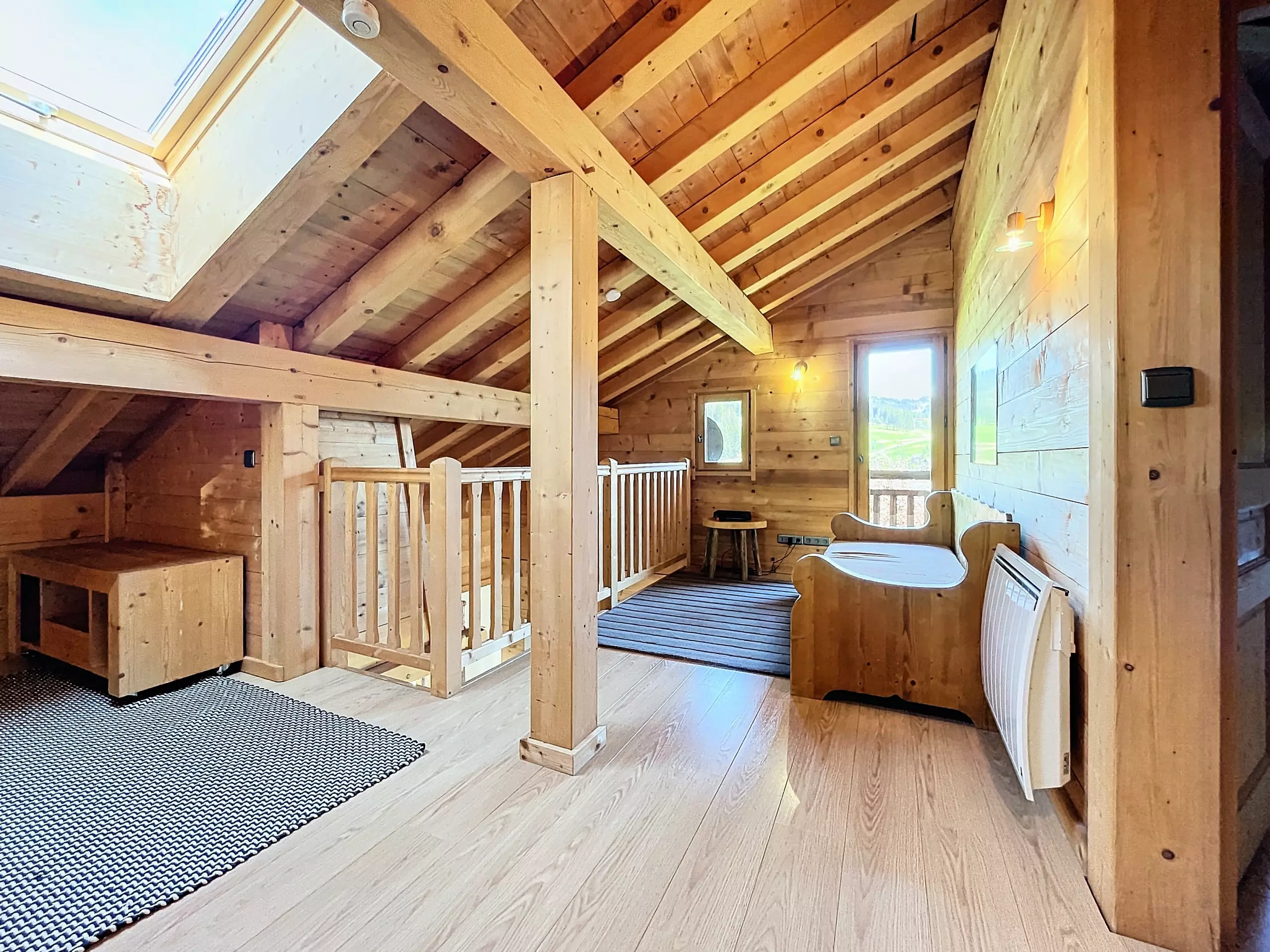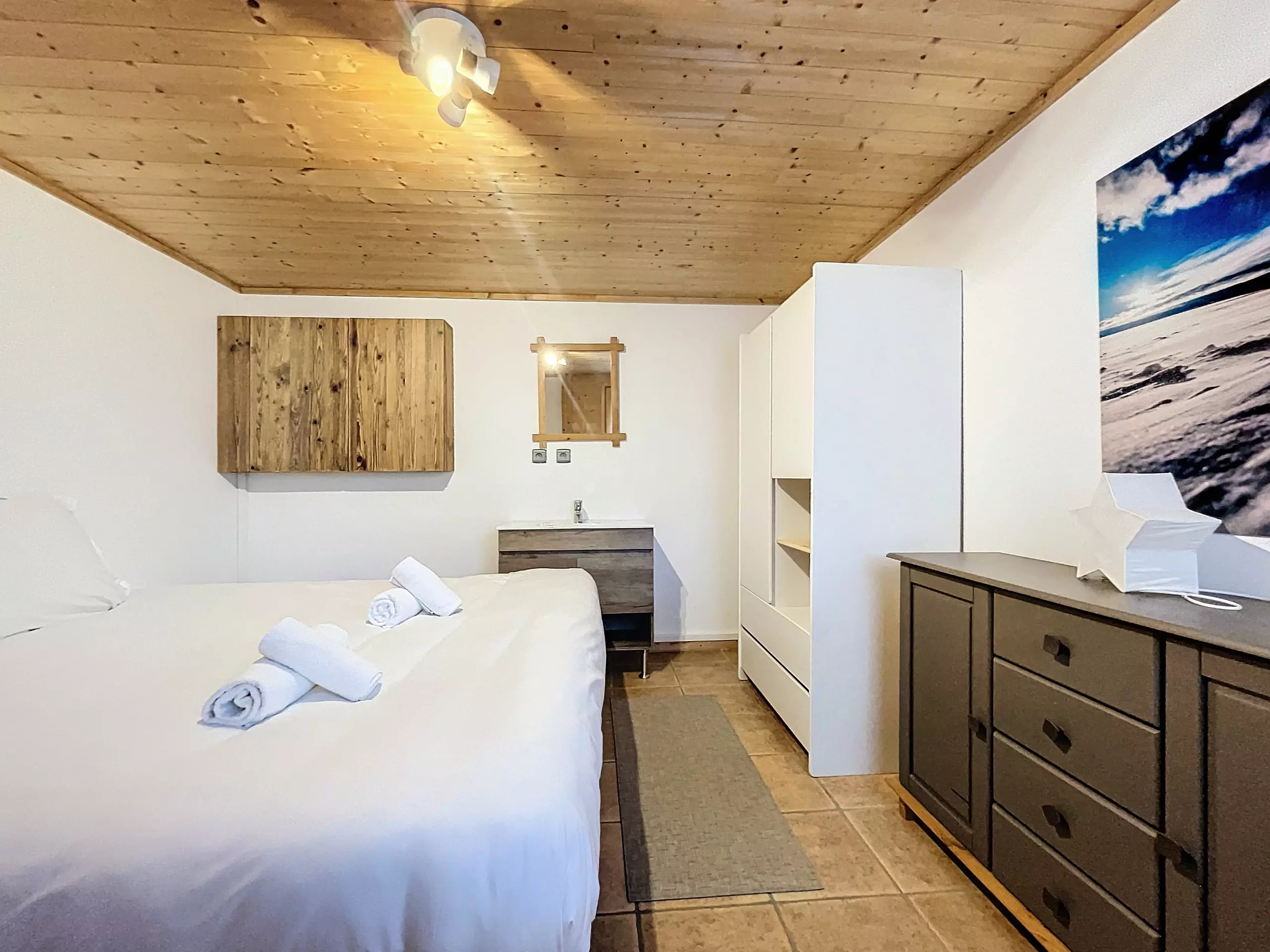 On the ground floor, a vestibule with storage welcomes you when you return from a day of skiing or hiking and unpack your belongings. Then the spacious living room welcomes you around its cozy lounge area with its wood stove, its dining room and its fully equipped kitchen. These various bay windows and openings offer you very beautiful luminosity with its direct access to the balcony. A small adjoining lounge equipped with a TV will allow you to fully enjoy your evenings. Internet access (WiFi) is included.