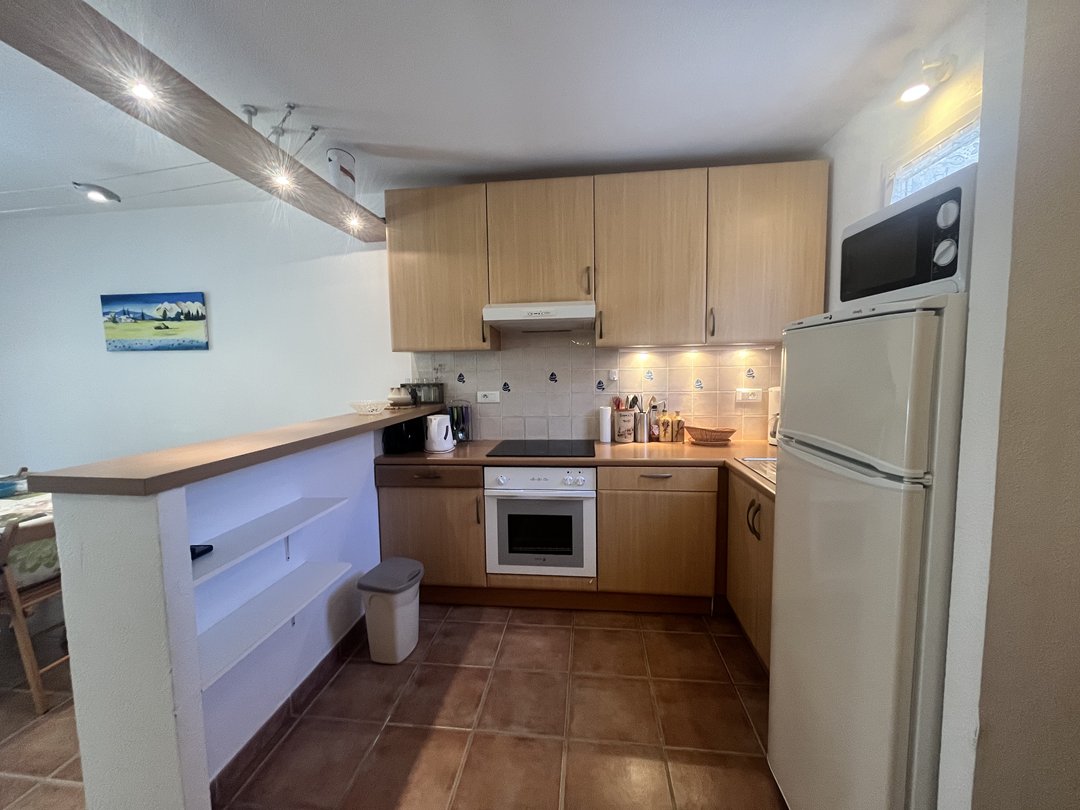 Living room / kitchen - (bay window) - electric blind -: hob (ceramic), oven (electric), extractor hood, fridge freezer, coffee maker, dishwasher, fitted cupboards, sofa bed, television.