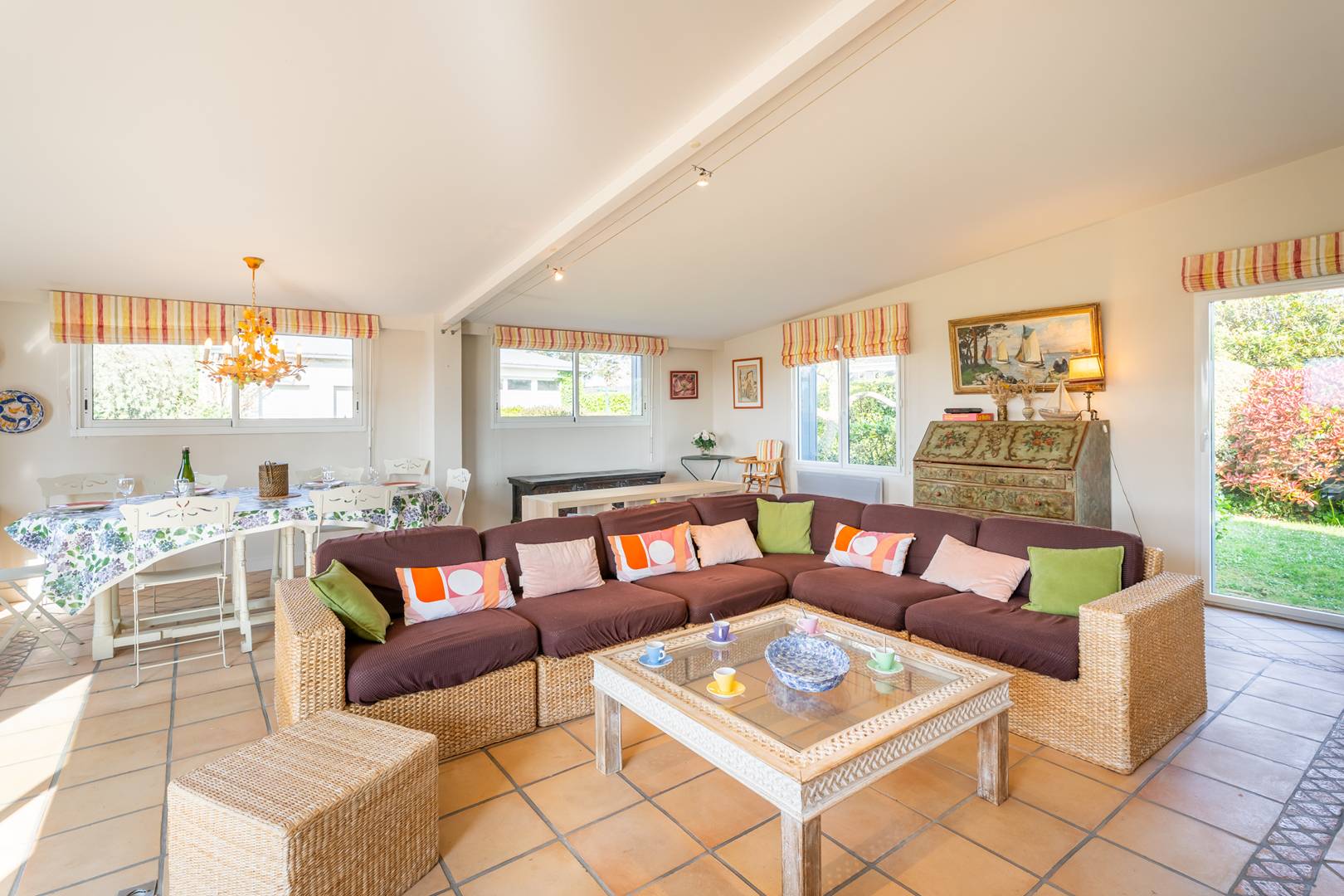 - Living room with dining area (table and chairs) and lounge area (TV, sofa, armchairs) also opening onto the South-facing terrace (garden furniture, barbecue) and extended by the large enclosed private garden