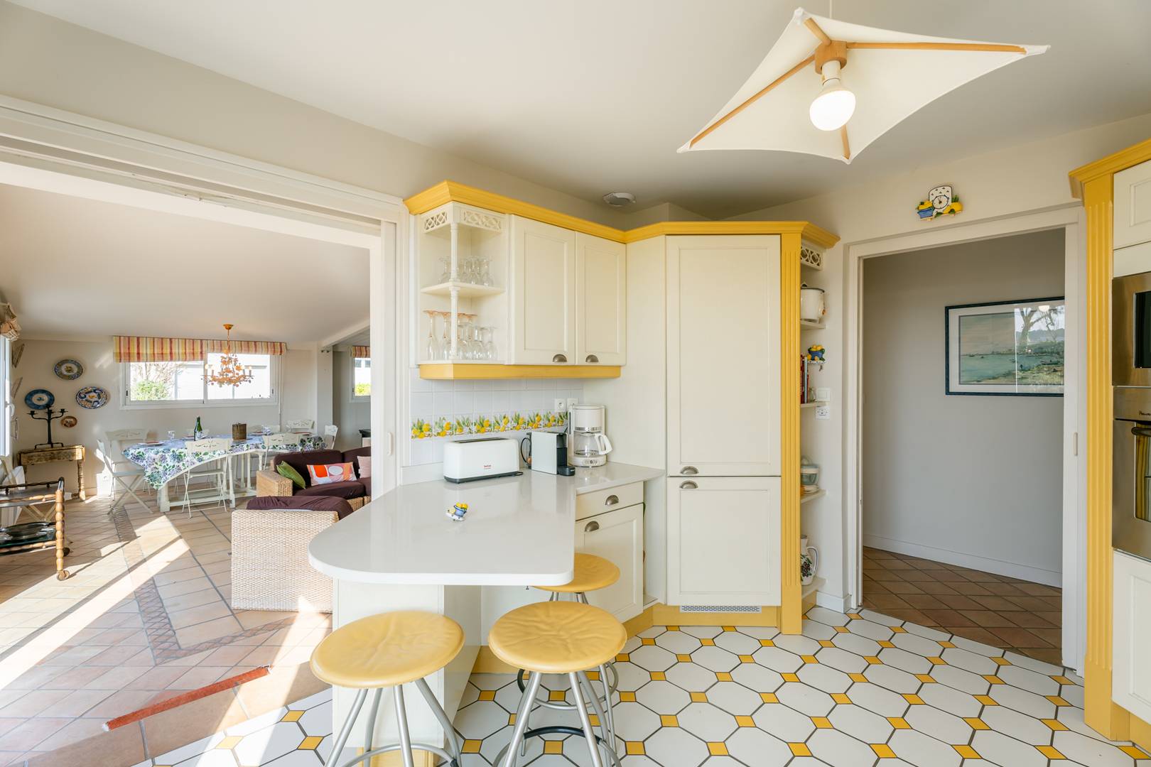 - Semi-open and equipped kitchen (4-ring ceramic hob, oven, microwave, fridge/freezer, dishwasher) opening onto the South-facing terrace with SEA VIEW