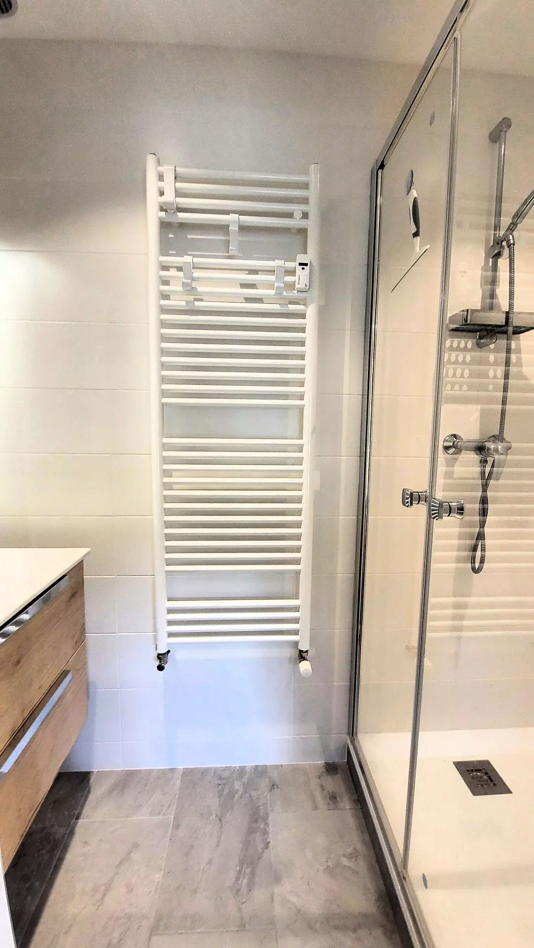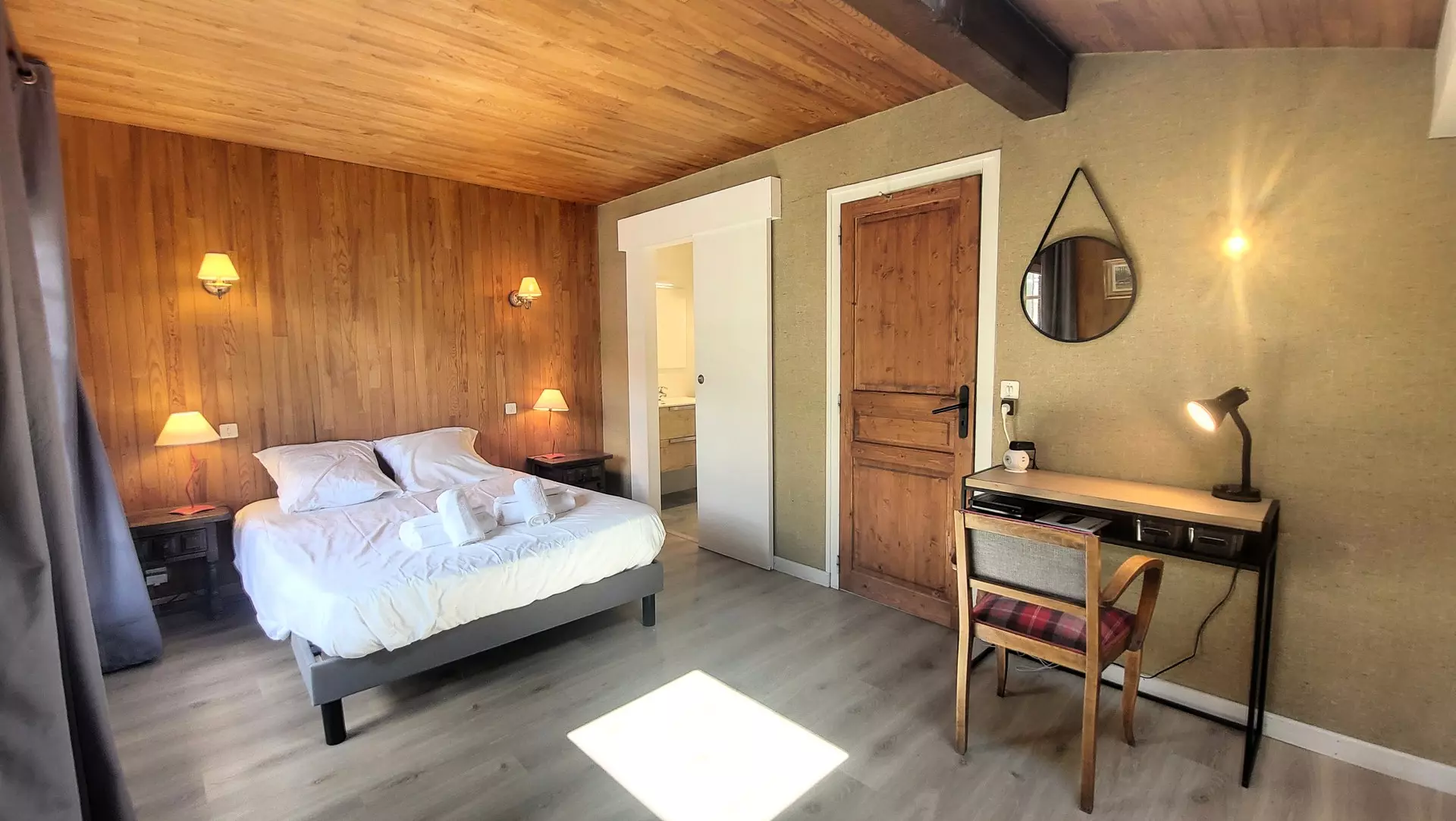 - A double bedroom en suite including a shower room, a sink, a towel dryer (double bed 140cm x 190cm) opening onto a west-facing balcony