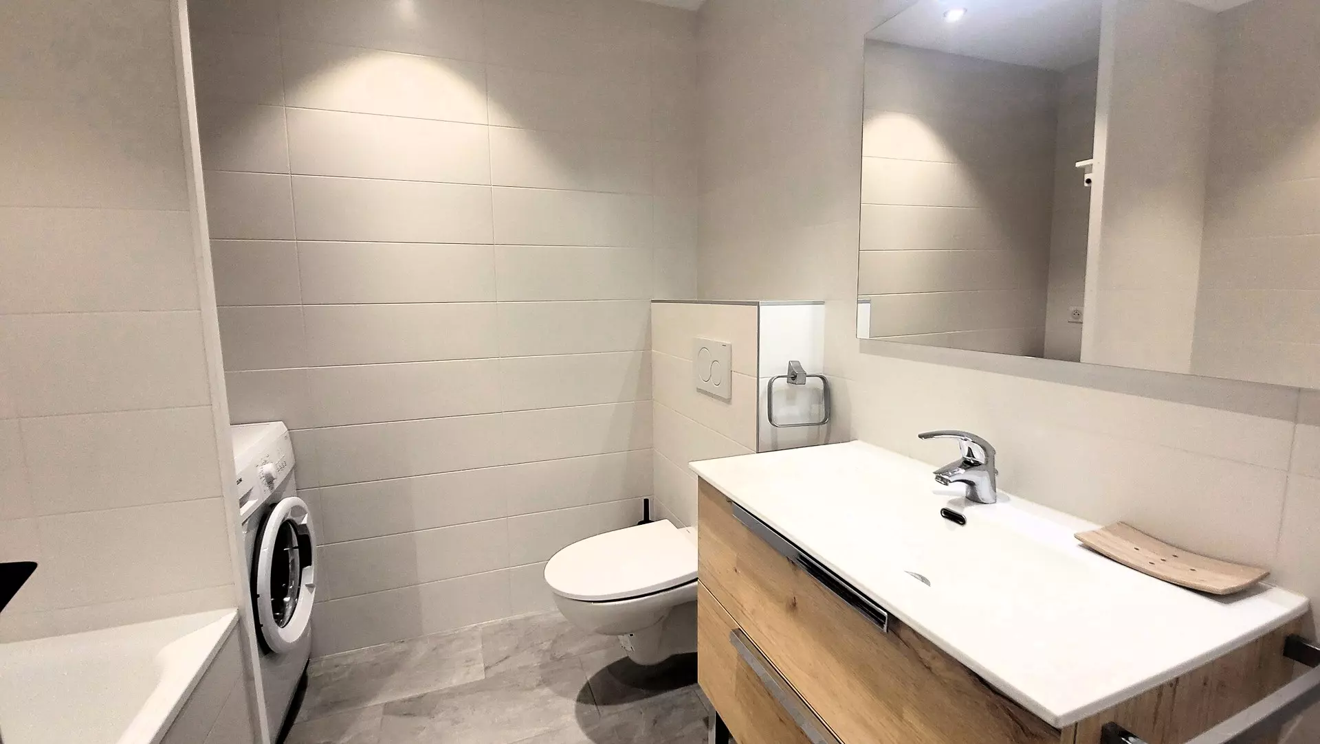 - A bathroom with sink, towel dryer, washing machine and toilet