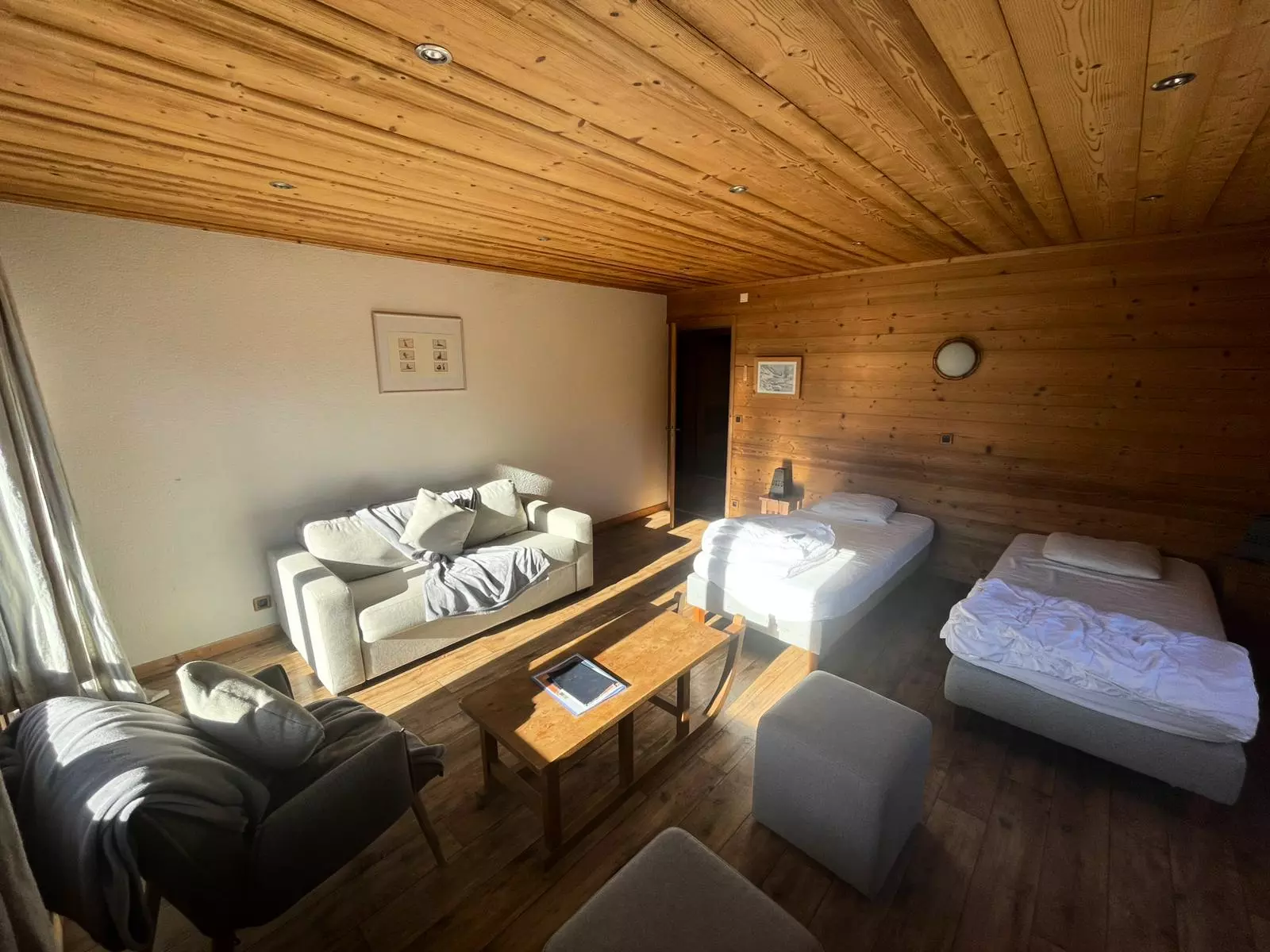 - A living room with a sleeping area (sofa bed + 2 single beds 90cm x 190cm), 1 TV. Access to the east-facing balcony