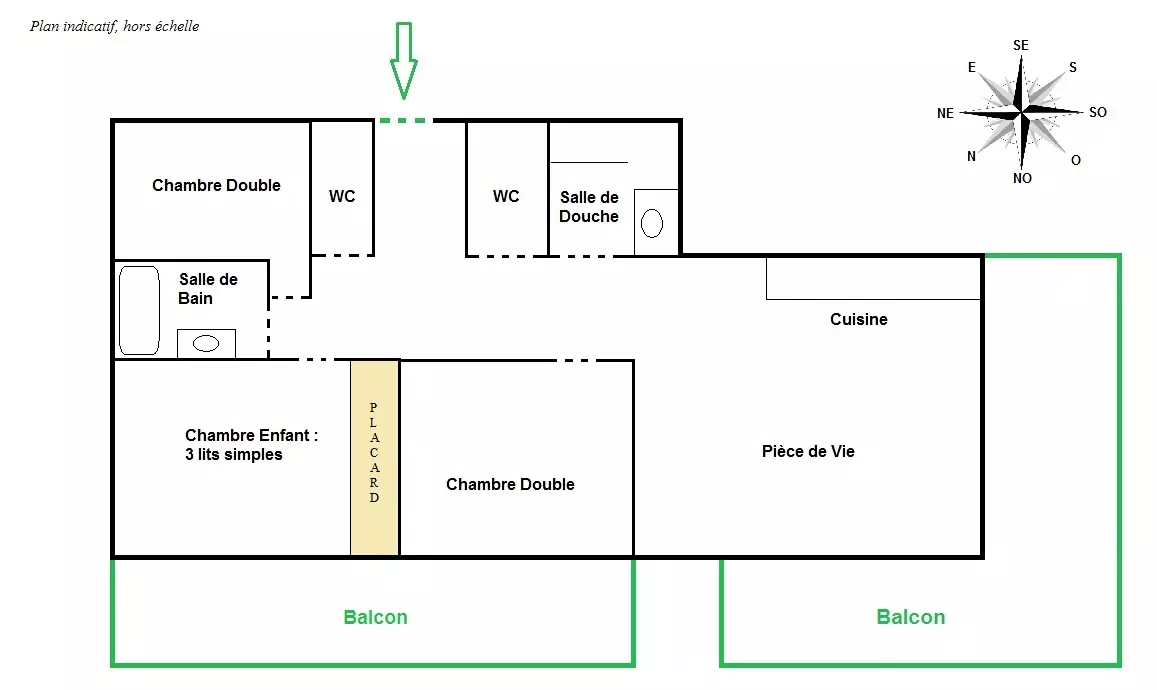 - 1 living room, equipped with a convertible sofa (160 cm), with large equipped kitchen open to the living room, facing South-West, dining area. Balcony access