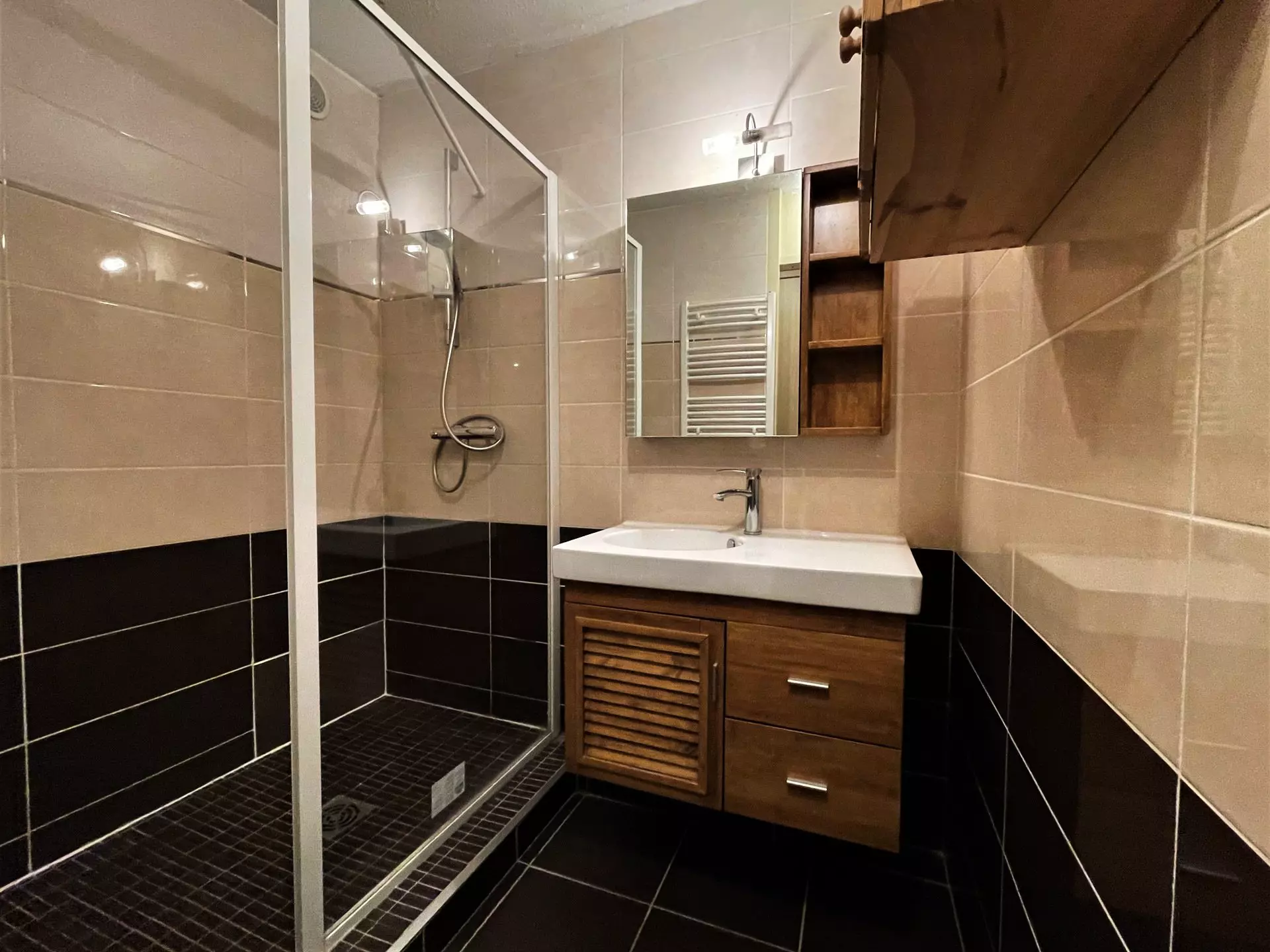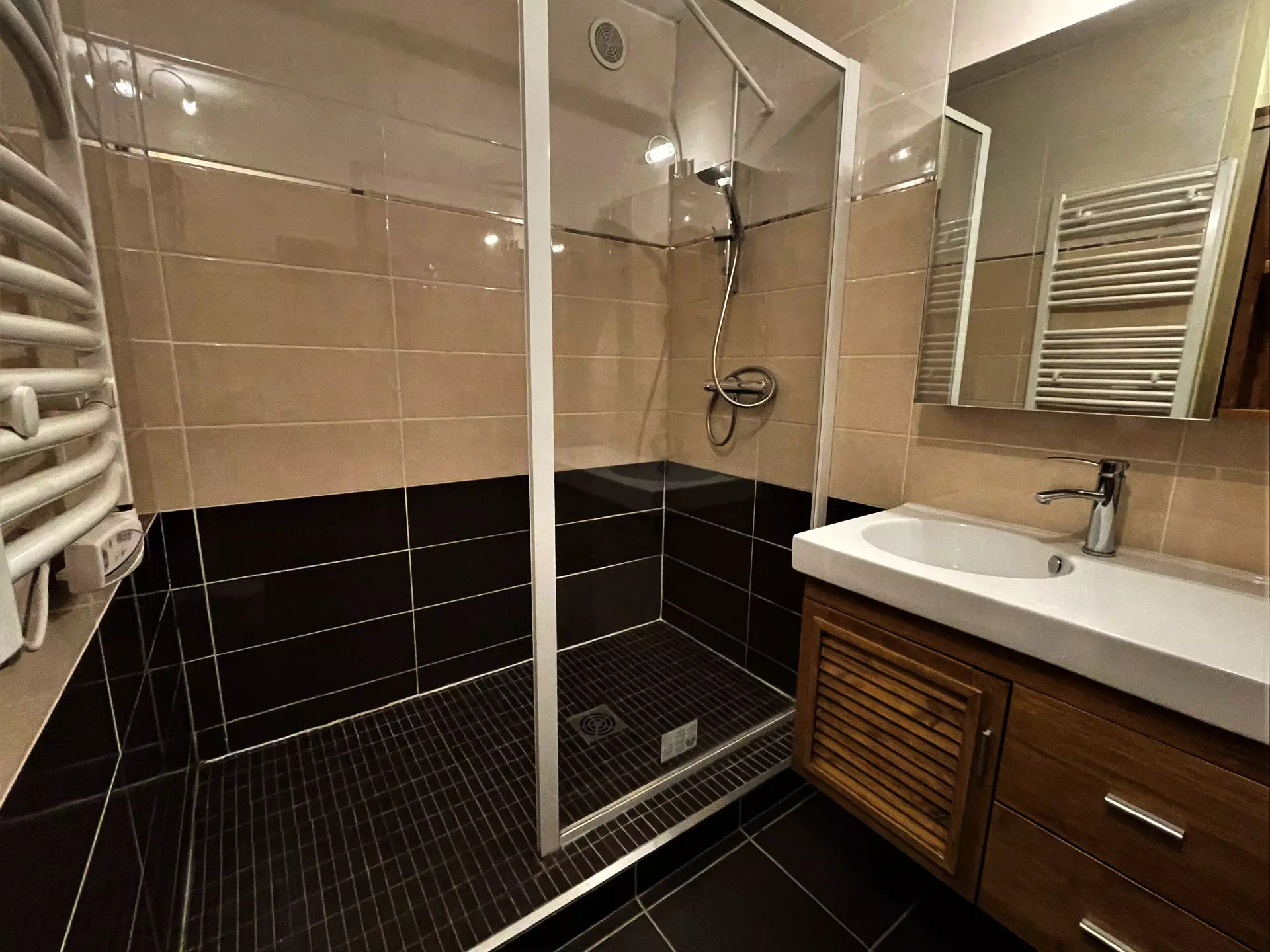 Bathroom: walk-in shower, sink, towel dryer
