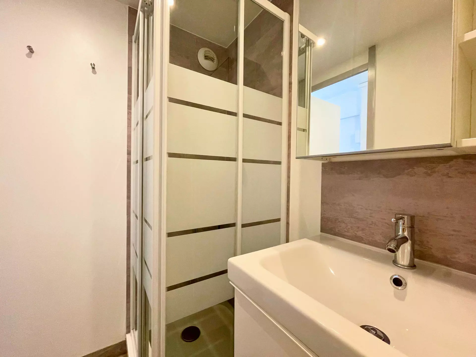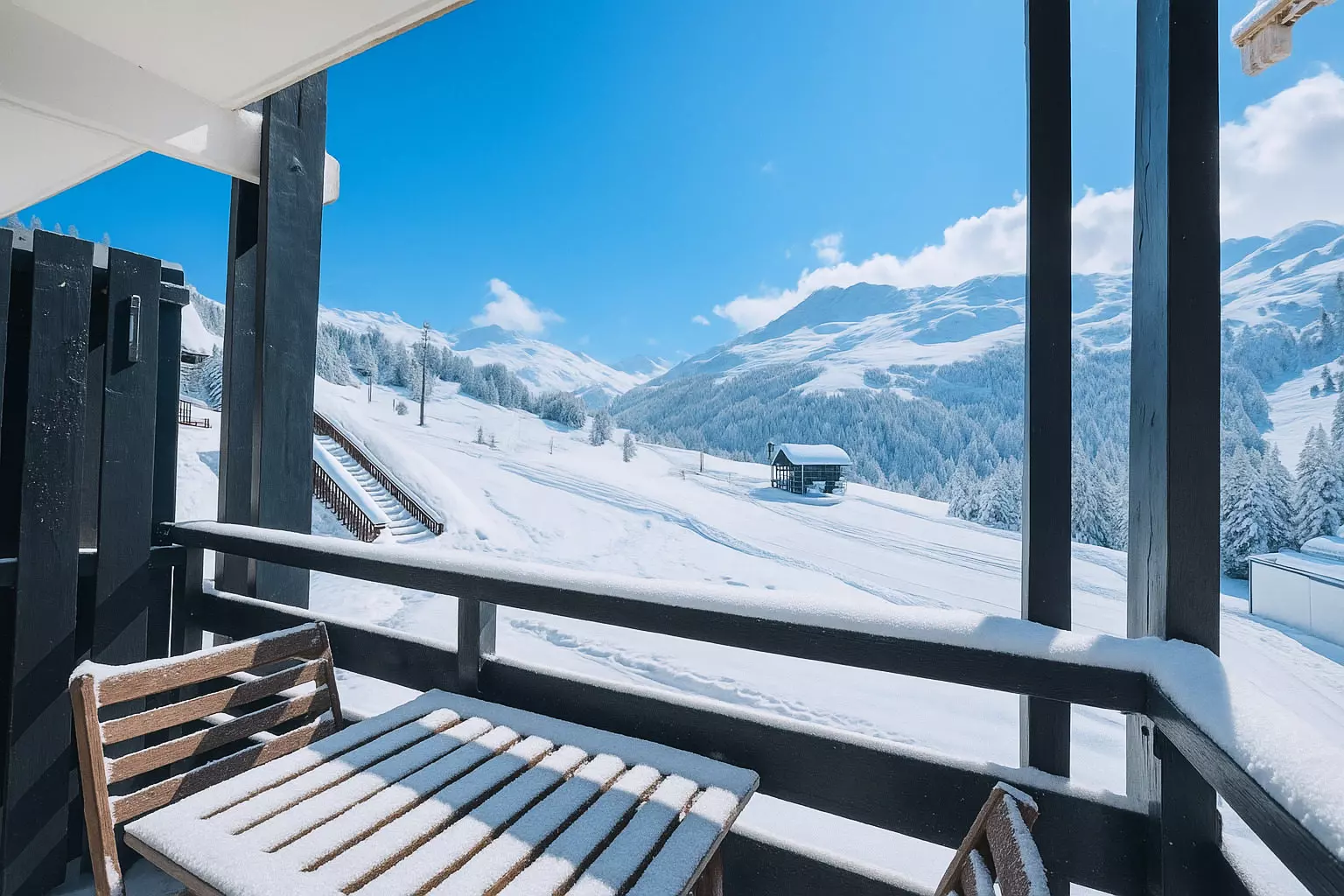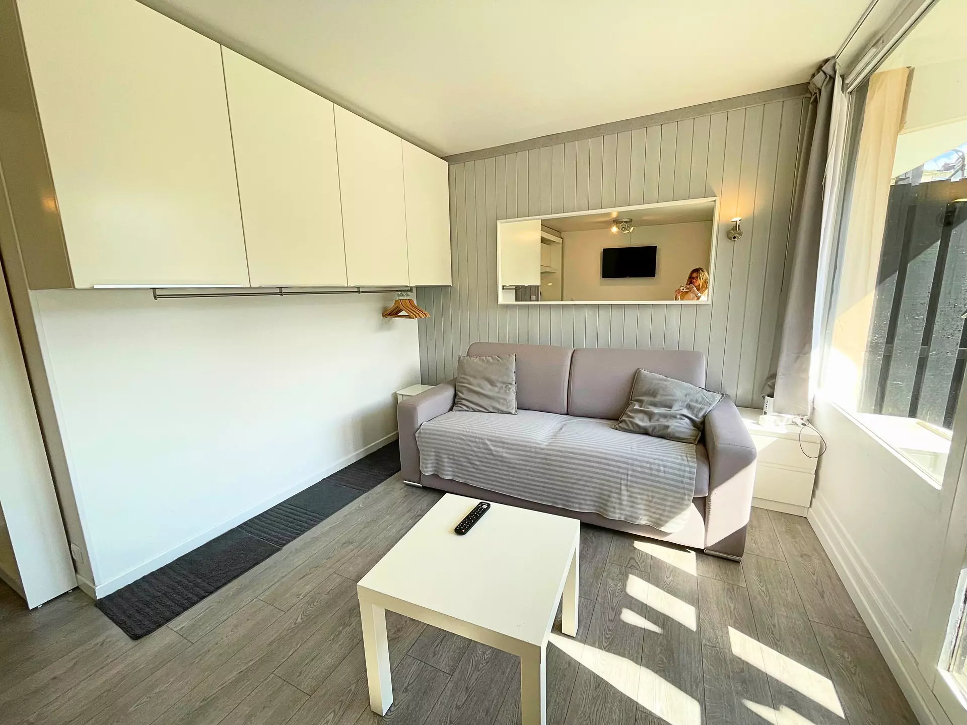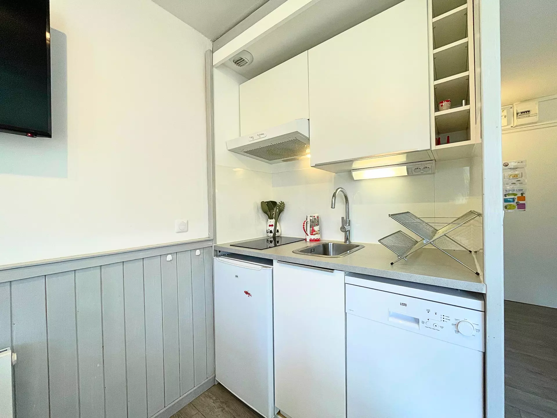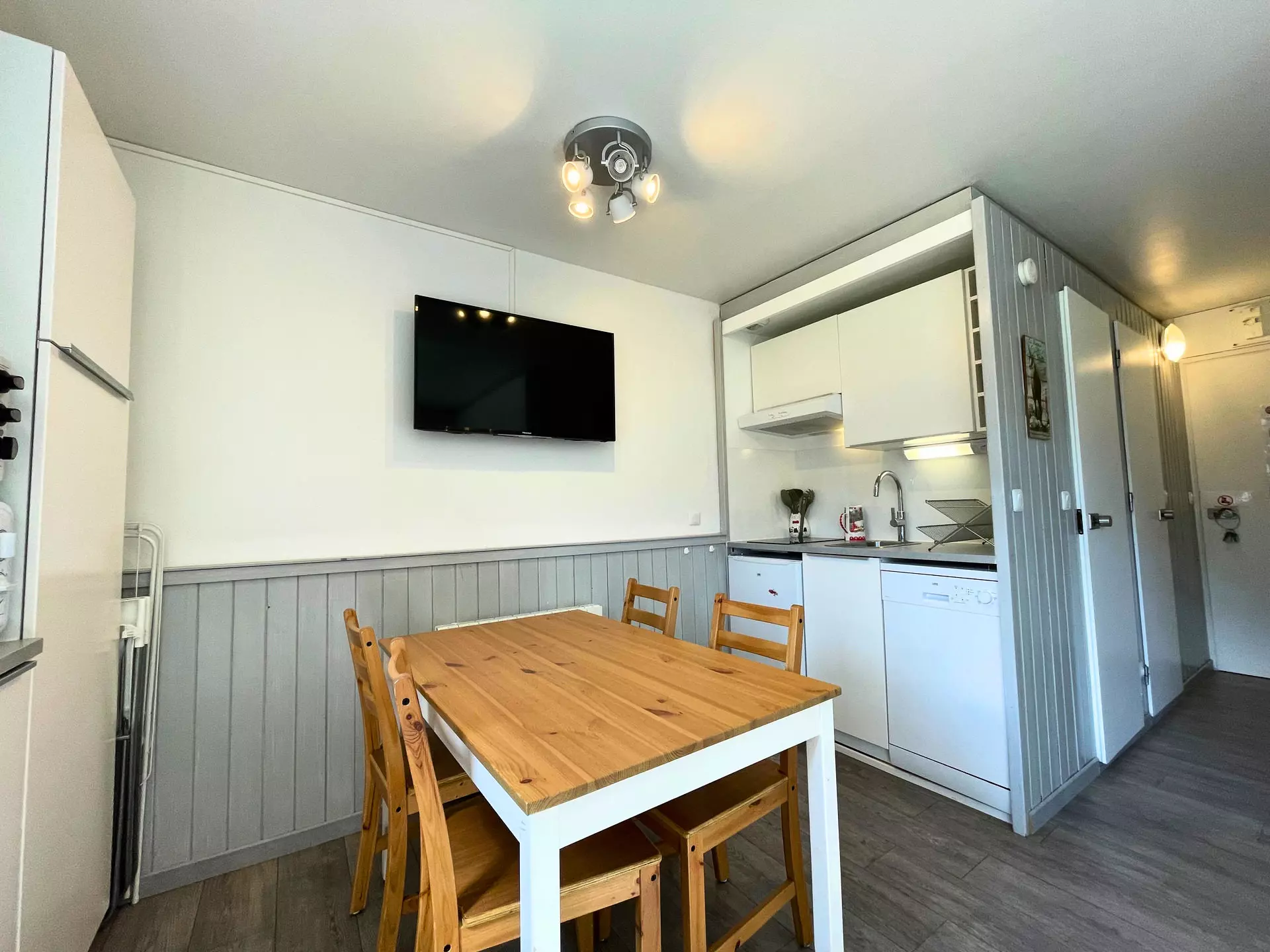Residence Le Villaret (No. 114), studio cabin for 4 people 25m², on the 1st floor by elevator at the level of the ski lockers and access to the slopes (access to the outdoor parking on the ground floor by elevator), south-facing balcony, view of the slopes and mountains. Apartment completely renovated in August 2017