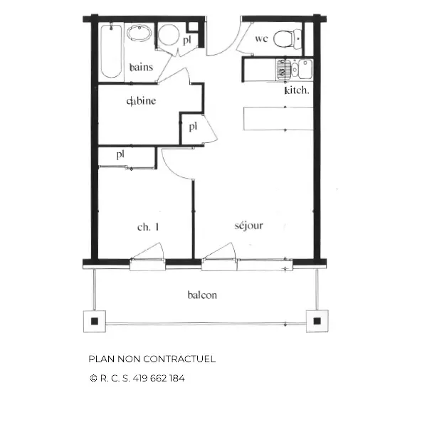 Residence Les Côtes d'Or - Chalet Argentière (n°102), 2 cabin rooms for 4/6 people, 35 m² on the 1st floor balcony side, floor -1 from the chalet entrance, by stairs, south-west facing balcony