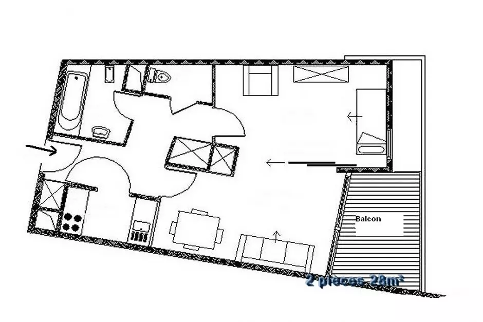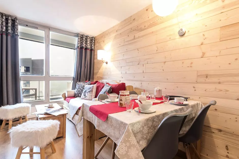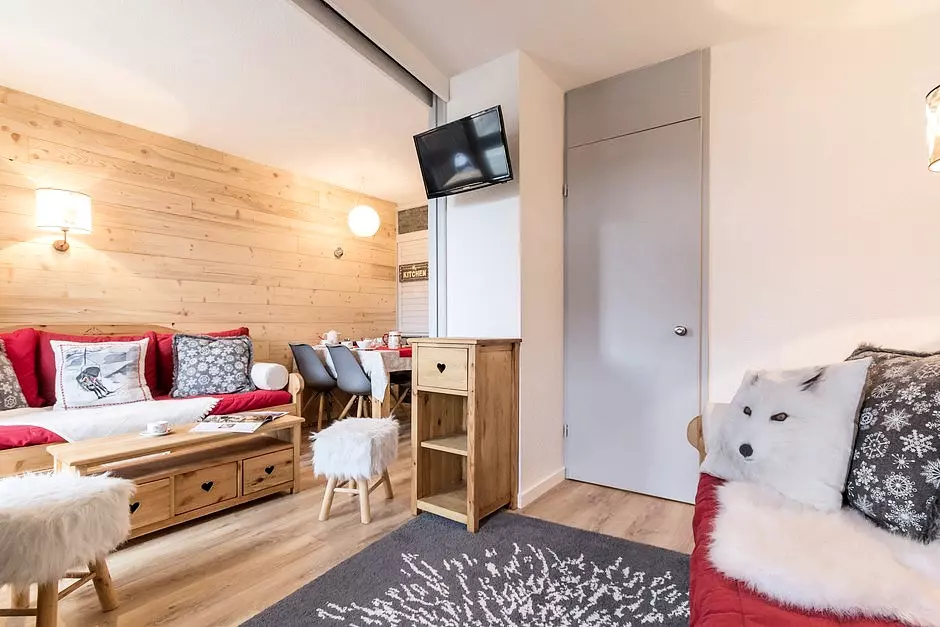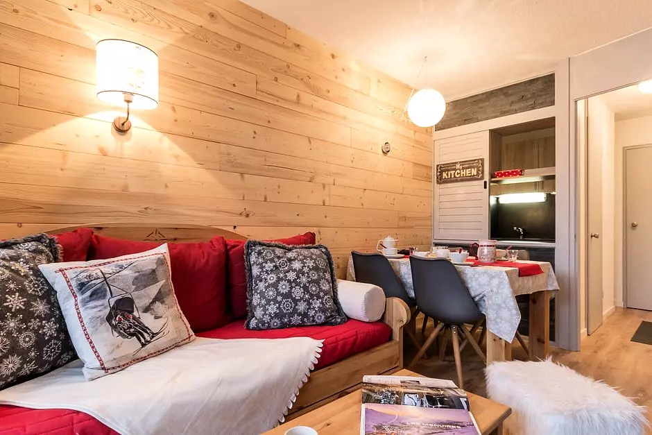 Beautiful two-room apartment (separated by a movable partition) completely renovated in a mountain style of 28 m² equipped for 4 people, offering a south-facing balcony and view of the mountain range. Covered parking space included n°14