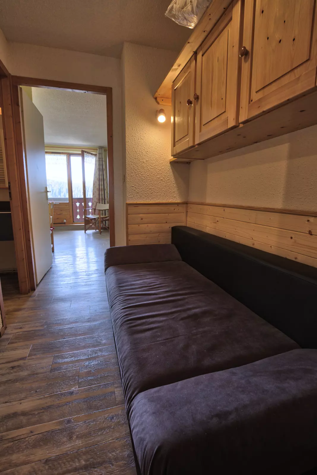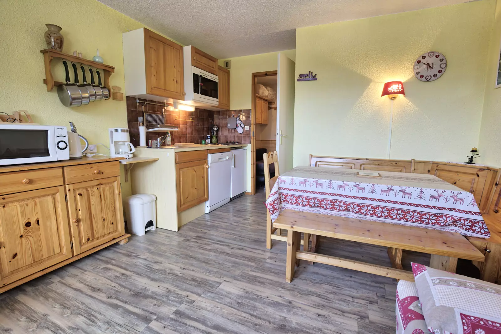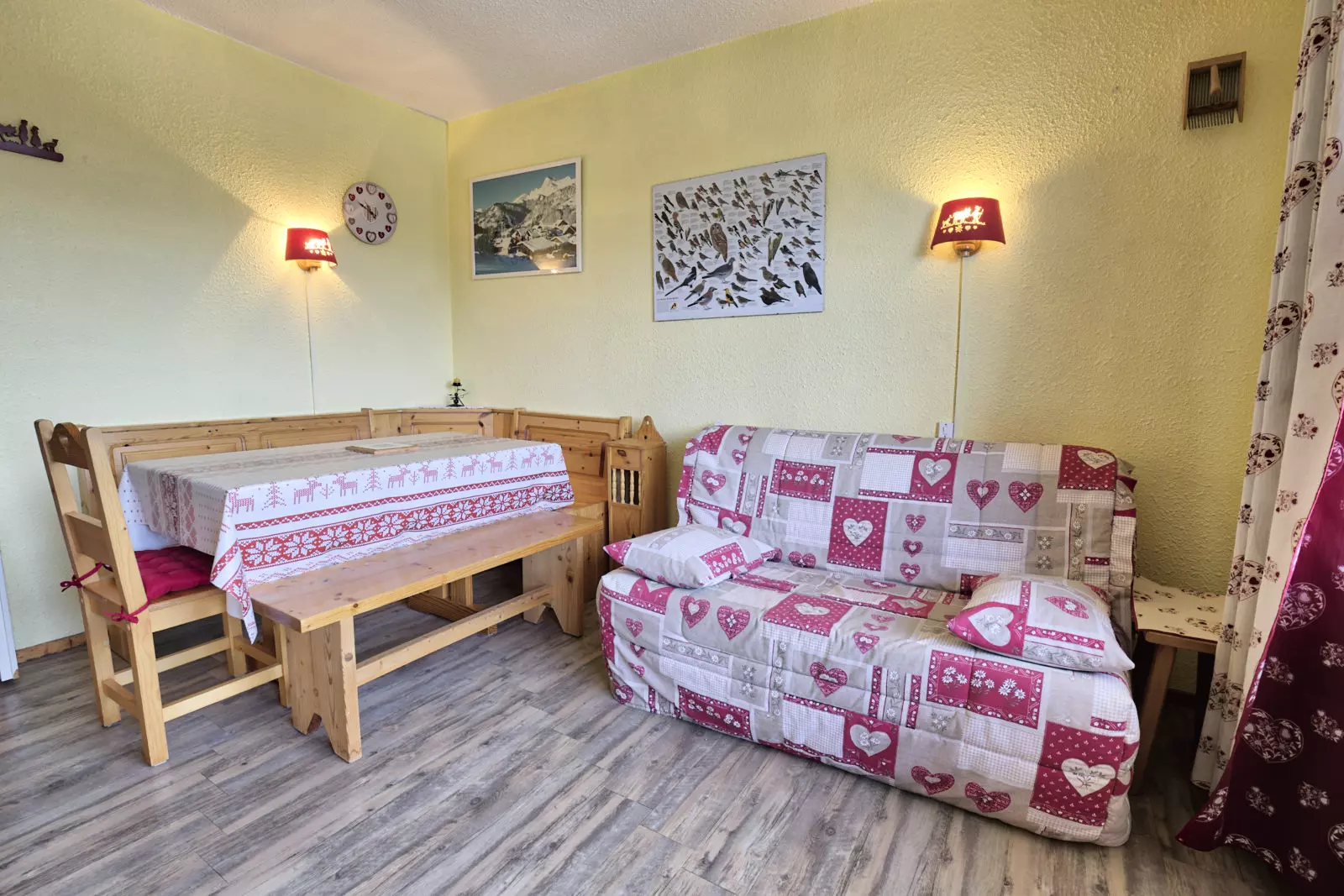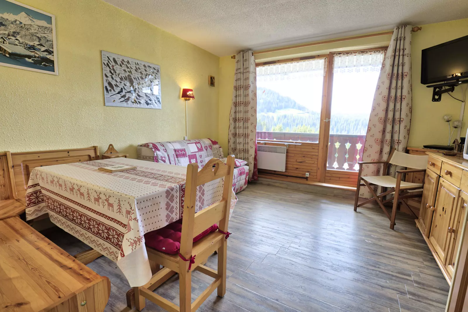 Studio cabin for two to four people at an altitude of 1,450m, next to the La Boulangère ski lift. Measuring 26 m², it is located on the floor with a south-facing balcony offering a beautiful view of Mont Charvin and the valley.
