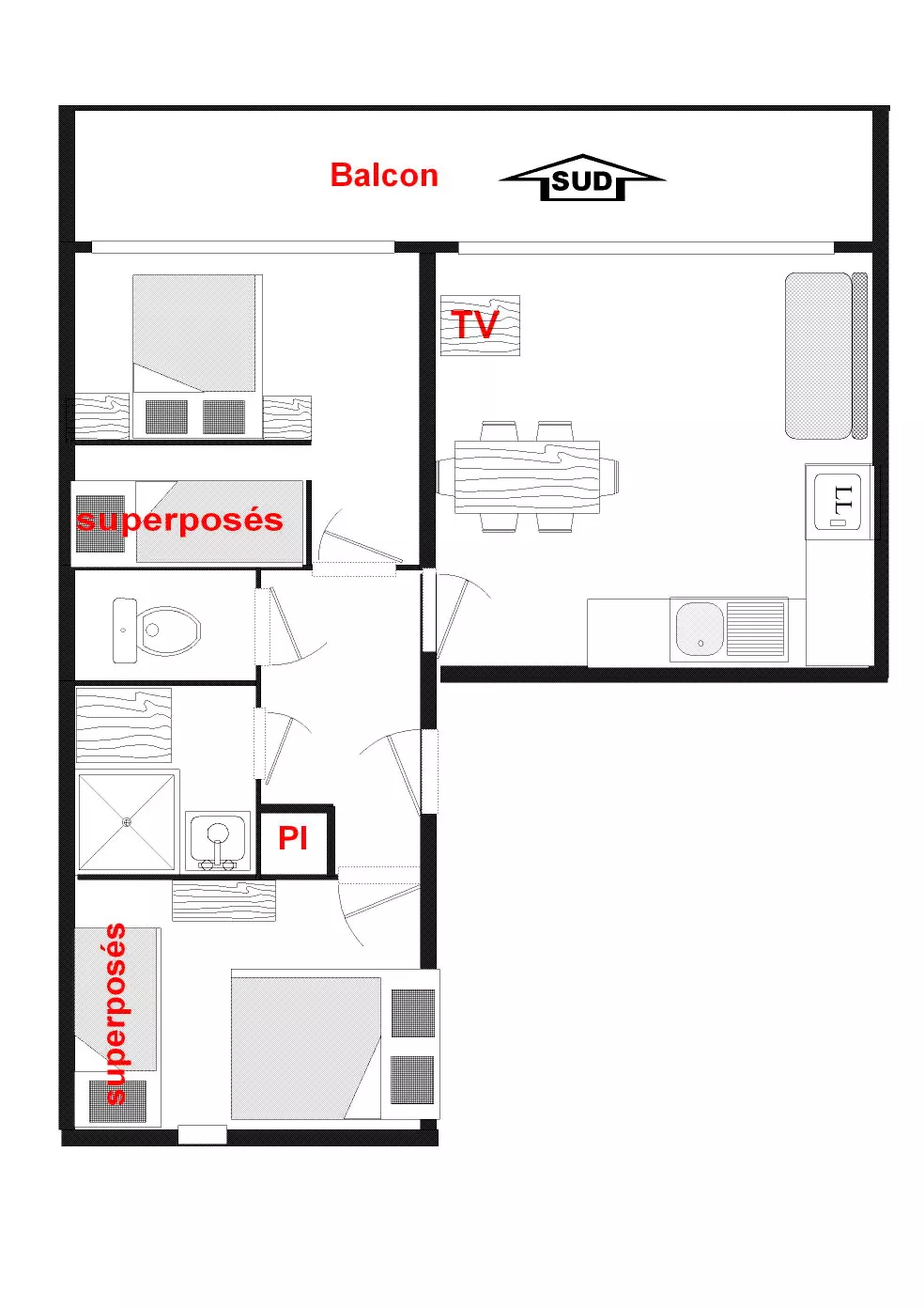 - Sleeping arrangements: one bedroom with a double bed (140) and two single bunk beds (2x90), one bedroom with a double bed (140) and a baby bed, a mountain corner with two single bunk beds (2x90). Bedding equipped with duvets.