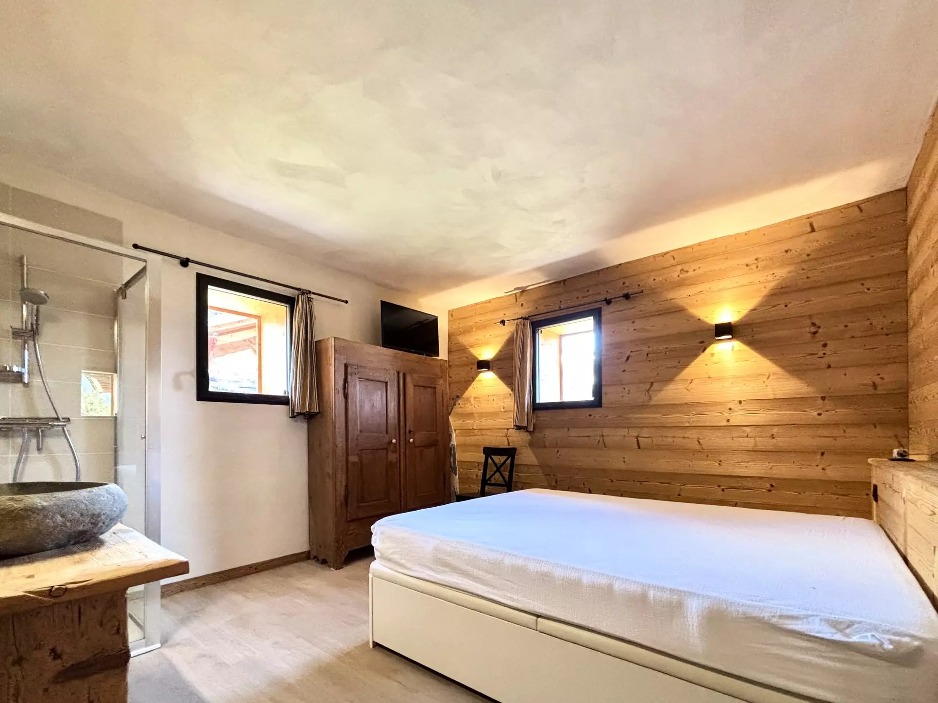 On the ground floor of a chalet, this 70m² apartment sleeps 6. It features a large, southwest-facing terrace with exceptional views of the village, Mont Charvin, and the valley.