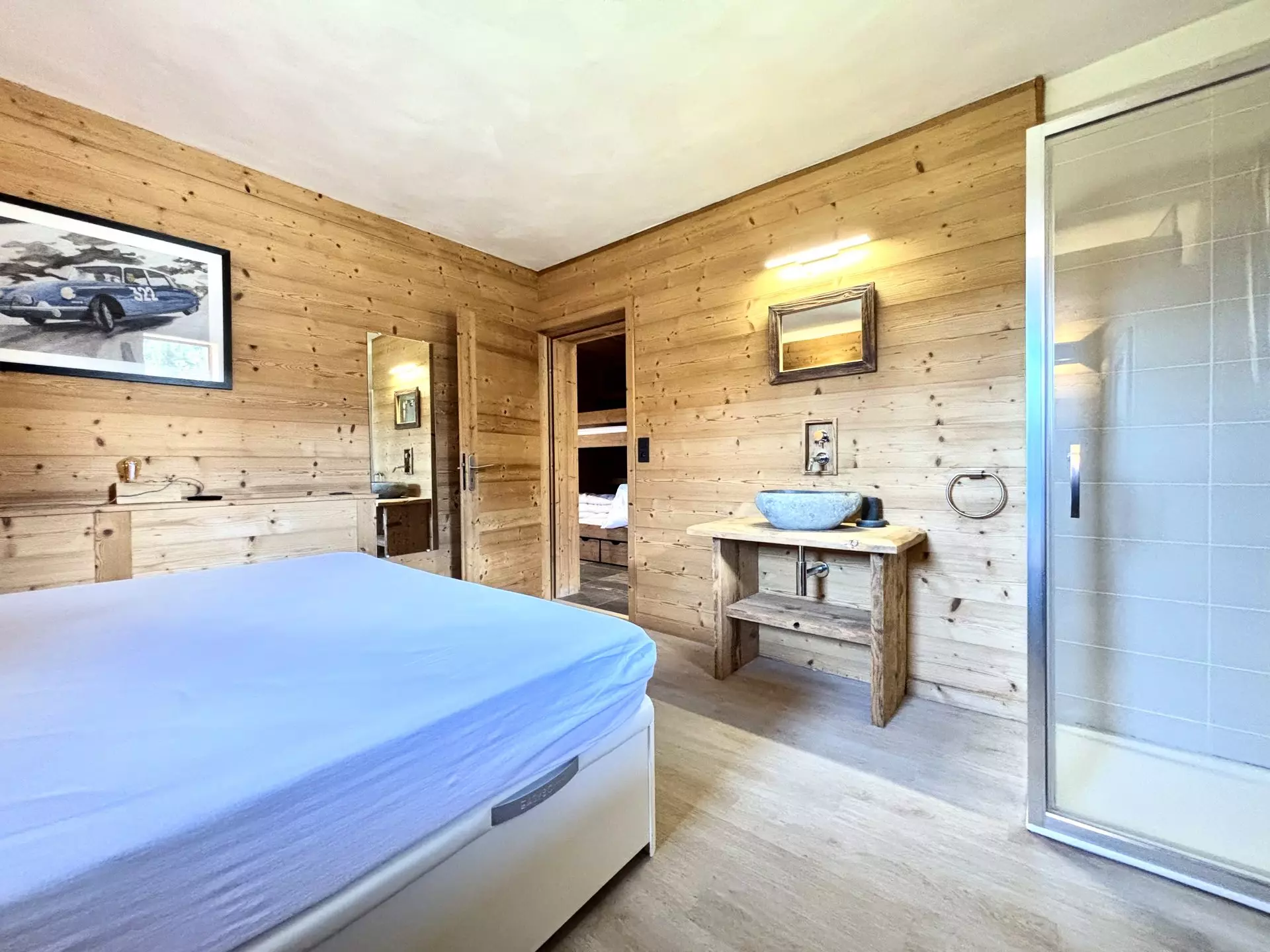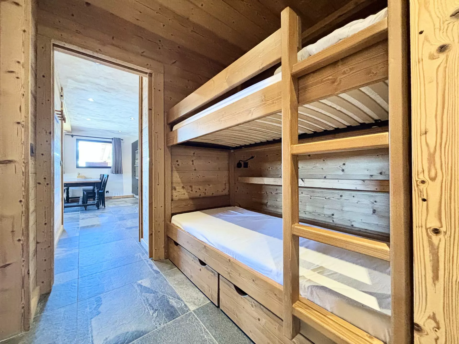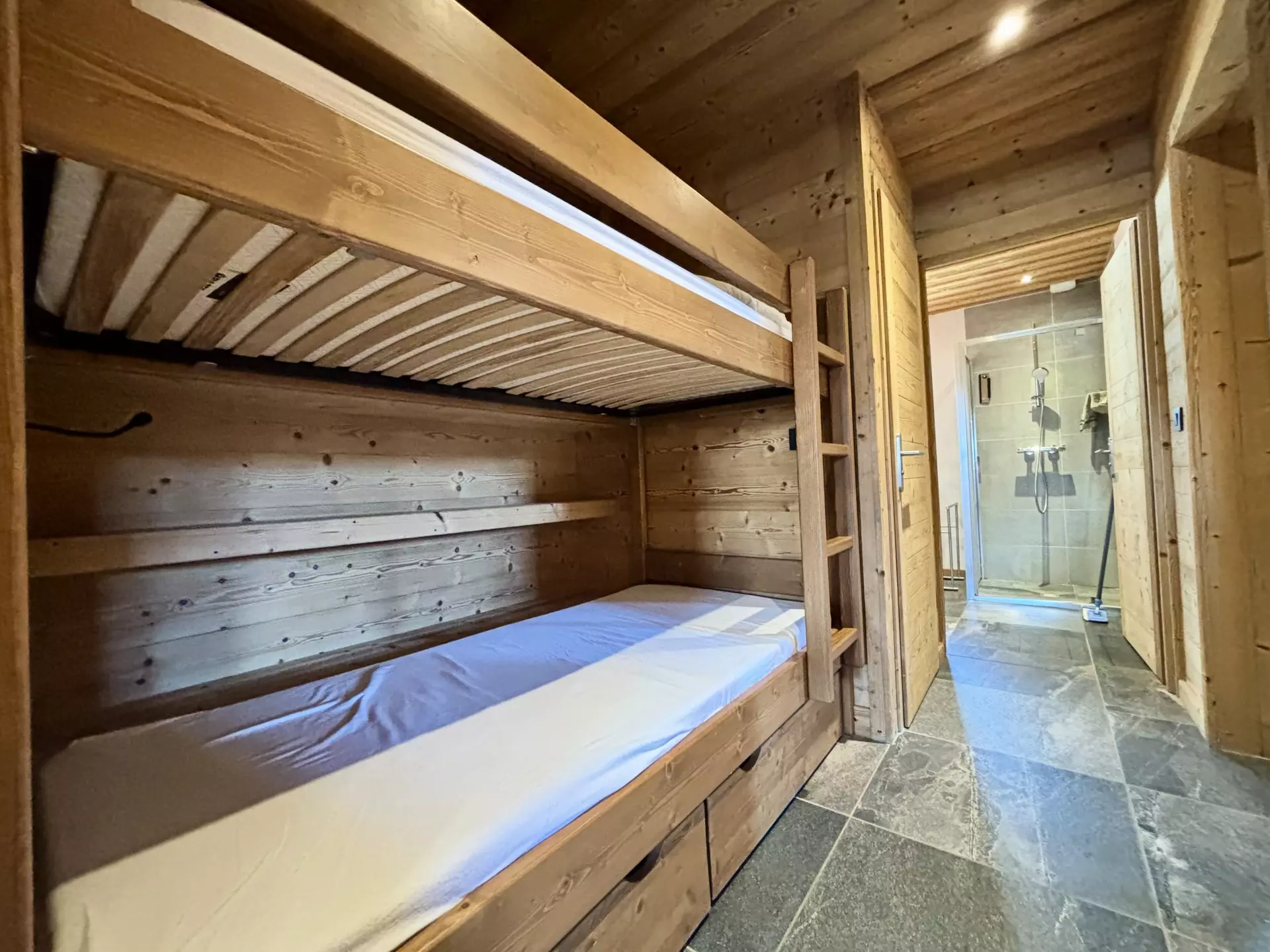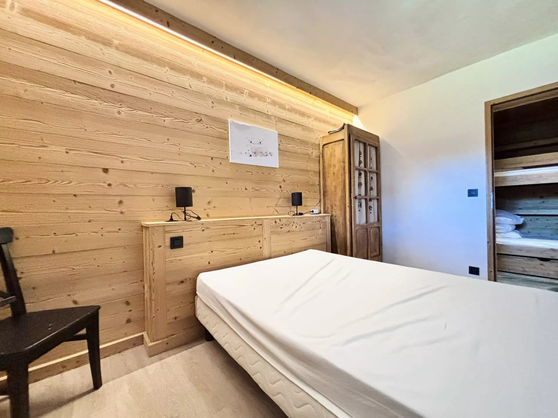 - Open kitchen to living room: 4 induction hobs, oven, fridge/freezer, microwave, dishwasher. - Sleeping arrangements: one bedroom en suite with shower, one double bed (160) and television, one bedroom with one double bed (140), a mountain corner with bunk beds (2x90), living room with a pull-out sofa bed (2x90). Bedding equipped with duvets.