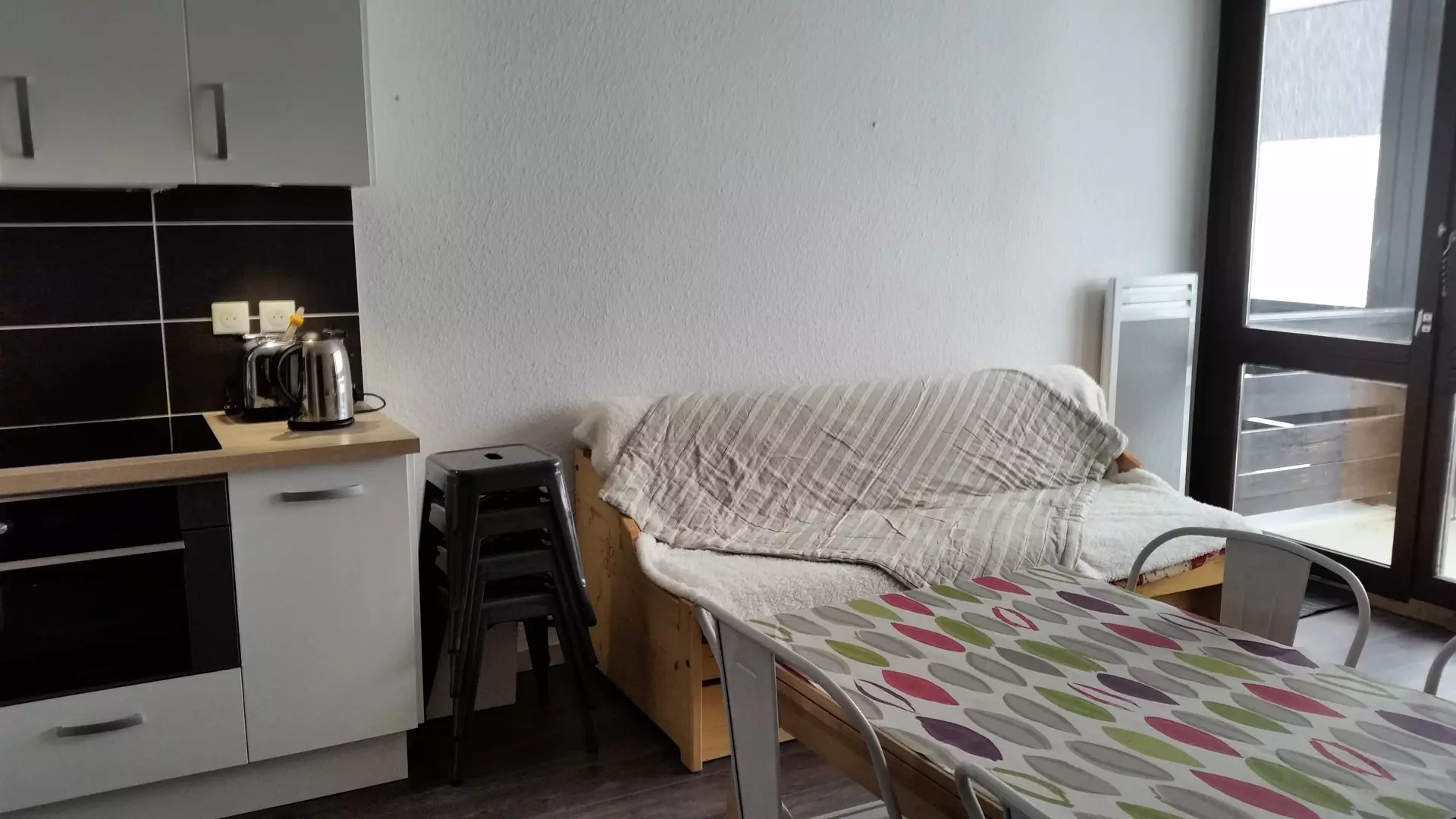 Fully renovated apartment of approximately 46m2, comprising a living room with kitchenette opening onto a double south-facing balcony, a bedroom with double bed also opening onto the balcony, 1 sleeping area separated by a curtain and another separated by a door, a bathroom and a shower room.