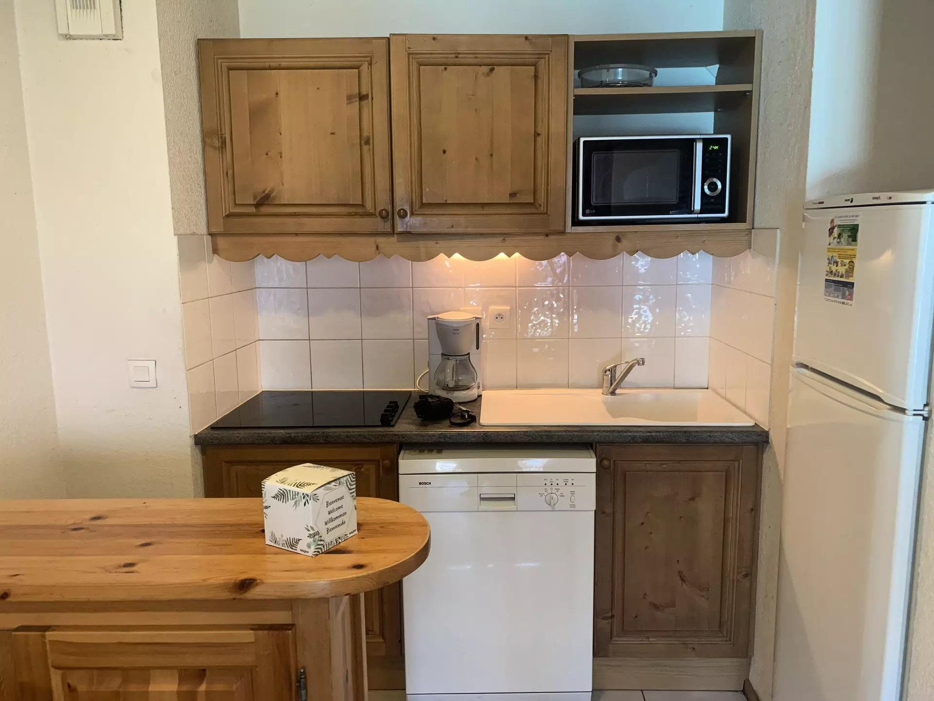 - Kitchen equipped with dishwasher, ceramic hob, refrigerator, microwave, coffee maker,