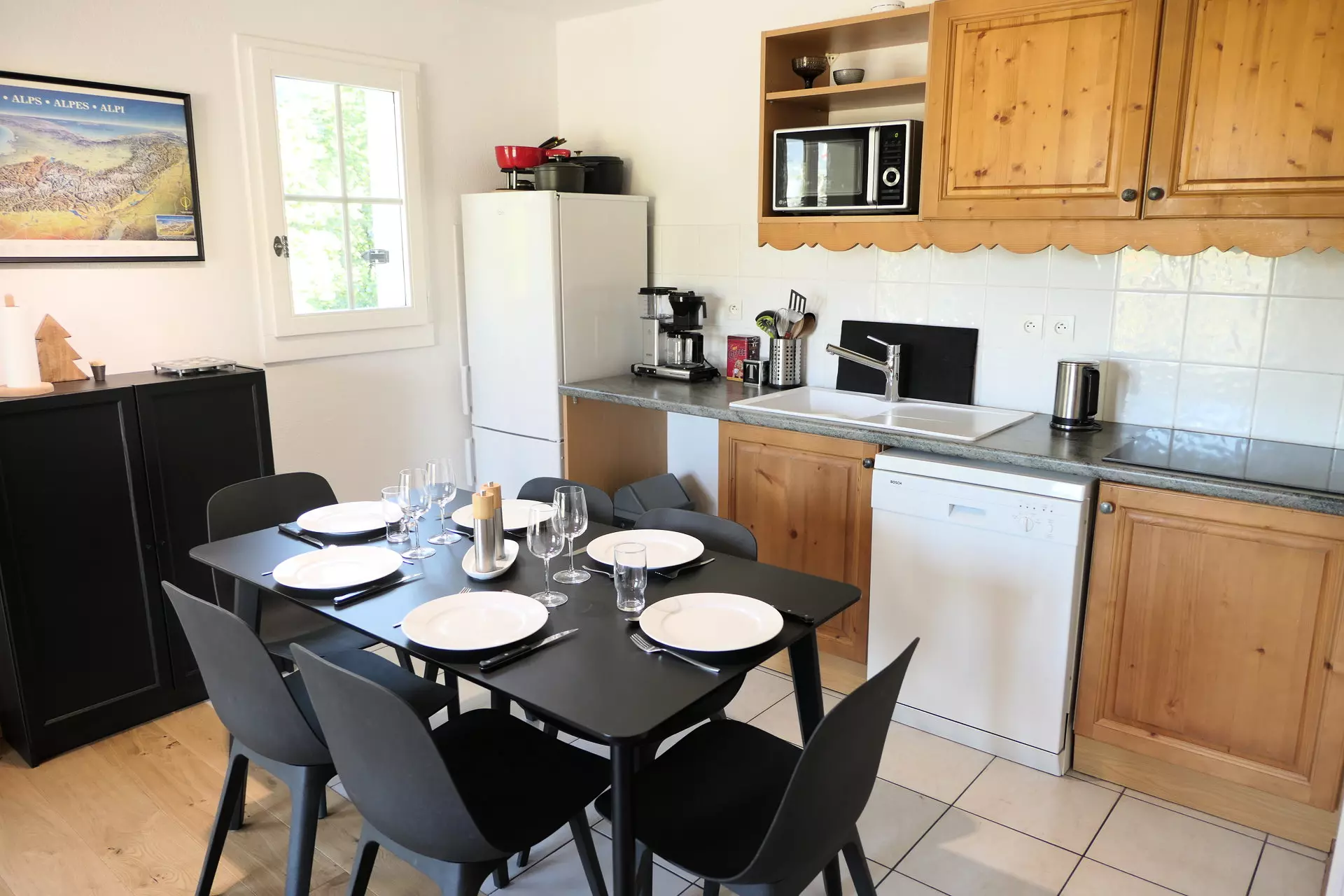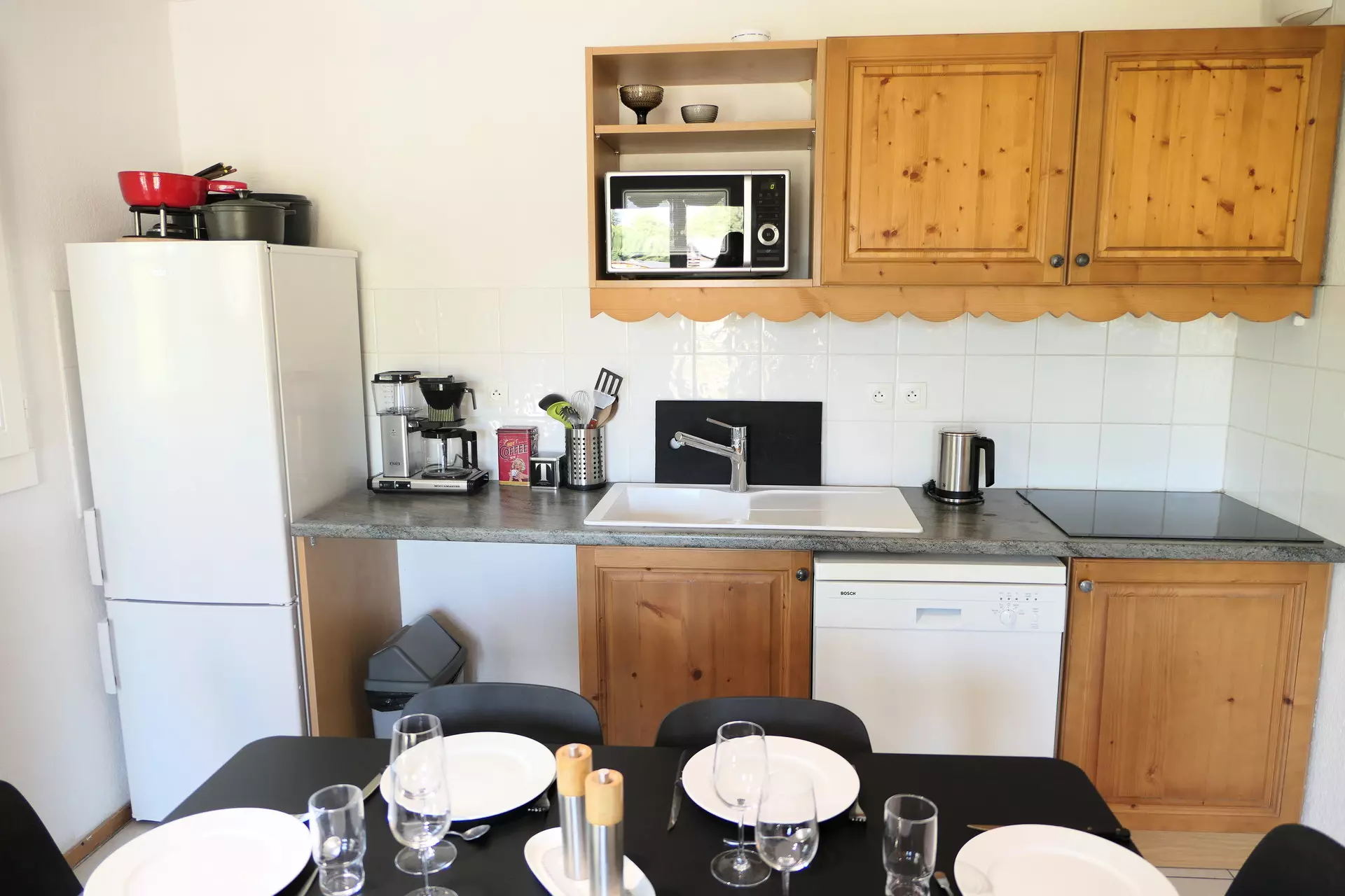 - Fully equipped kitchen with ceramic hob, refrigerator, filter coffee maker, microwave, toaster, kettle, freezer, dishwasher, fondue set.