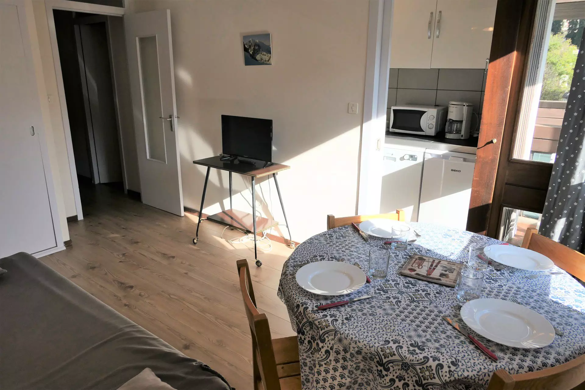 - A living room with a sofa bed for 2 people (140*190), television and dining area.