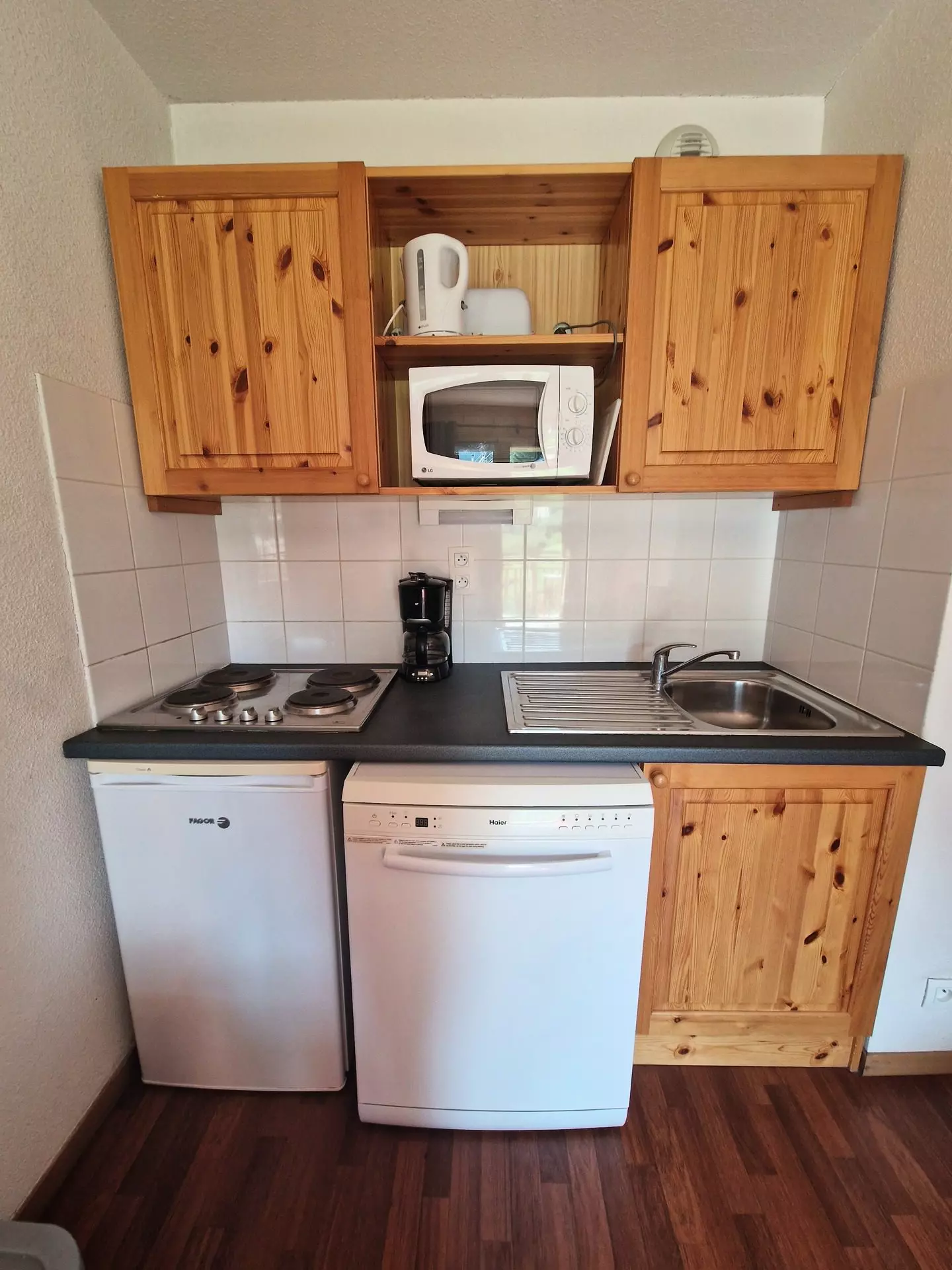 - Kitchen area with 4 hotplates, refrigerator, dishwasher, microwave.