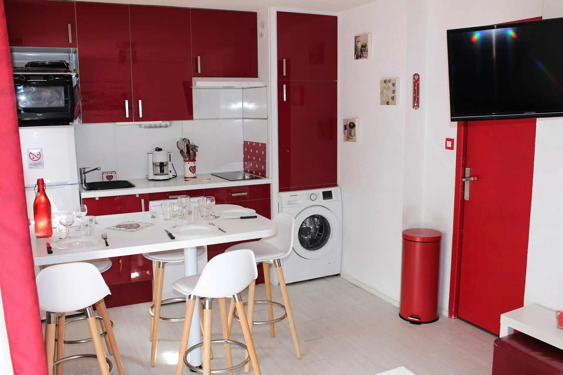 - Kitchen area: combined microwave oven, dishwasher, refrigerator (168L), freezer (56L), induction hob (2 burners) and washing machine.