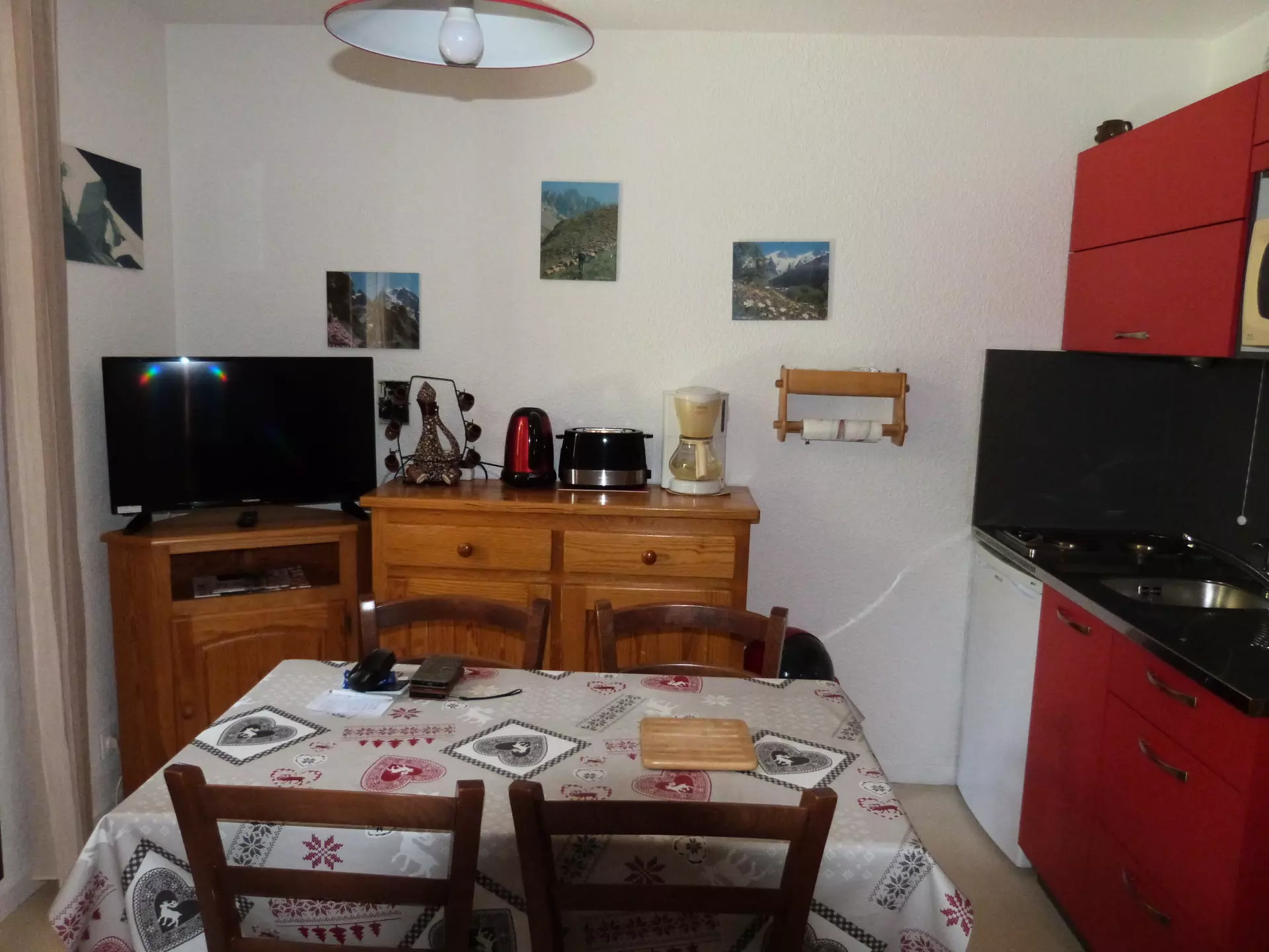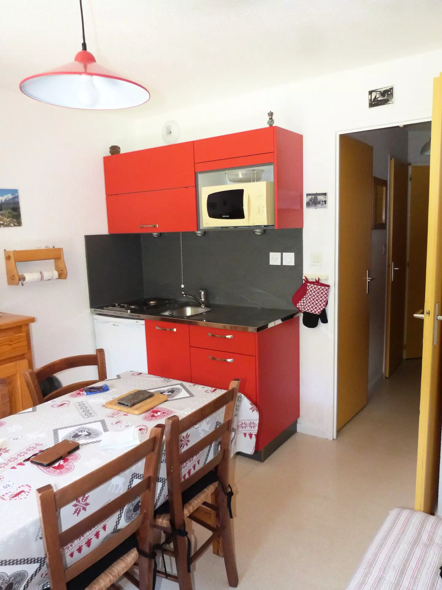 - Kitchen area: electric hob, refrigerator, microwave grill.