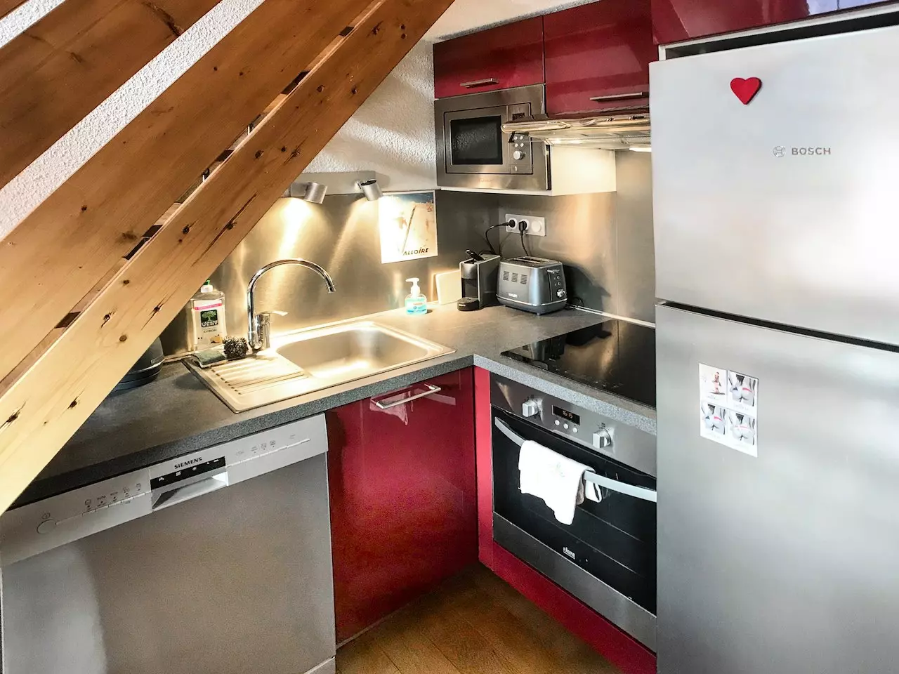 Kitchen area: oven, microwave, dishwasher, fridge/freezer, induction hob (4 burners)