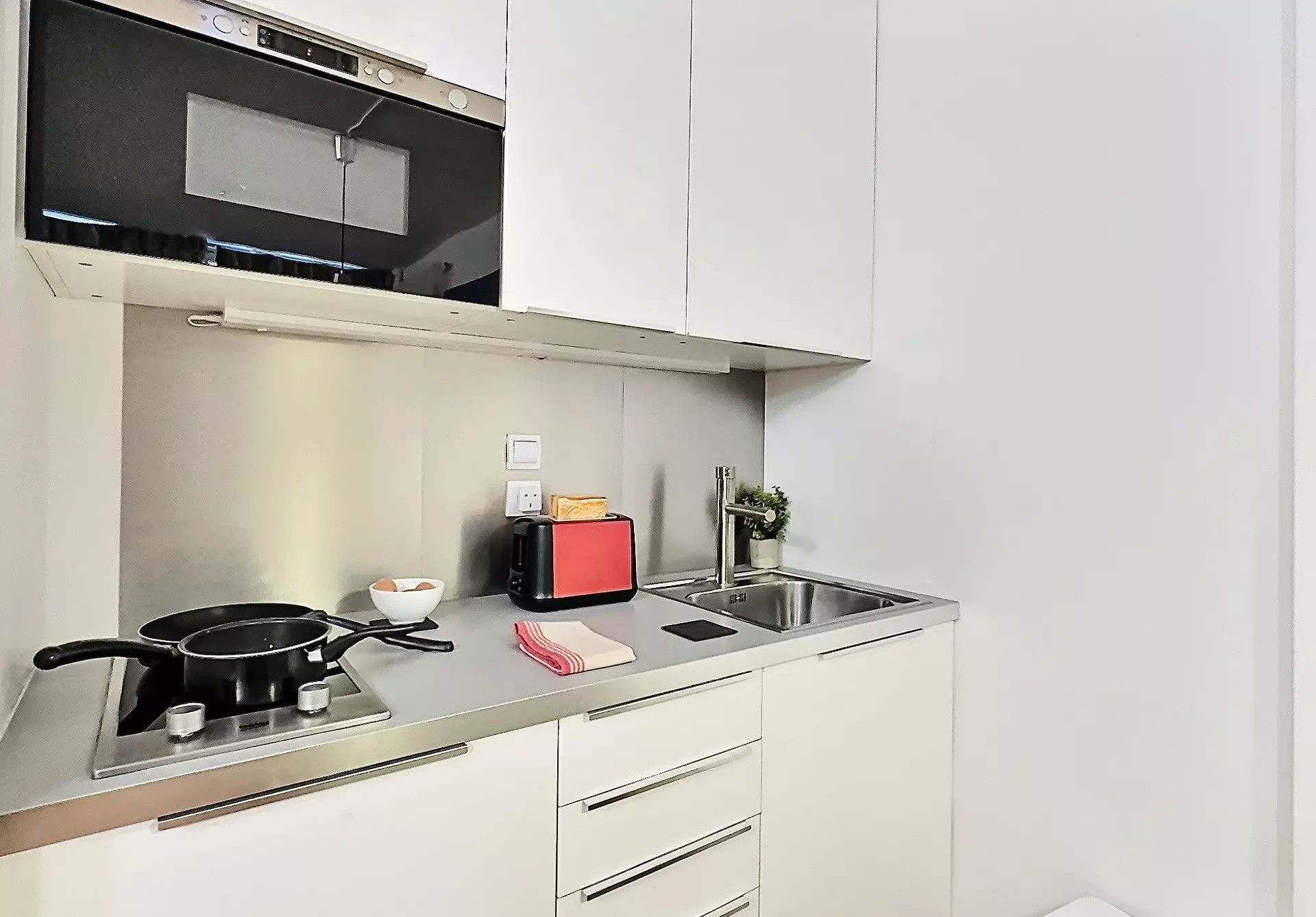 It is equipped with electric hotplates, a combined microwave oven and a refrigerator.