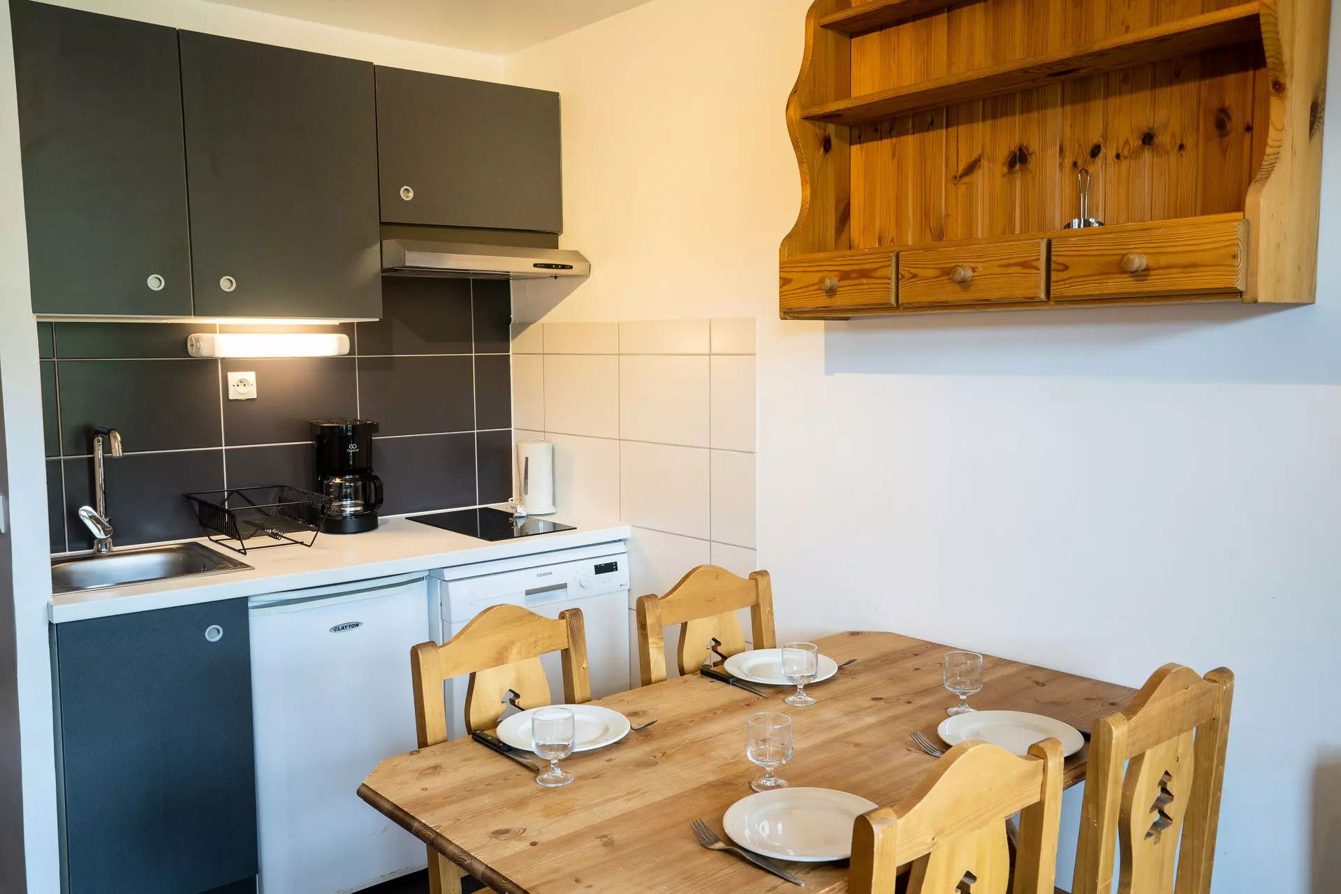 Kitchenette with oven, microwave, ceramic hob, refrigerator, dishwasher and extractor hood.