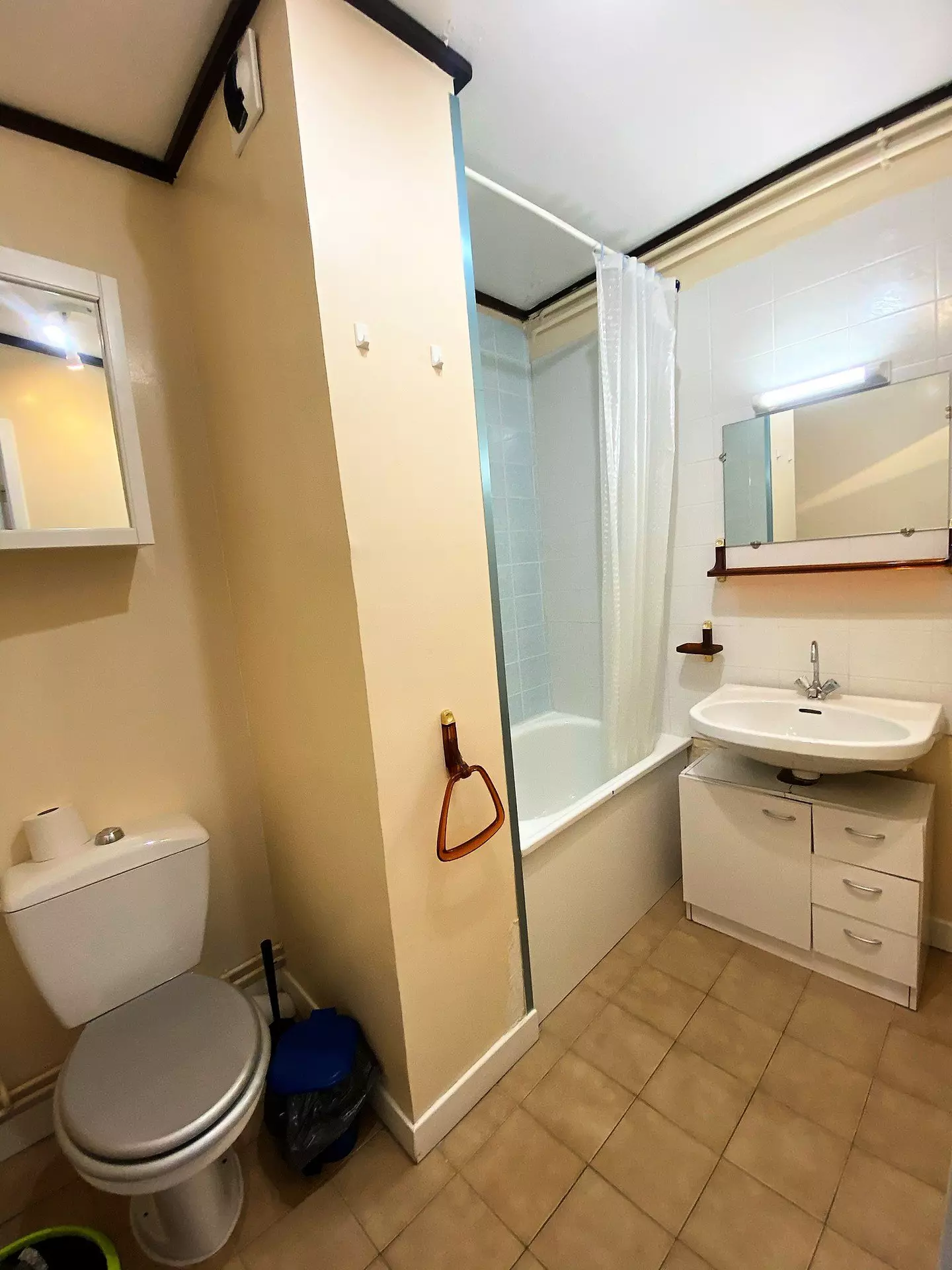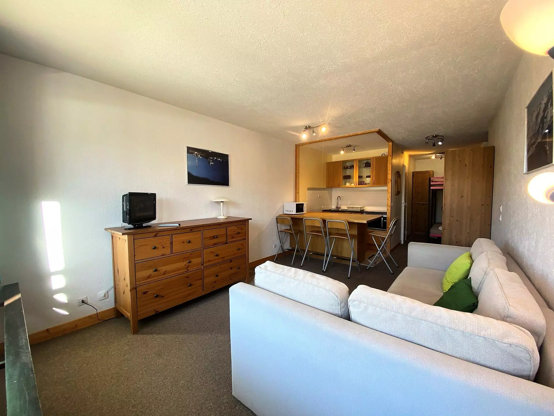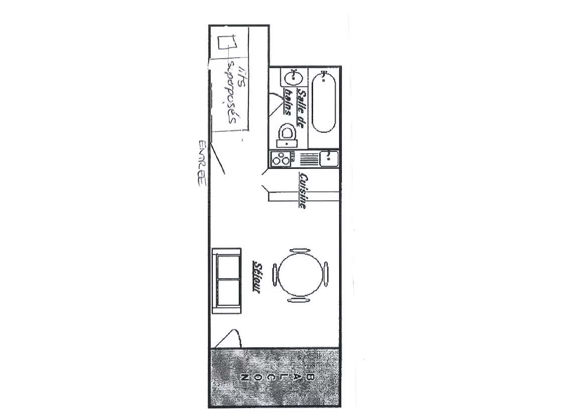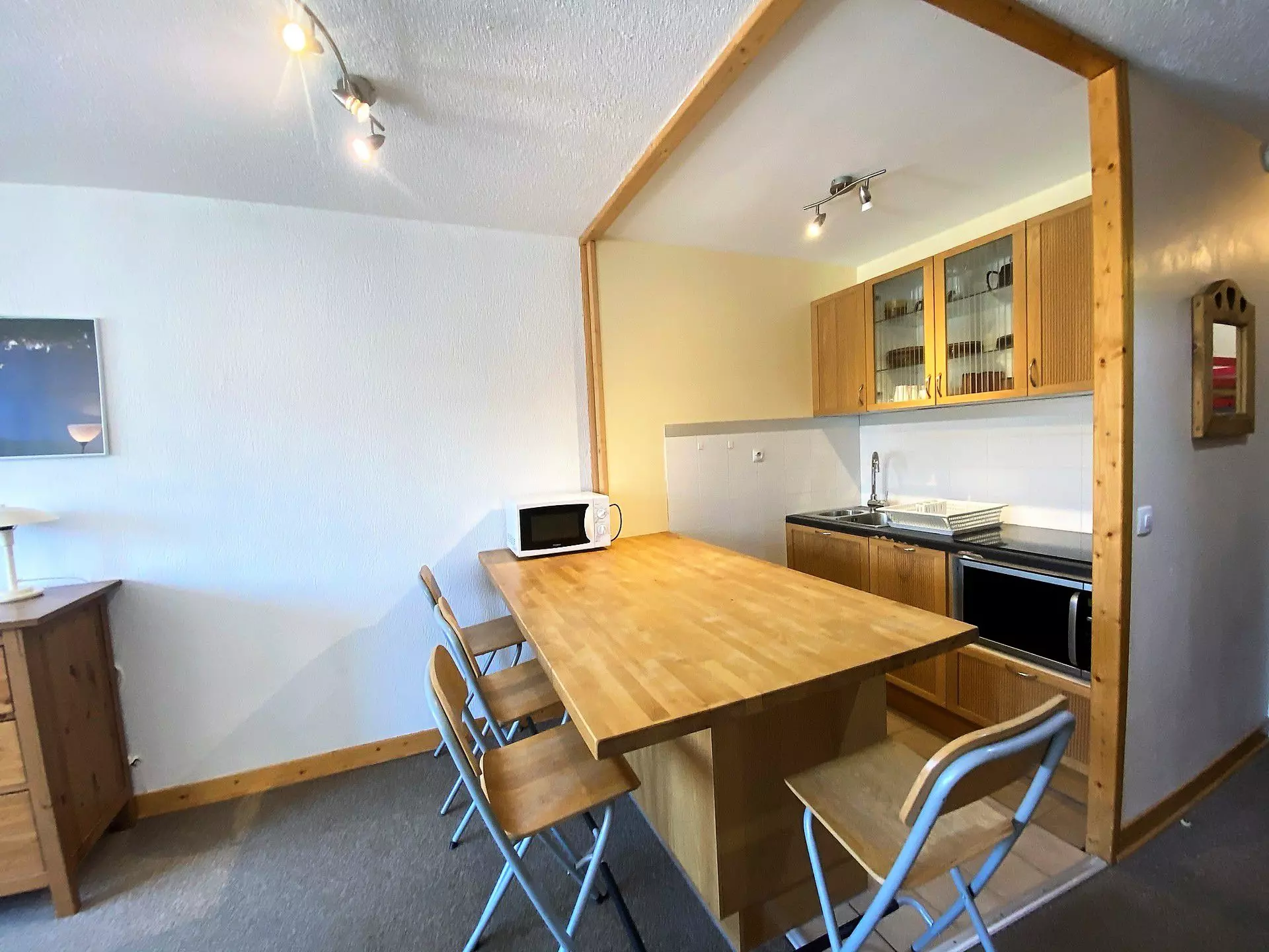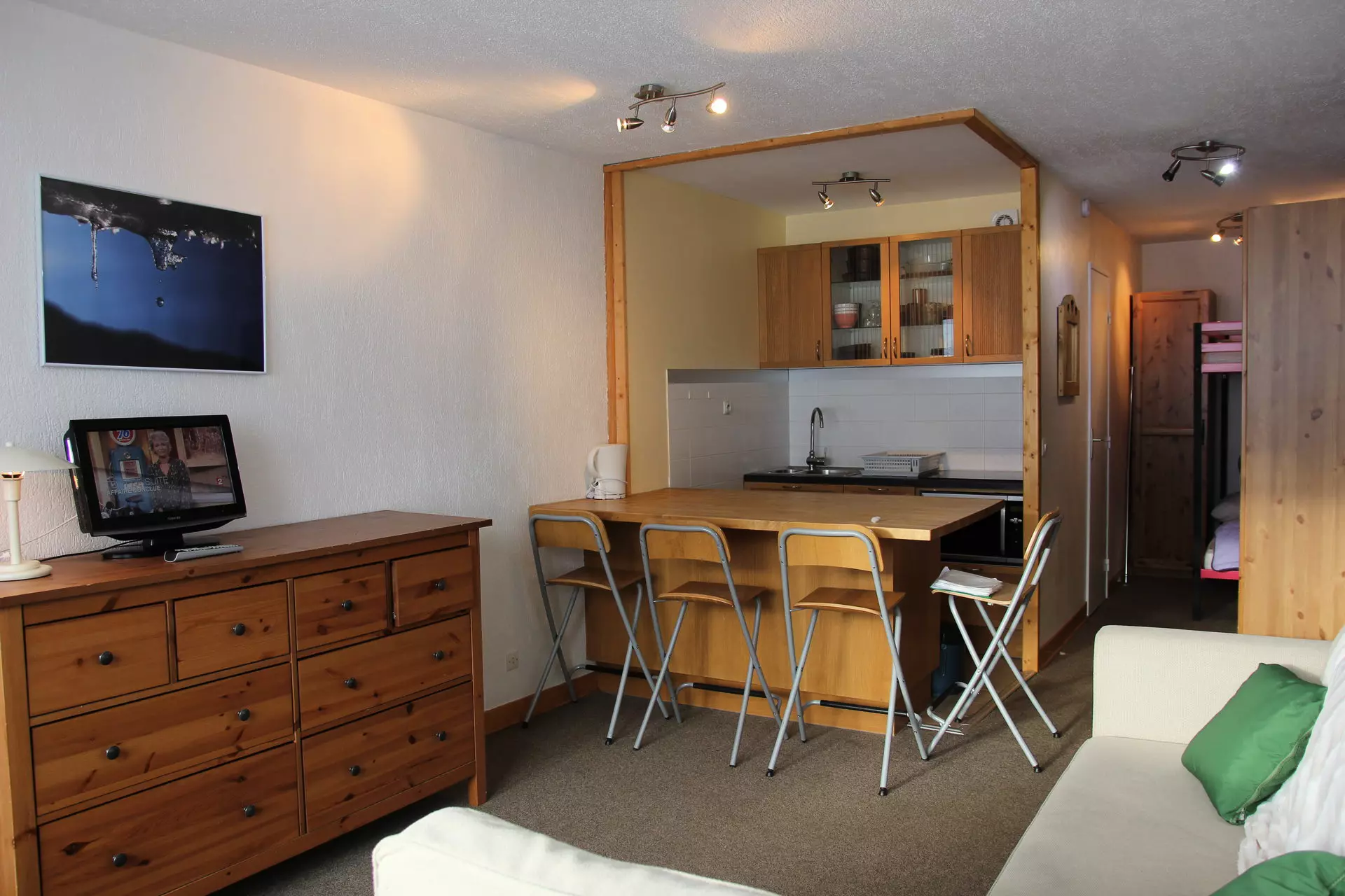 This studio of approximately 26m2, on level zero (on the second floor when you look at the residence from the slope), faces south.
