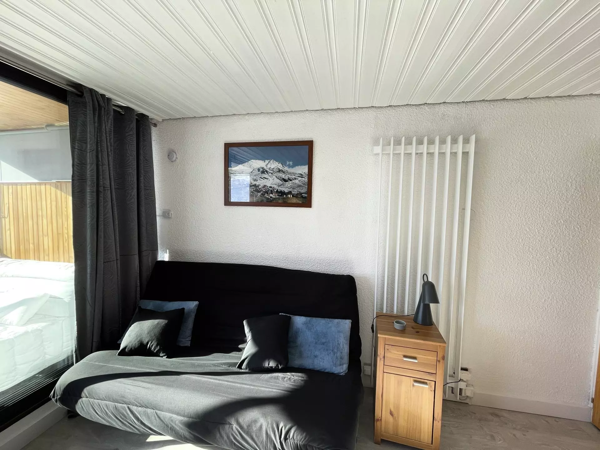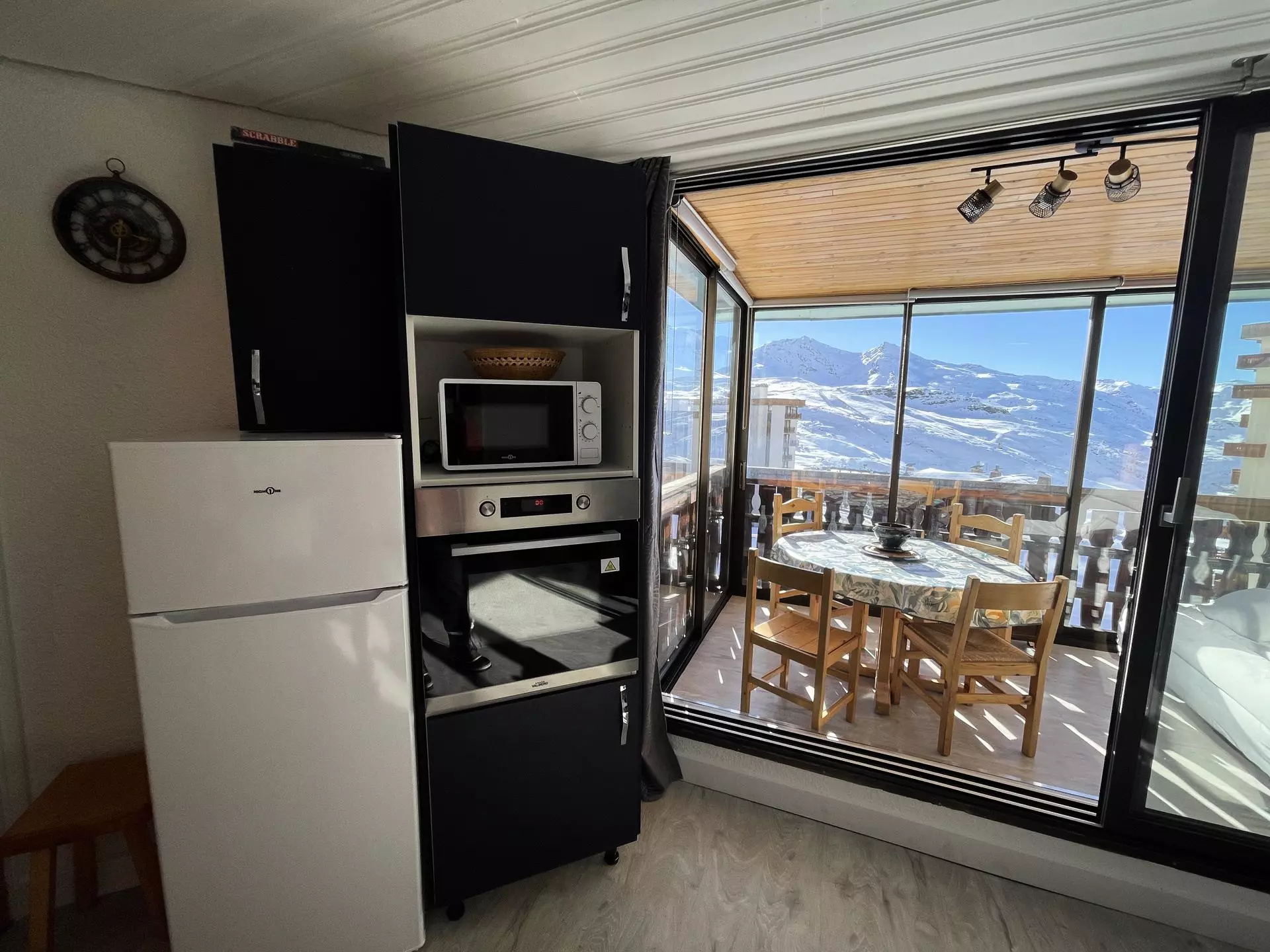 This studio of approximately 26m2 on the 5th floor with elevator has a balcony closed by a veranda facing southwest over the Val Thorens resort.