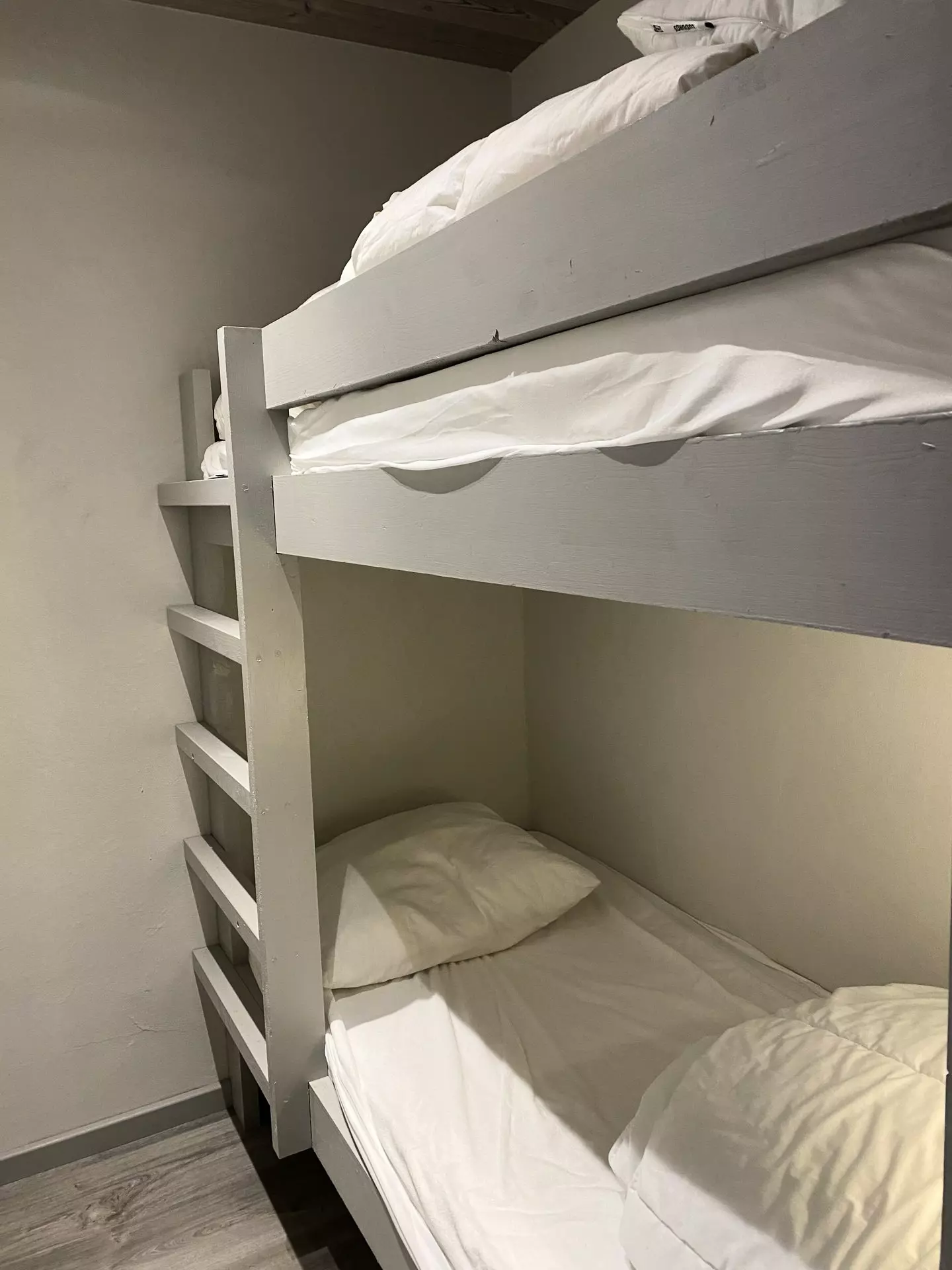 It has a sofa bed in the living room, and a sleeping area with 2 bunk beds.