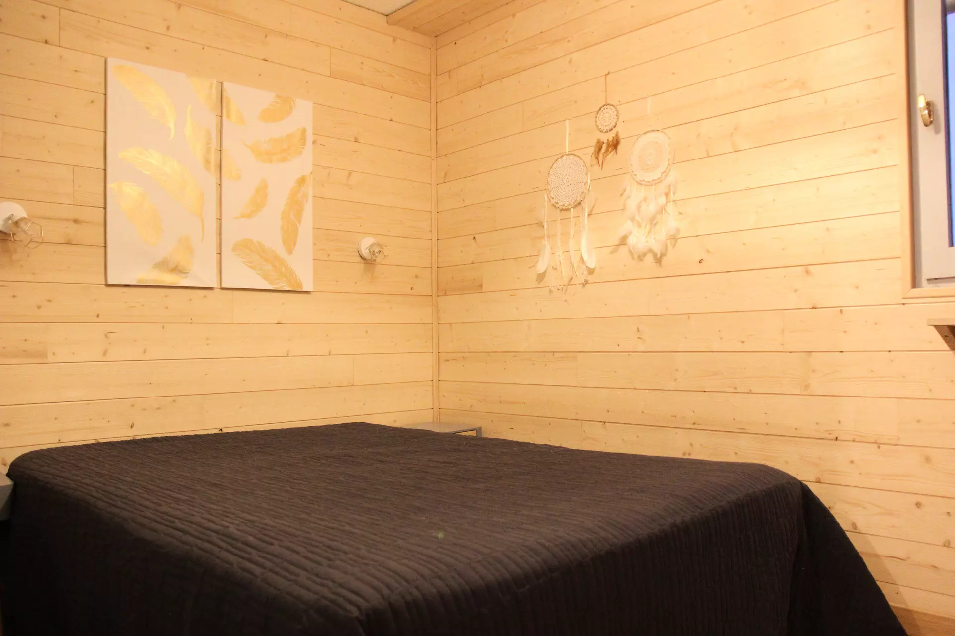 It consists of 1 bunk bed in the sleeping area, a double bed in the bedroom and a sofa bed in the living room.