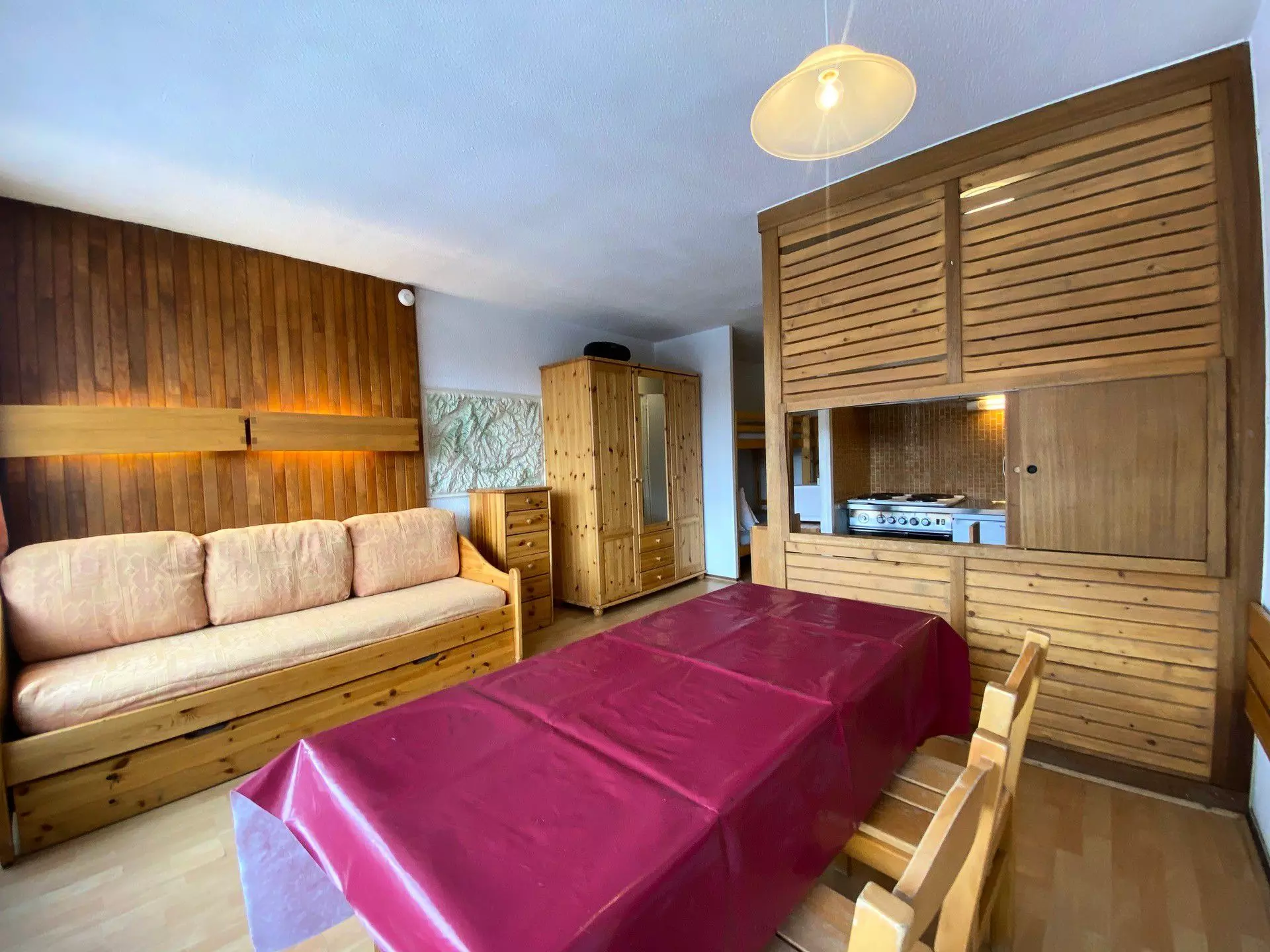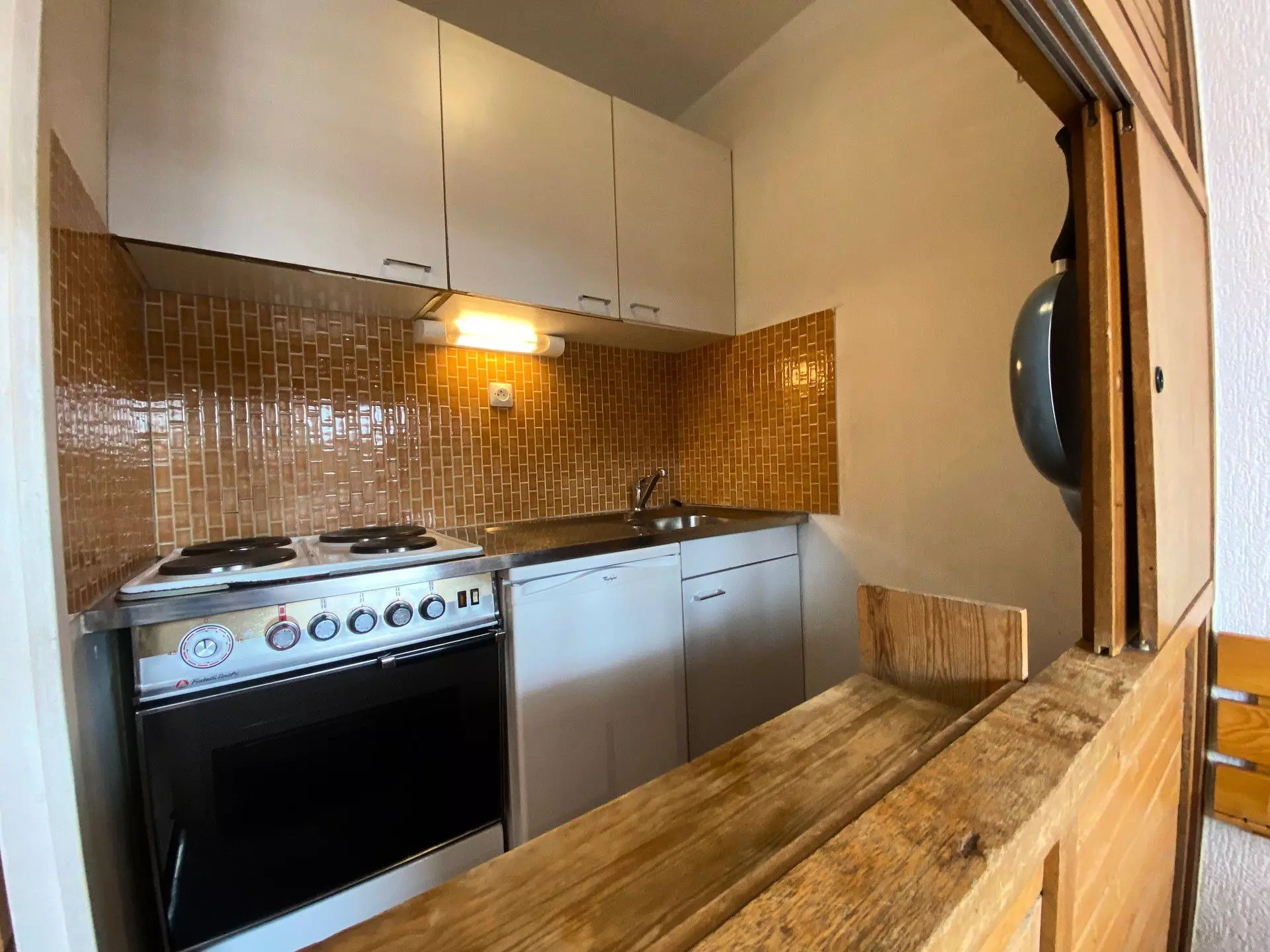 The kitchen, separated from the main room by a partition with small doors that you can open, is equipped with an oven but without a dishwasher.