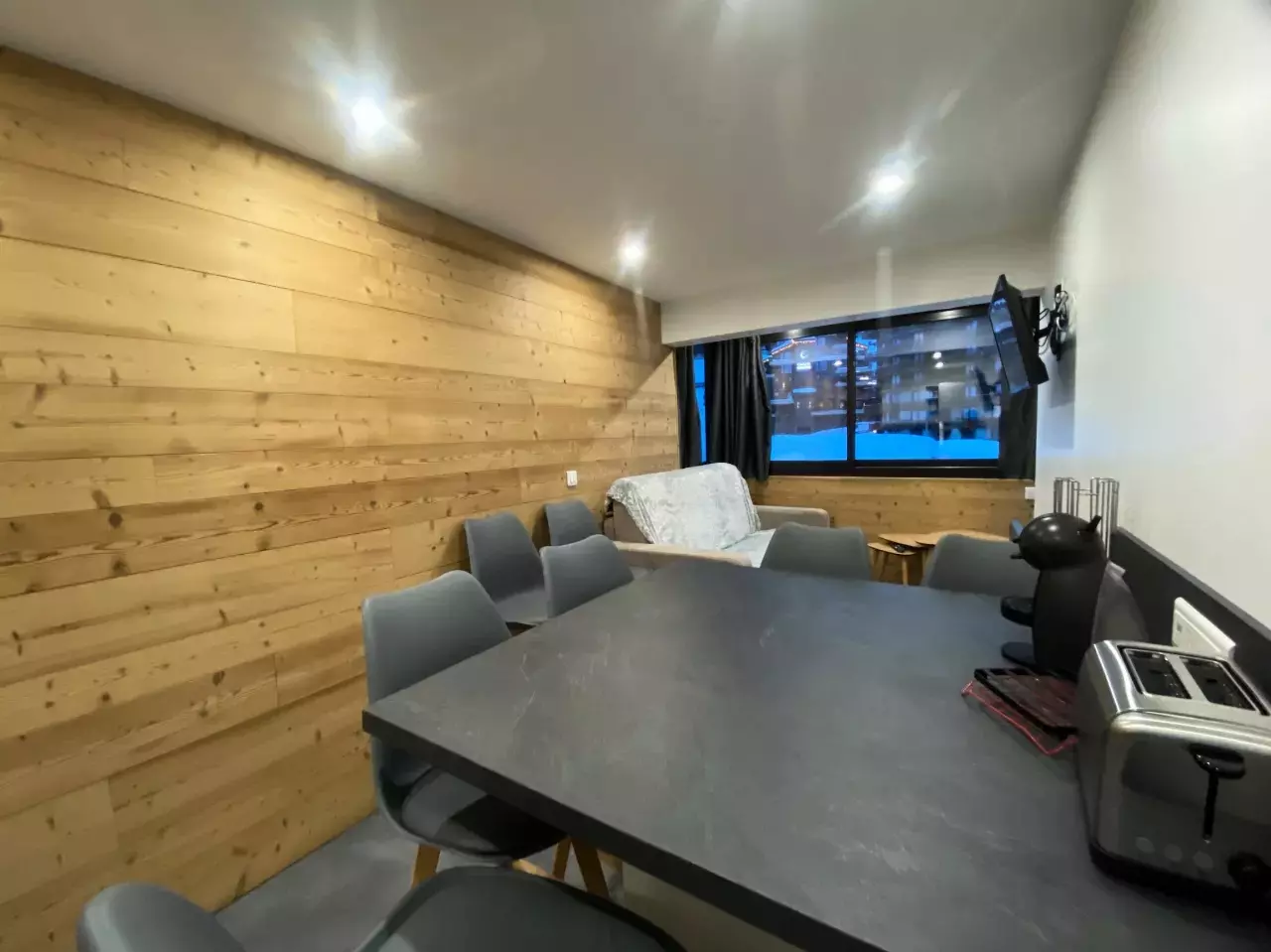 The studio has a sofa in the living area and two double bunk beds in the sleeping area.