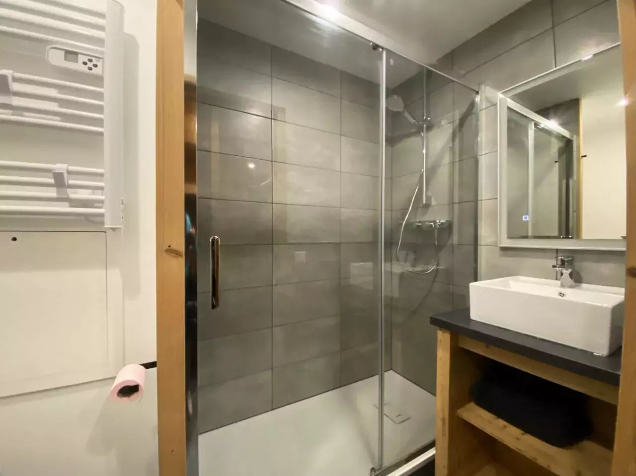 The toilet is in the shower room.