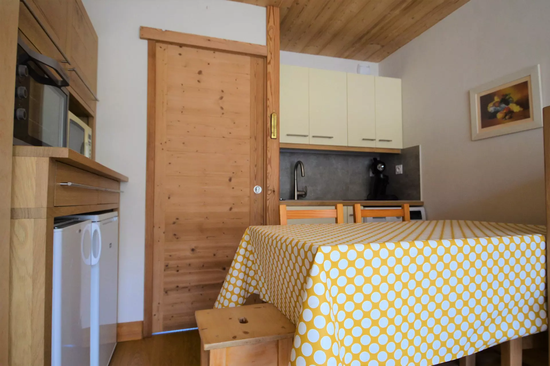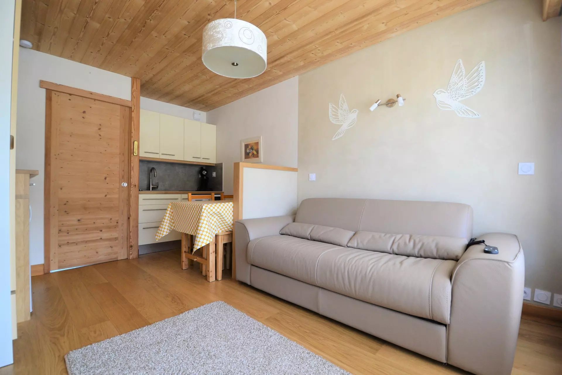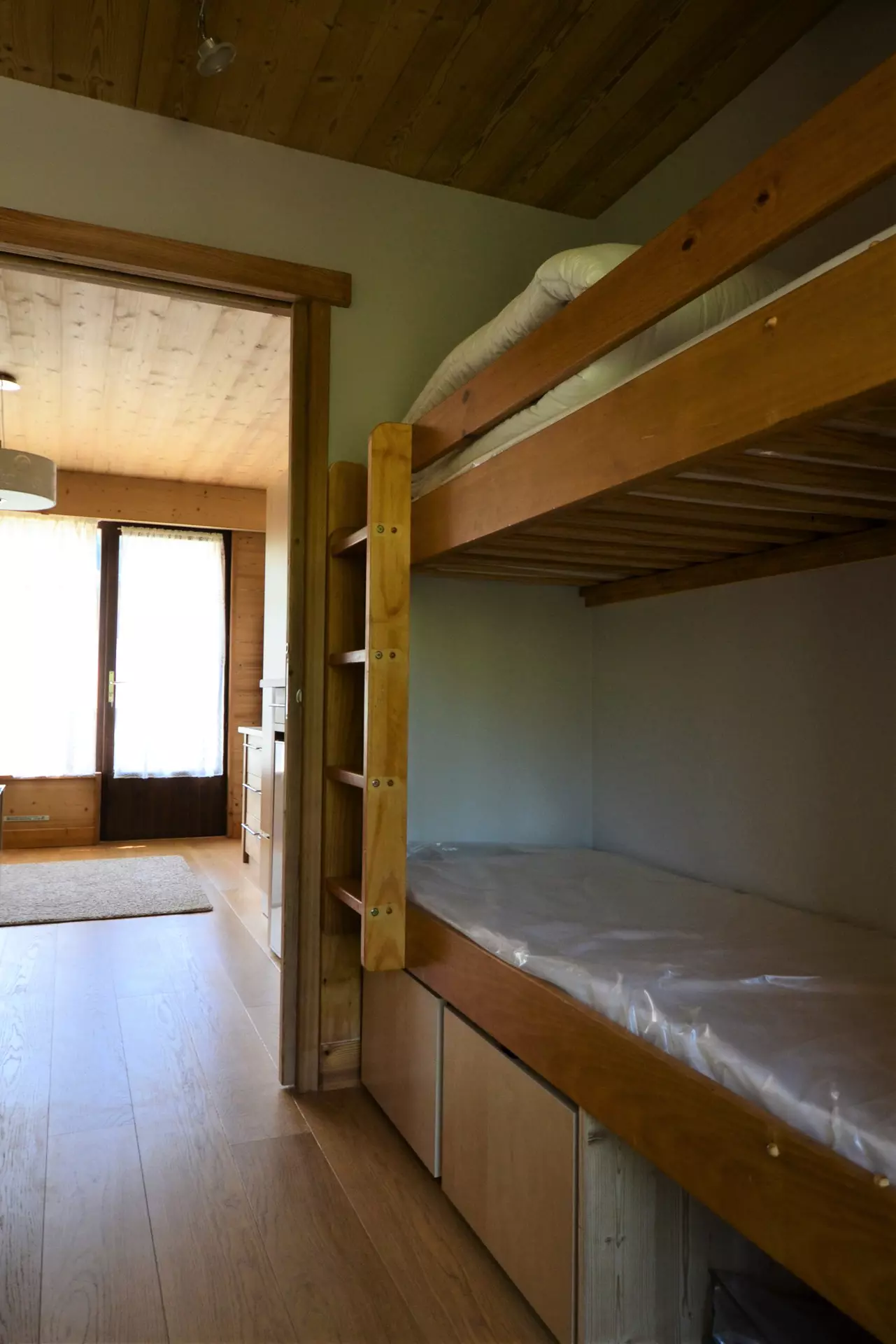- Sleeping arrangements: main room with a convertible sofa bed with electric control (160), mountain corner with bunk beds (2*70). Bedding equipped with duvets.