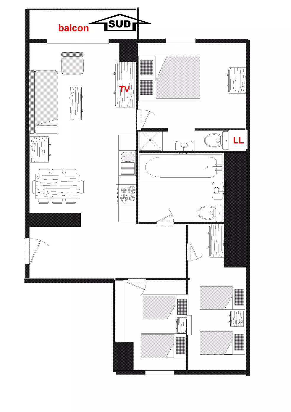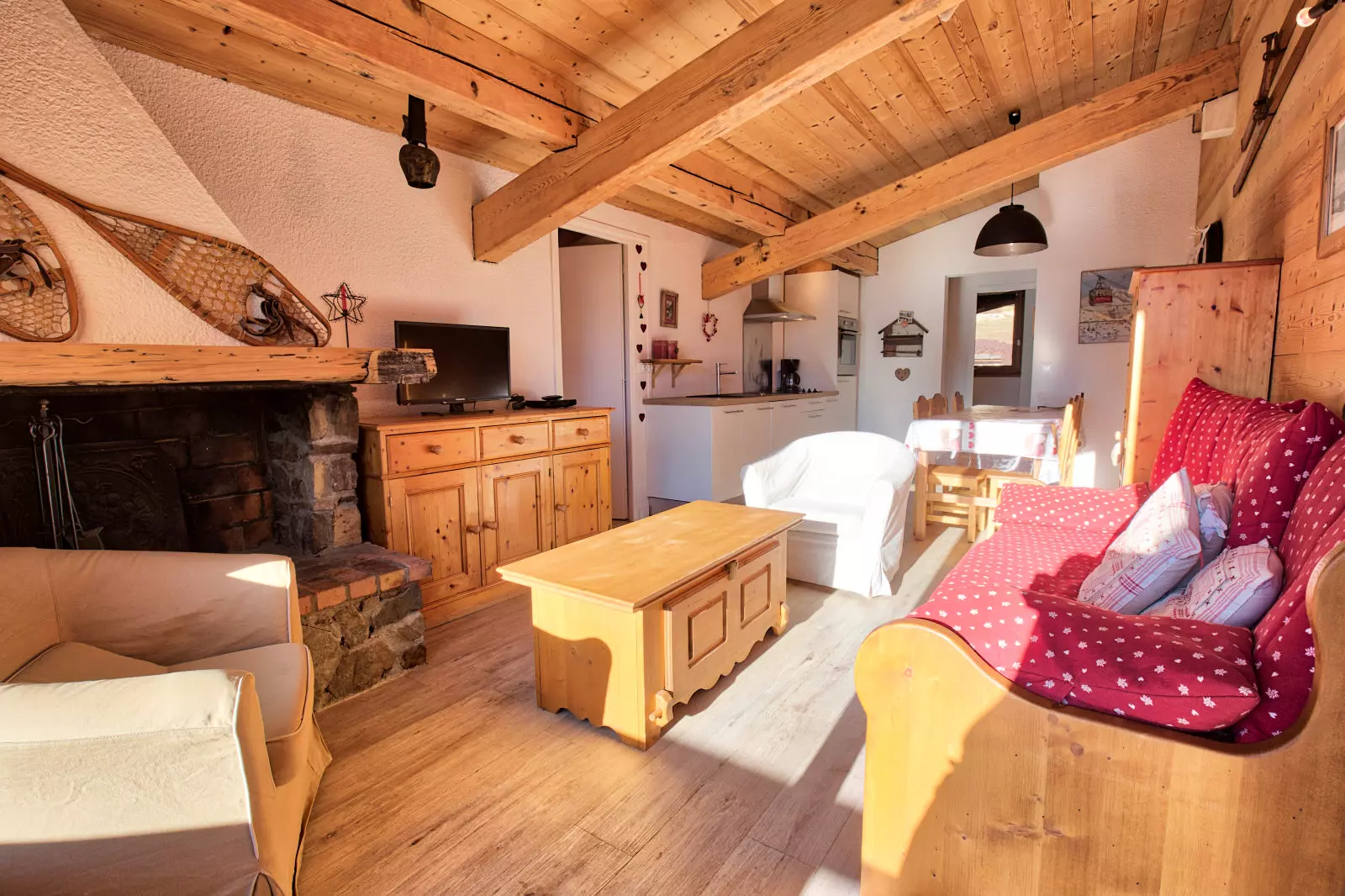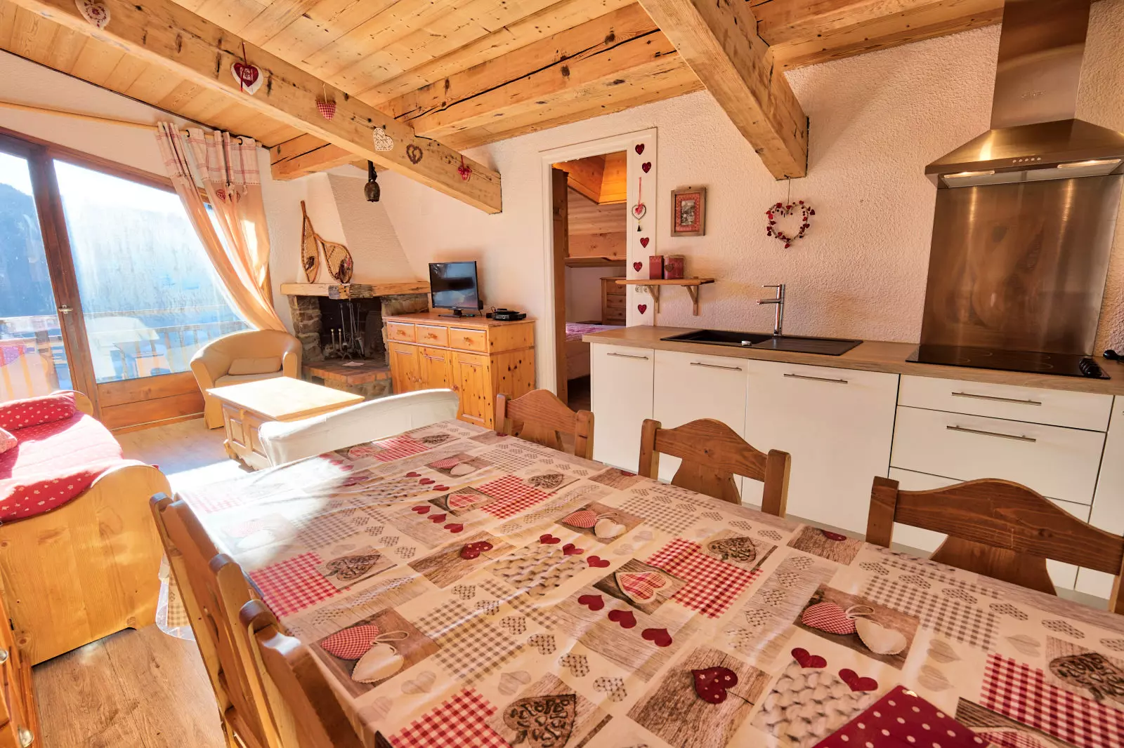 Beautiful apartment at the summit of Mont Lachat for eight travelers, with a surface area of 53 m² + 23 m² under 1.80 m. Located on the second floor with a south-facing balcony and exceptional views of the valley and the Mont Rond massif.