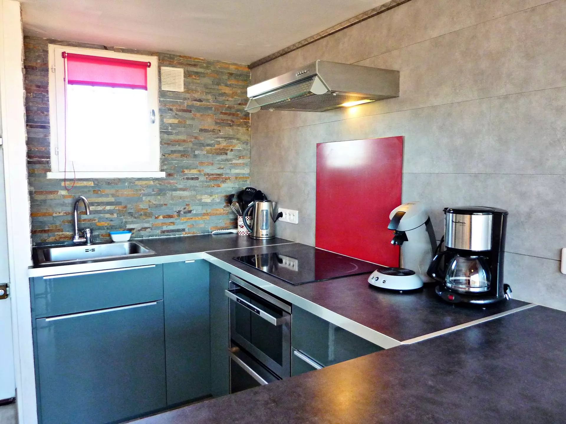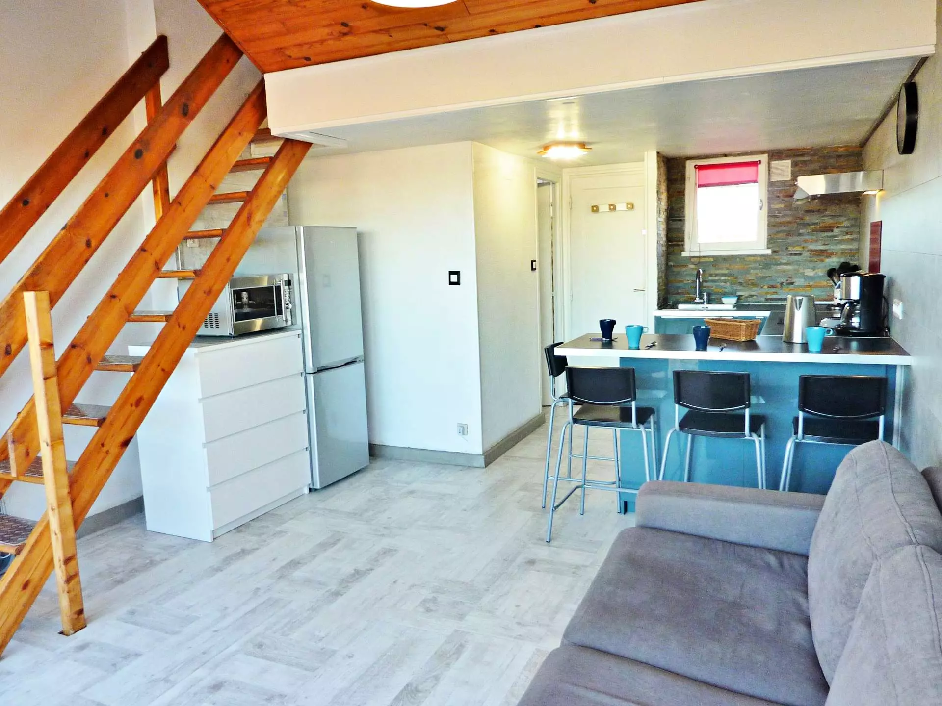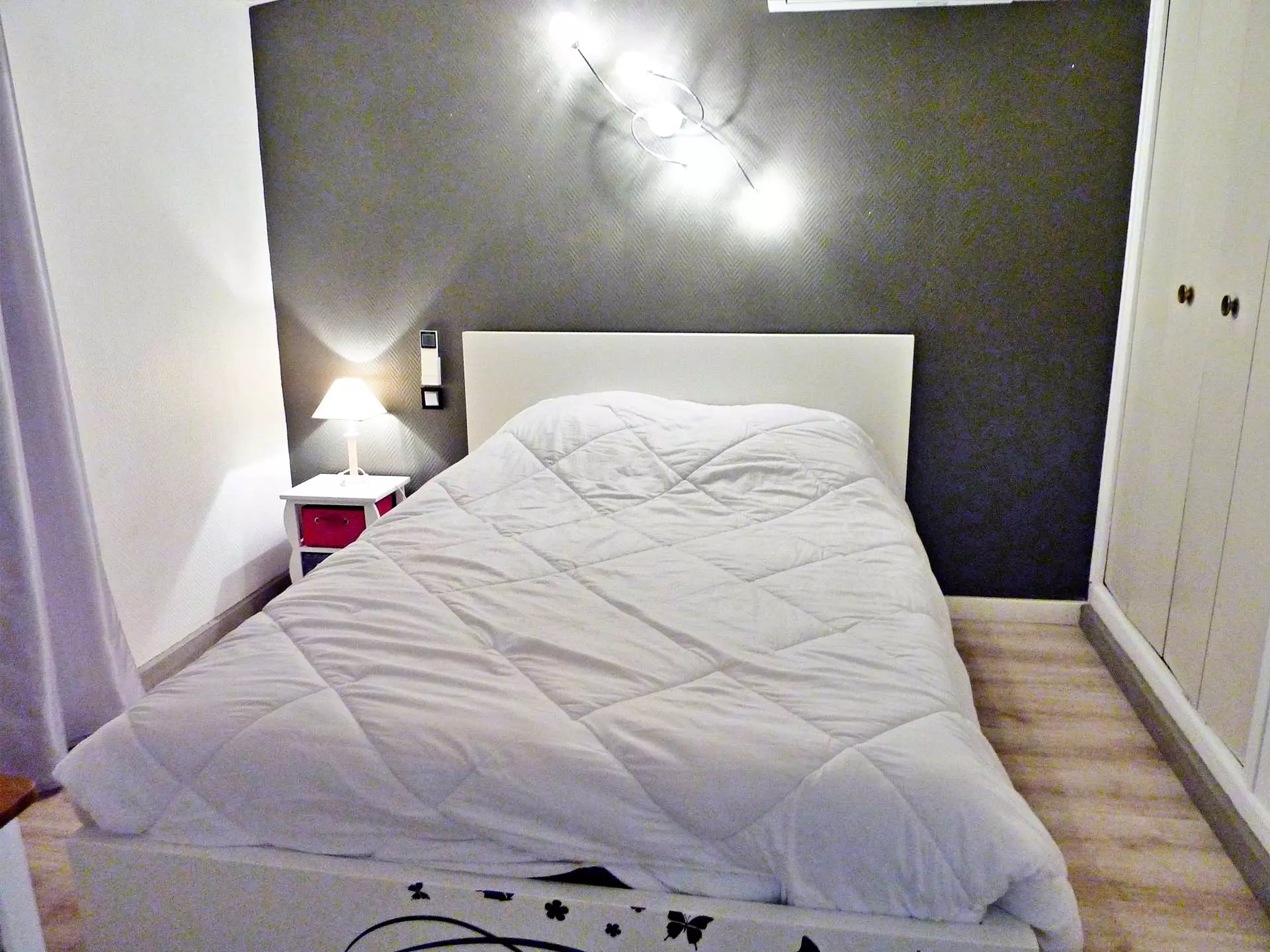 The living room features a sofa bed, a TV, and air conditioning for optimal comfort. The open kitchen is fully equipped: ceramic hob, refrigerator/freezer, extractor hood, microwave, oven, dishwasher, electric coffee maker and Senséo, toaster, kettle, and an island with stools for your convivial meals. The bathroom has a shower, sink, and washing machine. Upstairs, you'll find a spacious bedroom with a double bed, a TV, large closets, and air conditioning. The toilet is separate for added convenience.