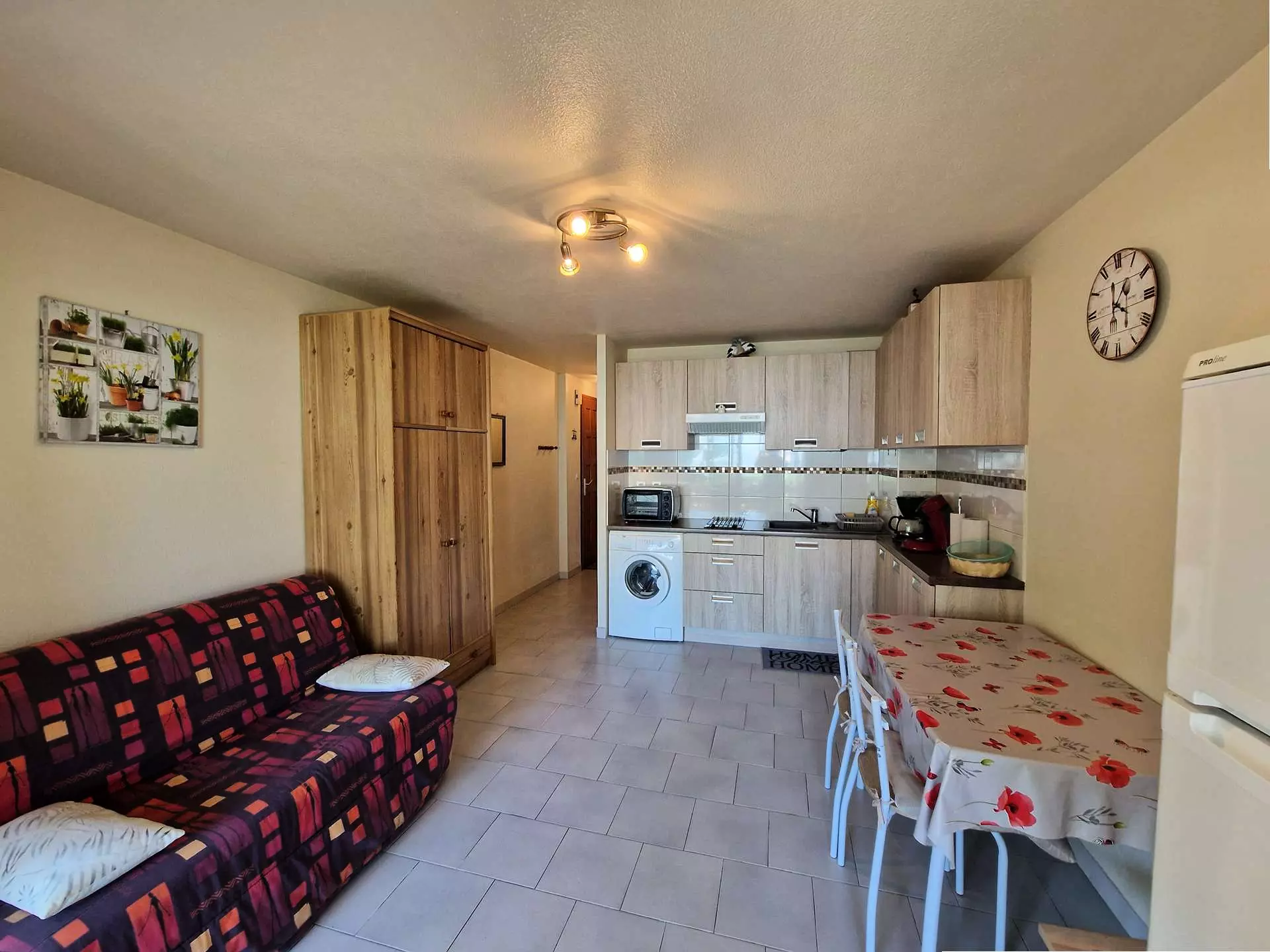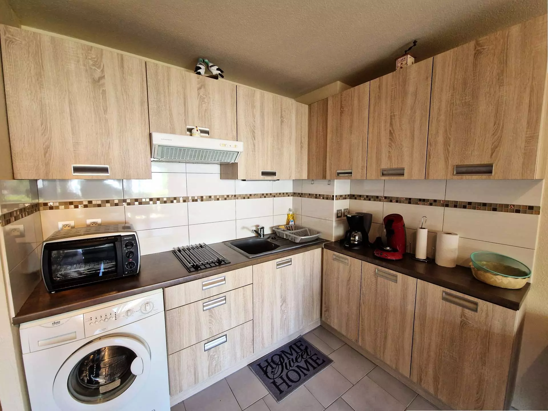 Fully equipped kitchen with hob, microwave, mini-oven, electric coffee maker, fridge/freezer and washing machine.
