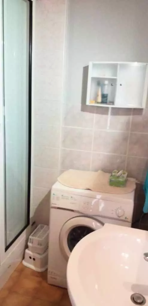 Functional bathroom: The bathroom includes a shower, sink, and washing machine. The toilet is separate for added comfort.