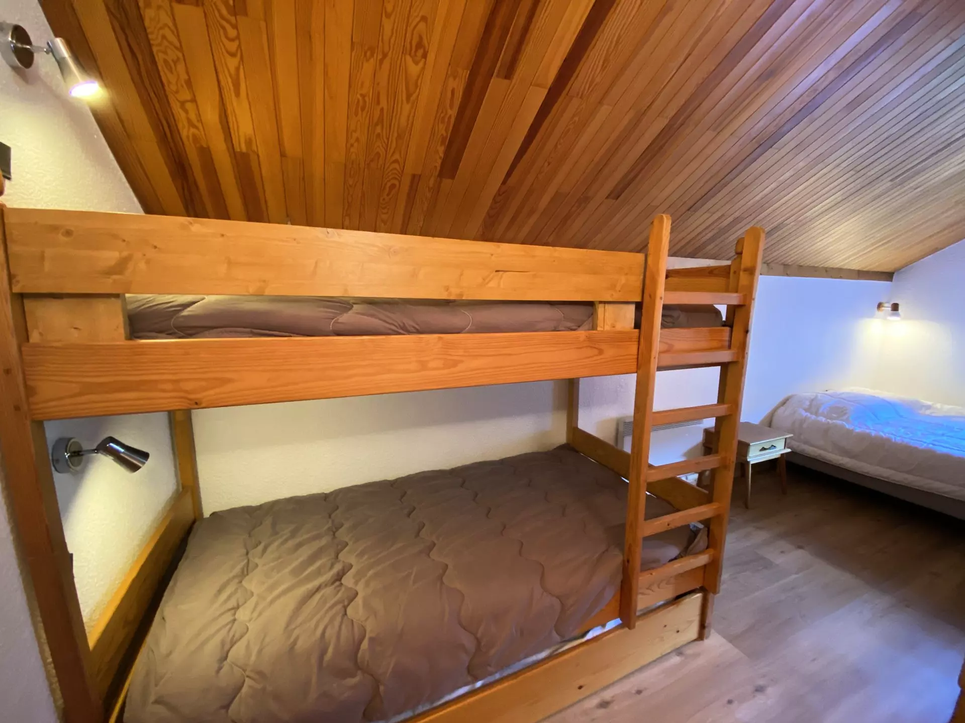 Upstairs with 1 double bed (160 cm) and a set of bunk beds (80 cm), this room is at the top of the stairs, it is not closed (mezzanine type).