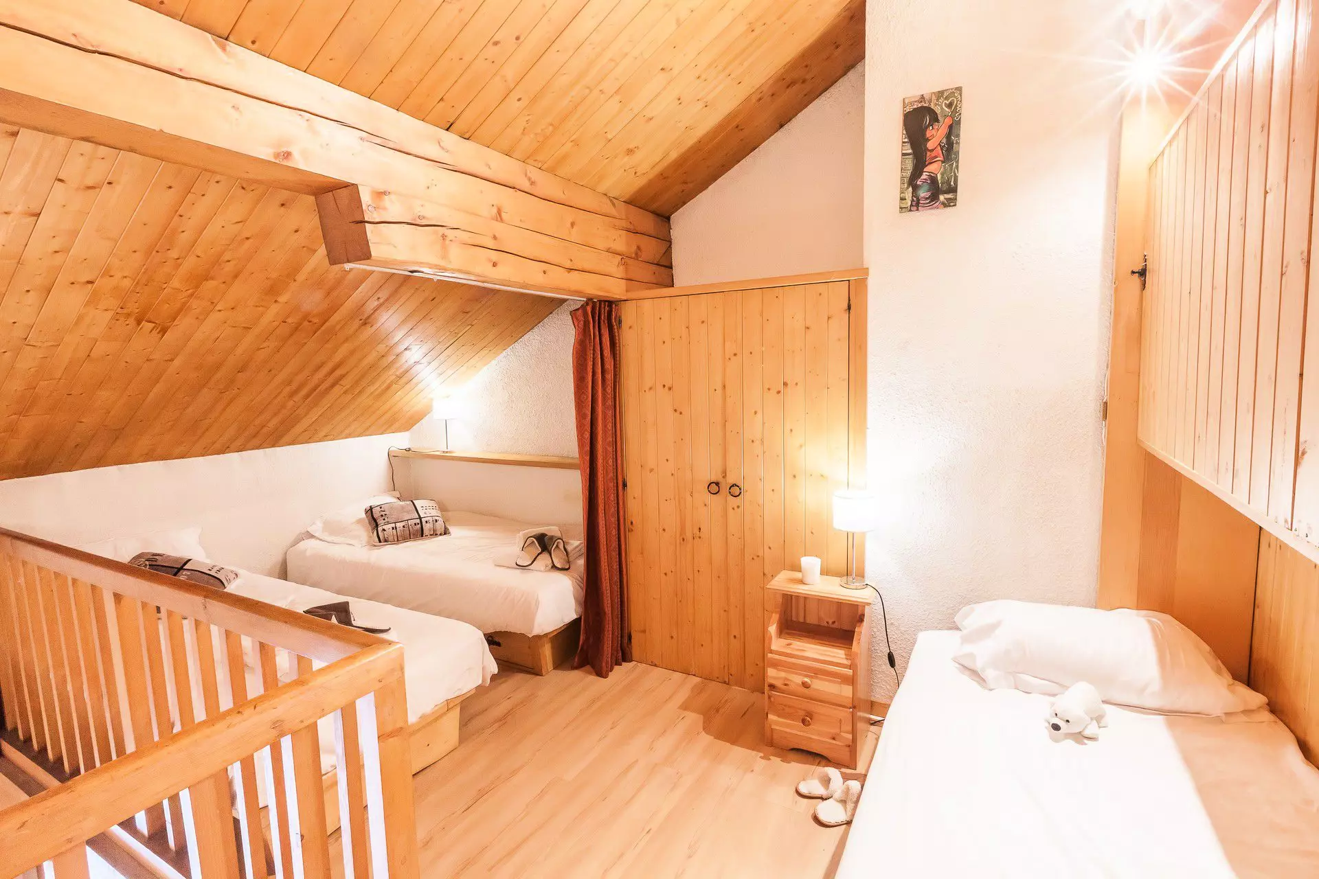 A bedroom with a double bed (140 cm). A mezzanine with 3 single beds (90 cm) that can accommodate 3 people. Under the stairs, a bed is available for one person (90 cm).
