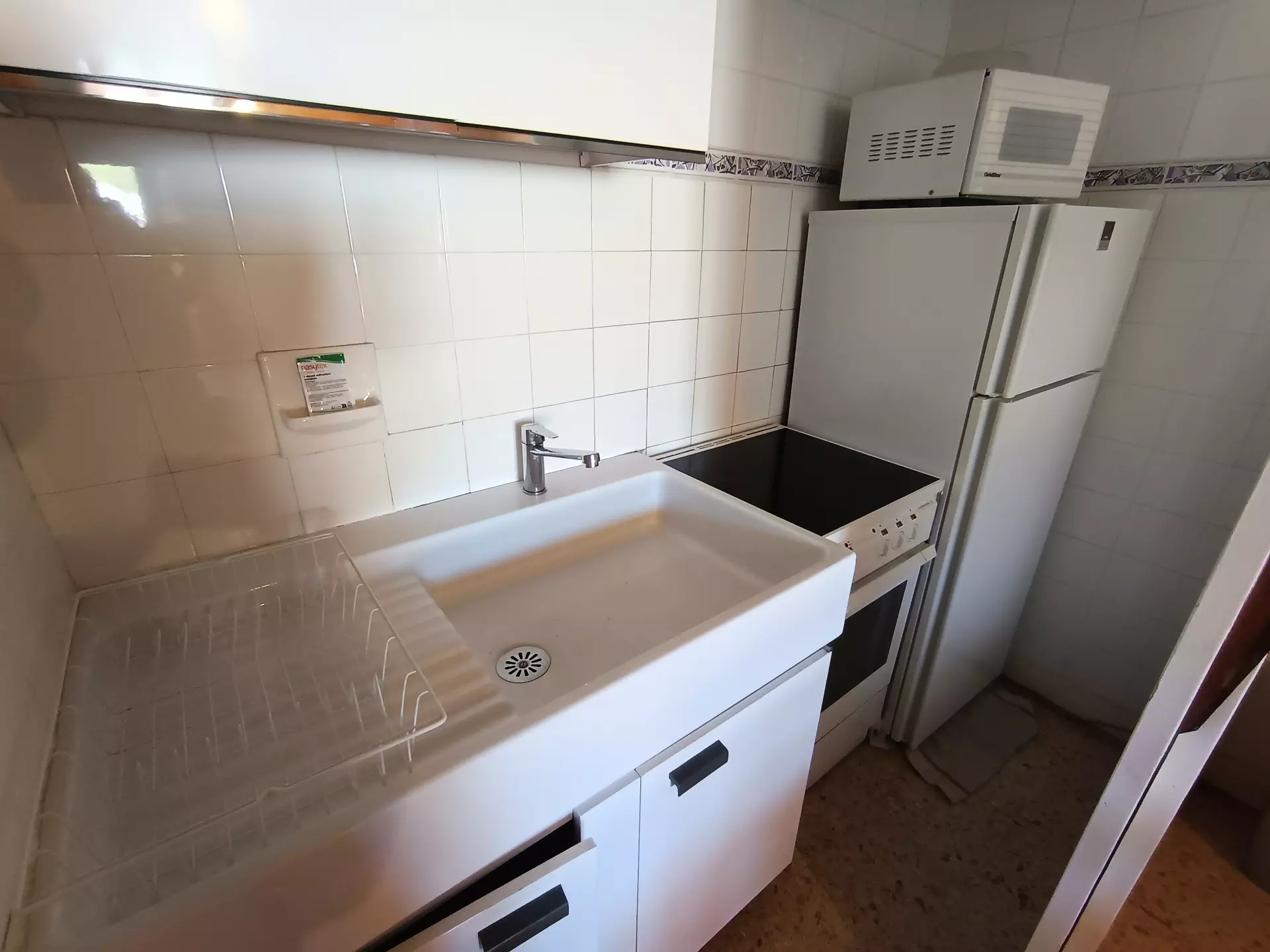 Kitchen area: Stove with 4 ceramic hobs, microwave, fridge with freezer compartment, coffee maker, toaster, kettle.