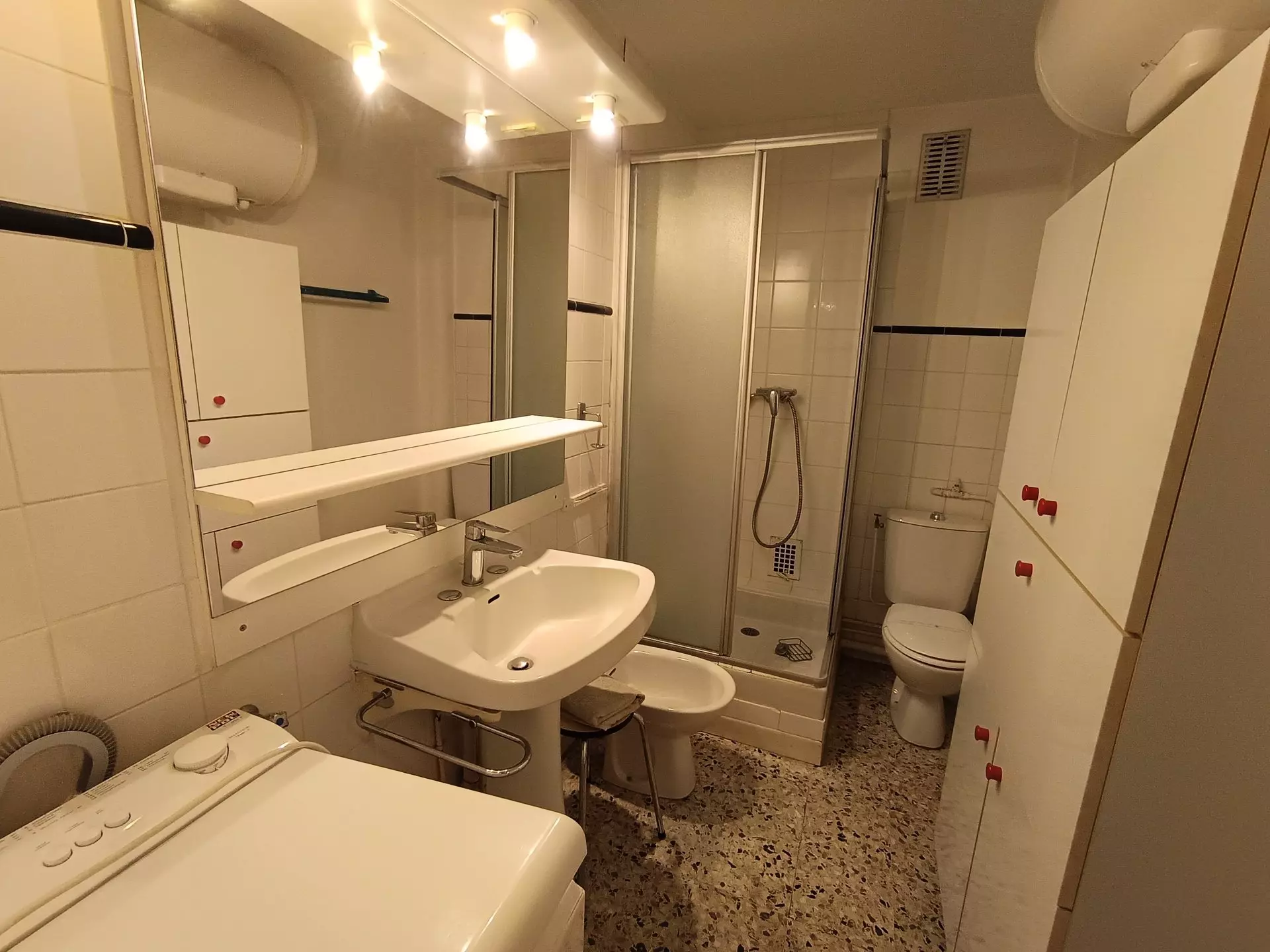Bathroom: Shower, toilet, bidet, sink and washing machine
