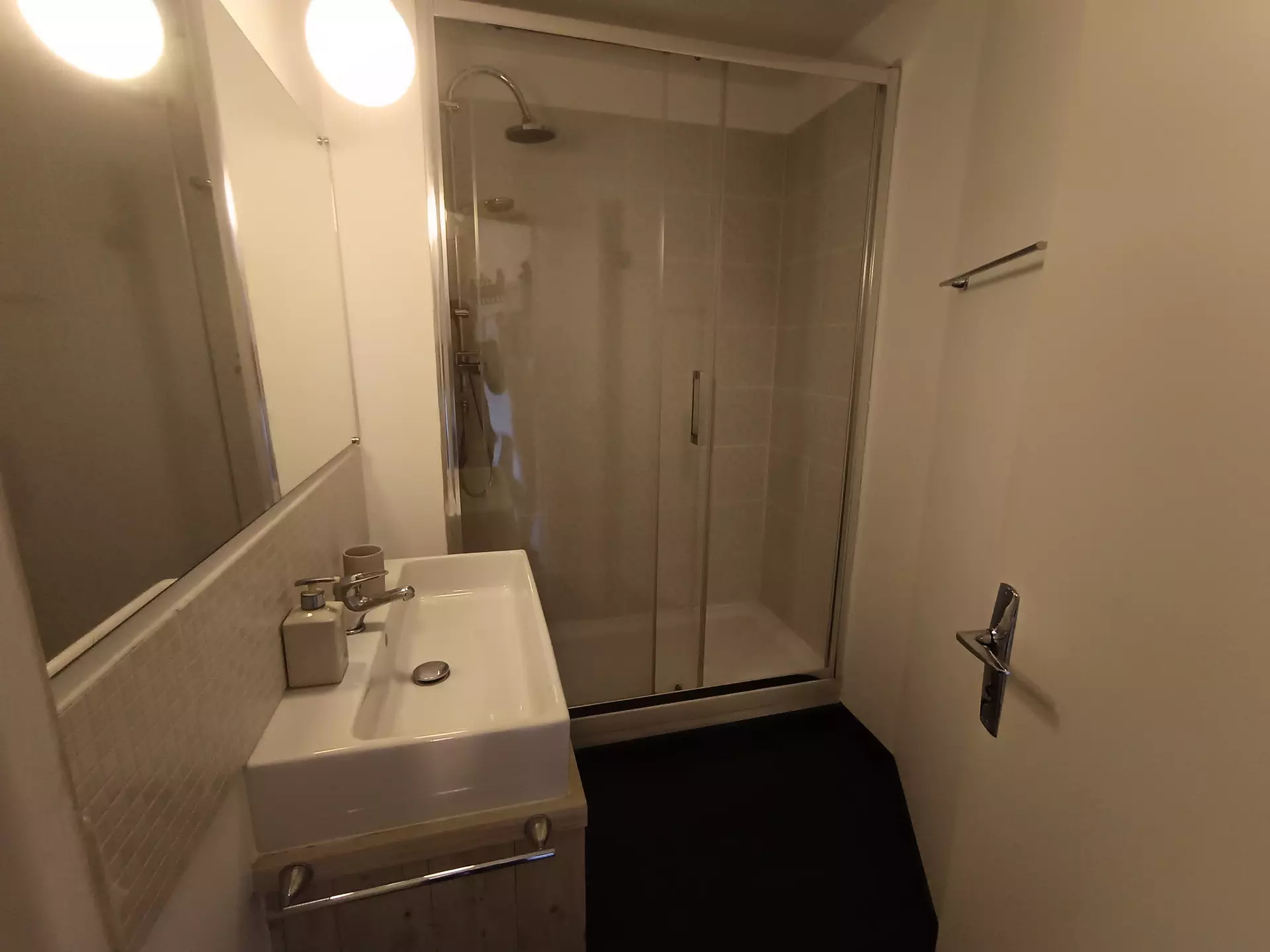 Shower room: Shower cubicle with shower screen, vanity unit with sink, towel rack, large mirror.